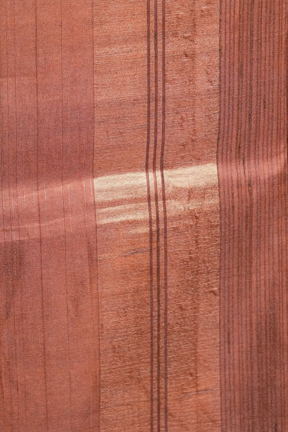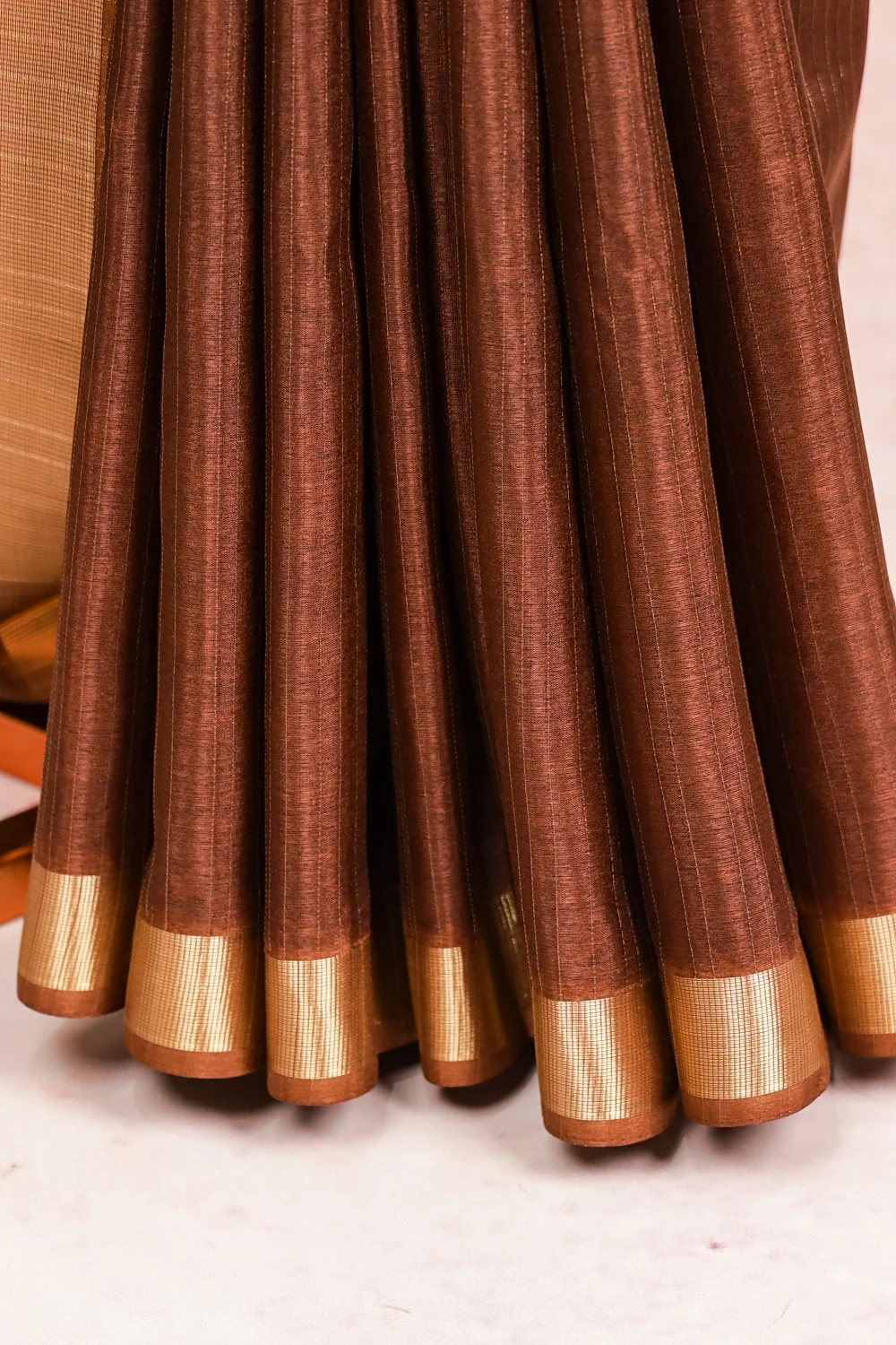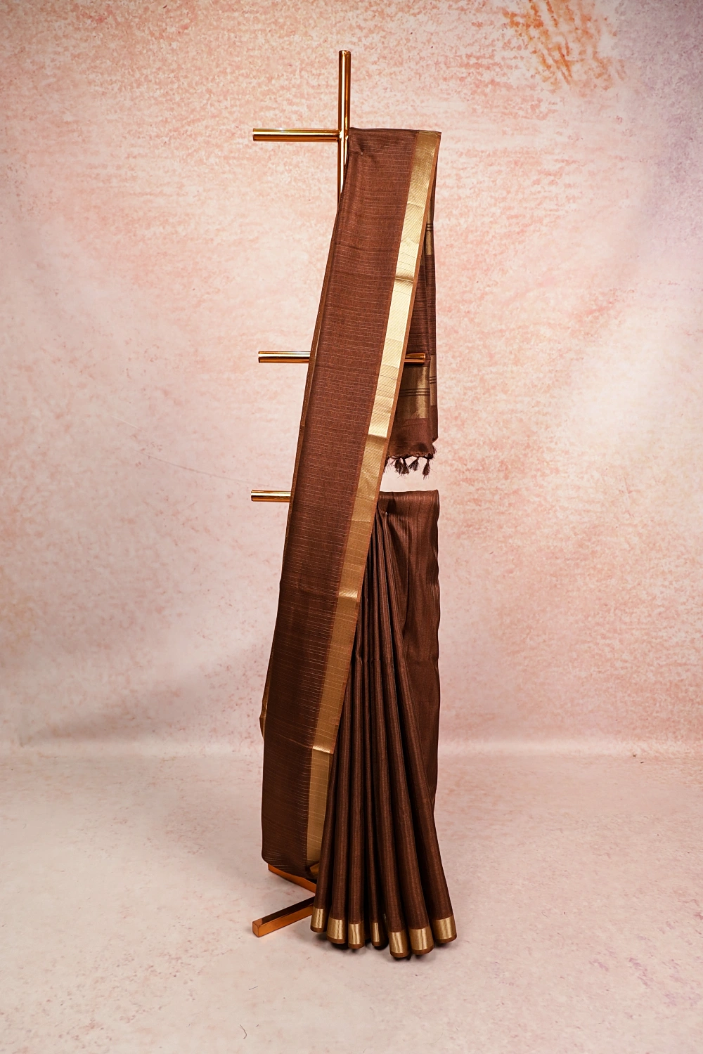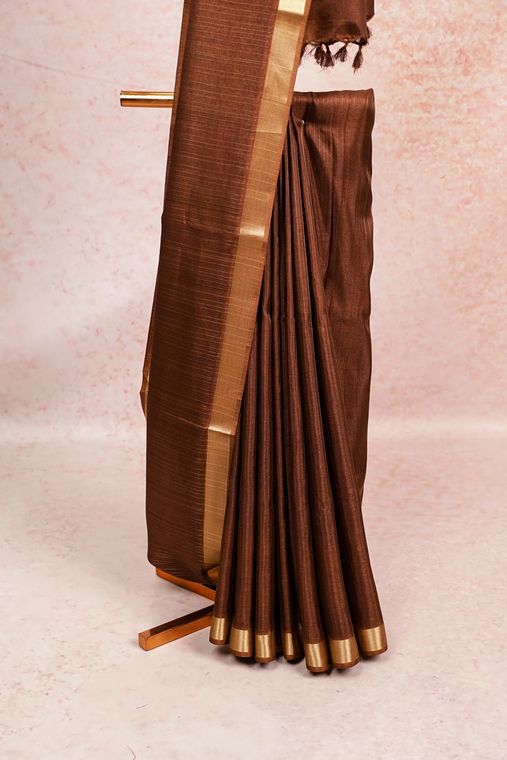 Coffee Colour Semi Tussar Lines Saree With Golden Border. Includes Unstitched Blouse