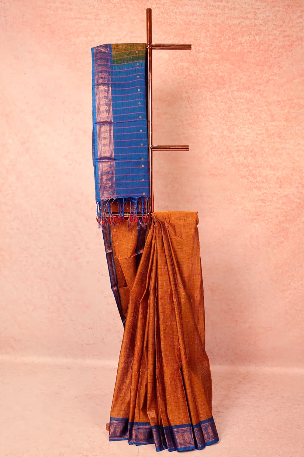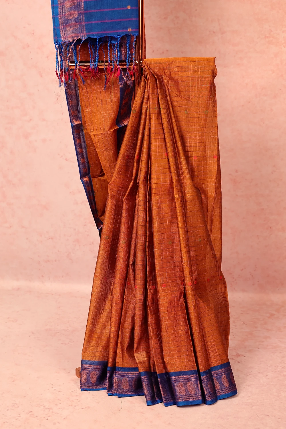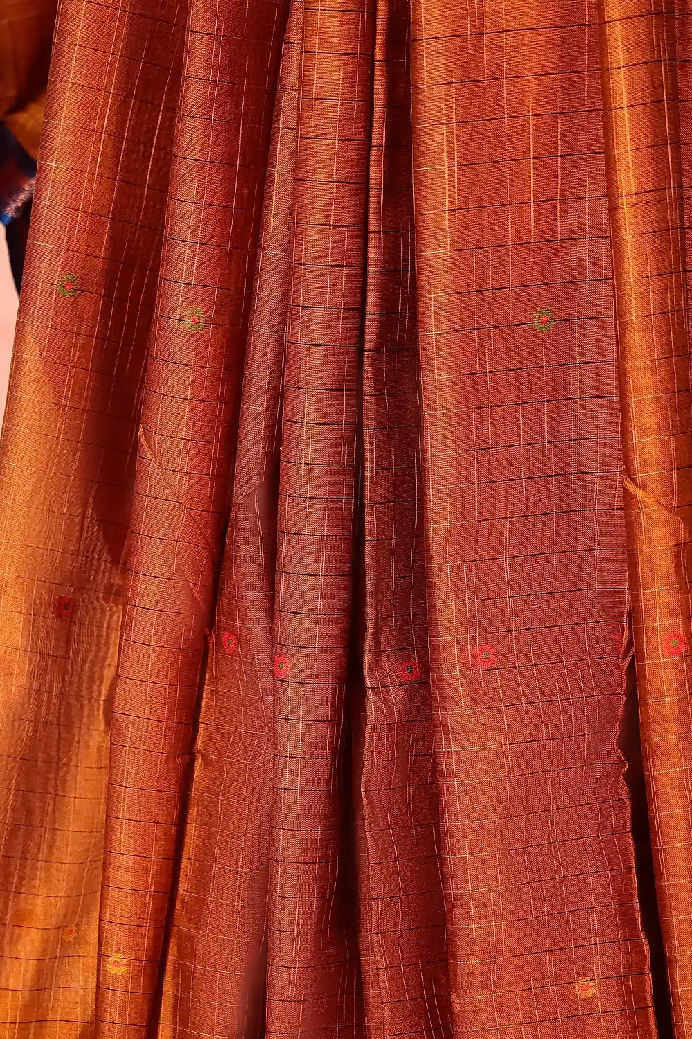 Copper Cotton Check With Butta Saree with Designer border. Includes Unstitched Blouse