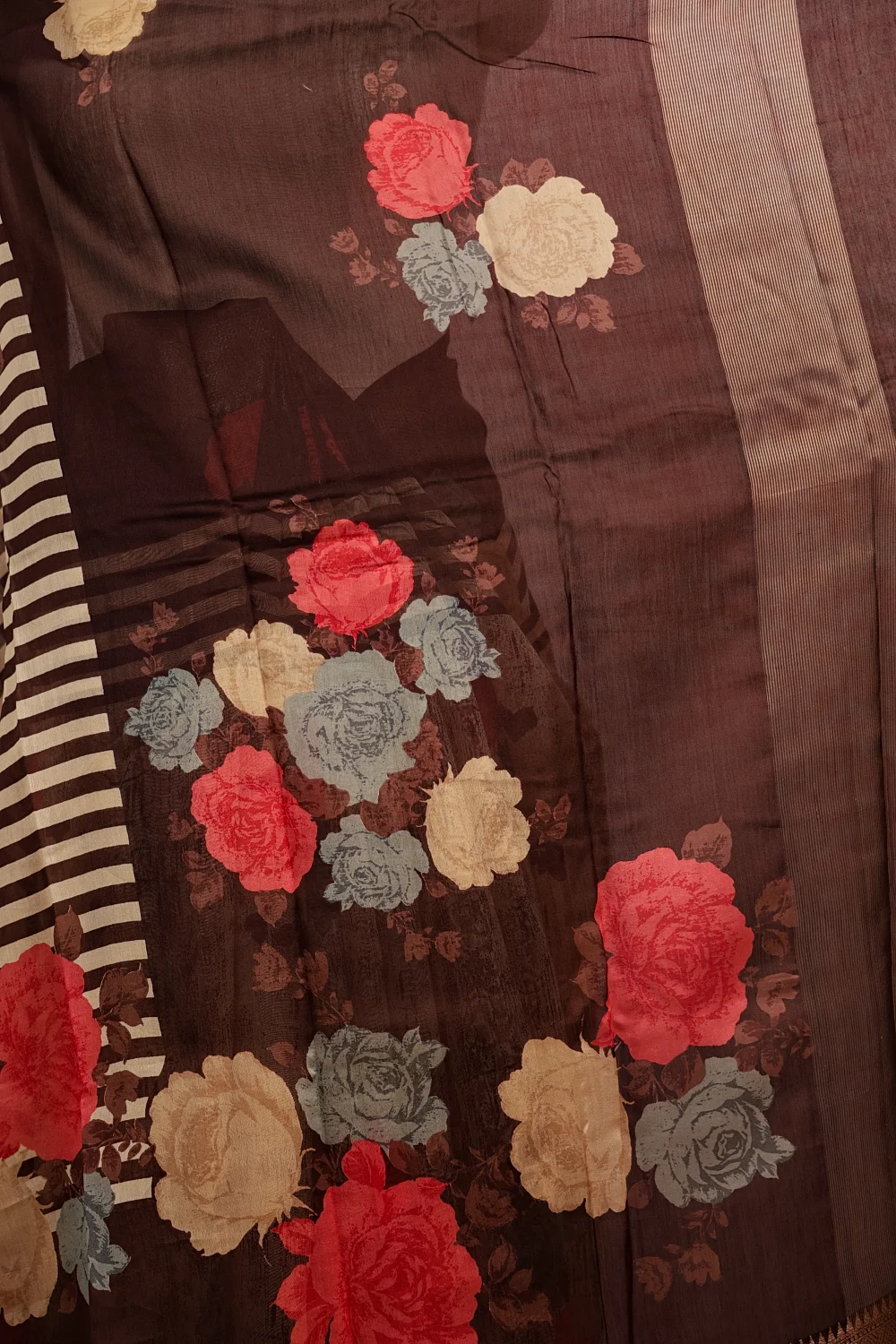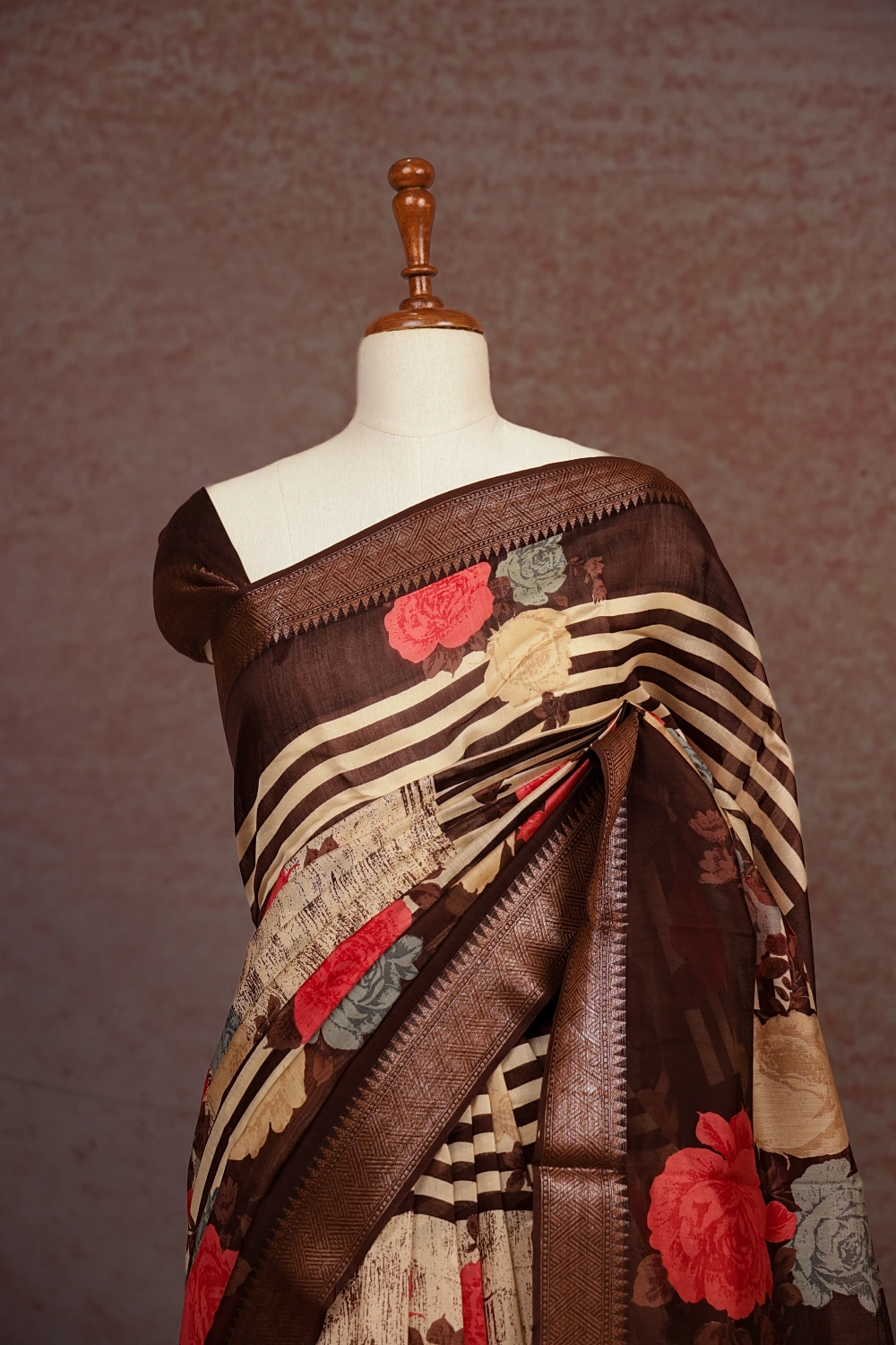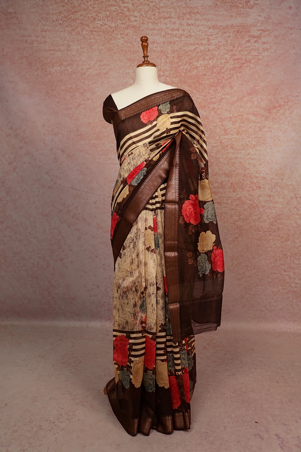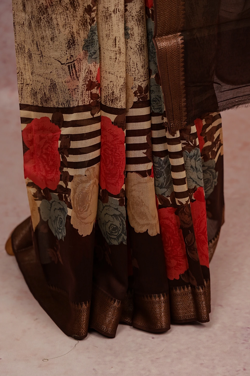 Cream Chanderi Silk Floral Printed Saree With Designer Border. Includes Unstitched Blouse