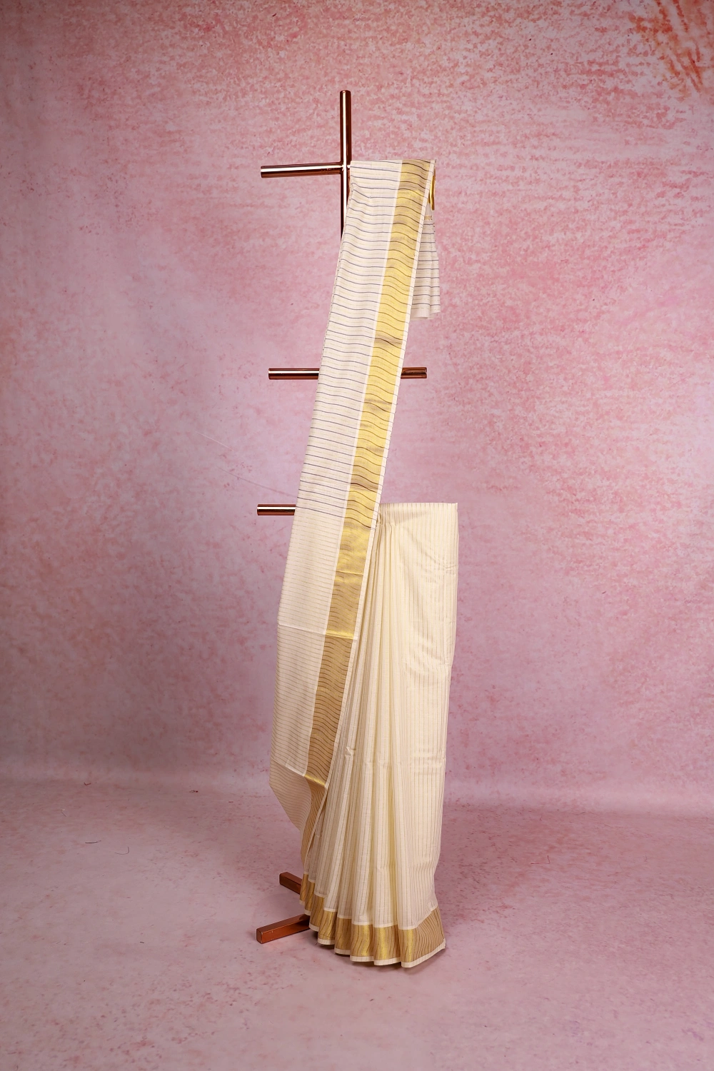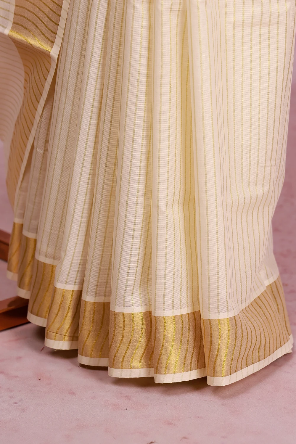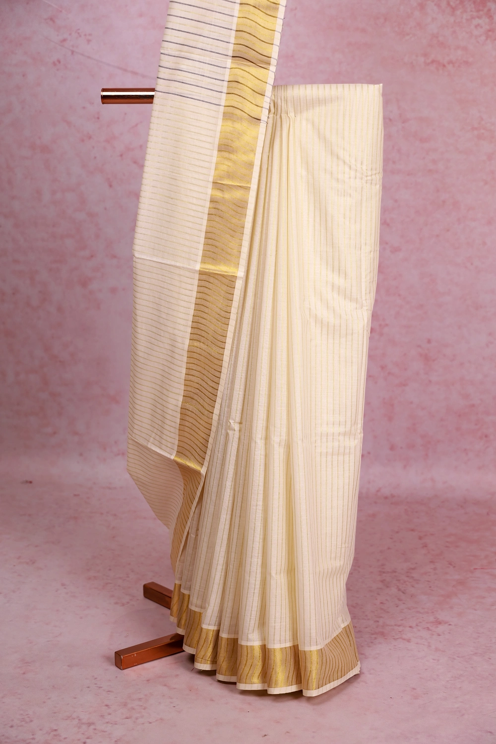 Cream Cotton Kerala Lines Saree With Zari Border. Includes Un Stitched Blouse