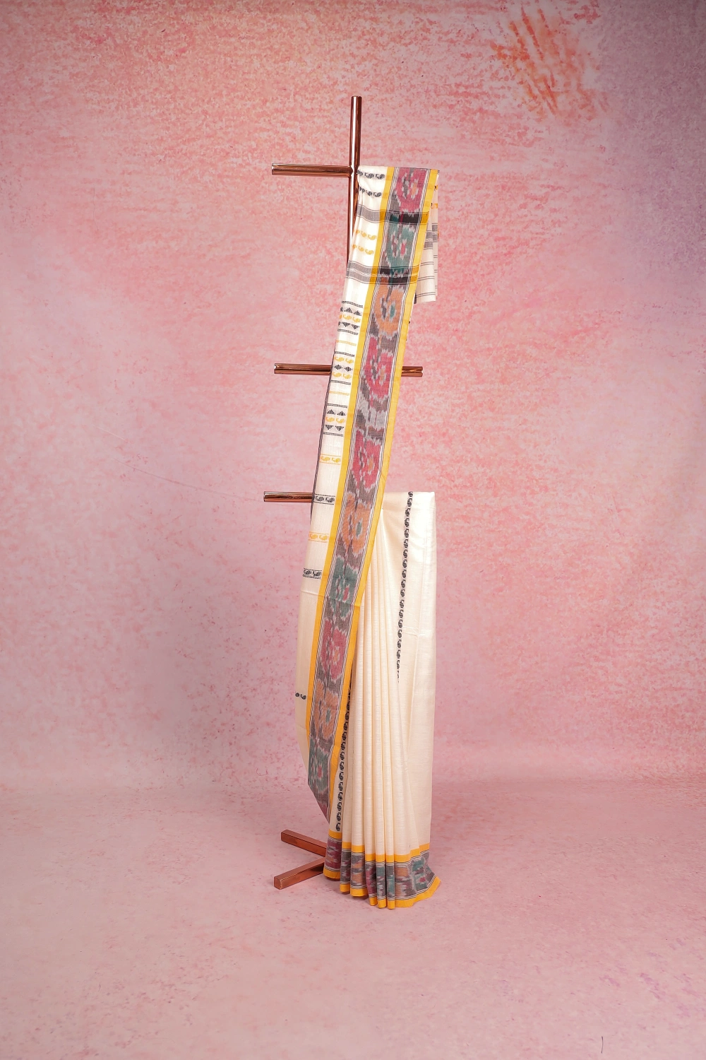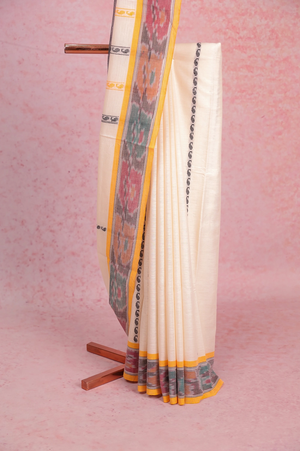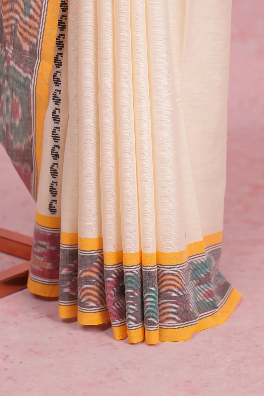 Cream Cotton Line Design Saree with Printed Border. Includes Unstitched Blouse
