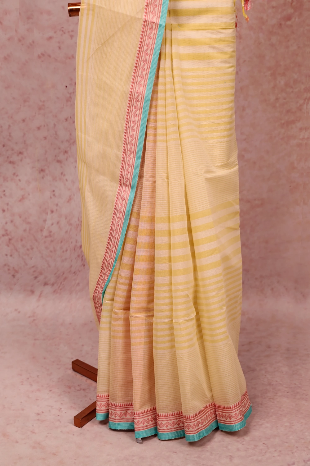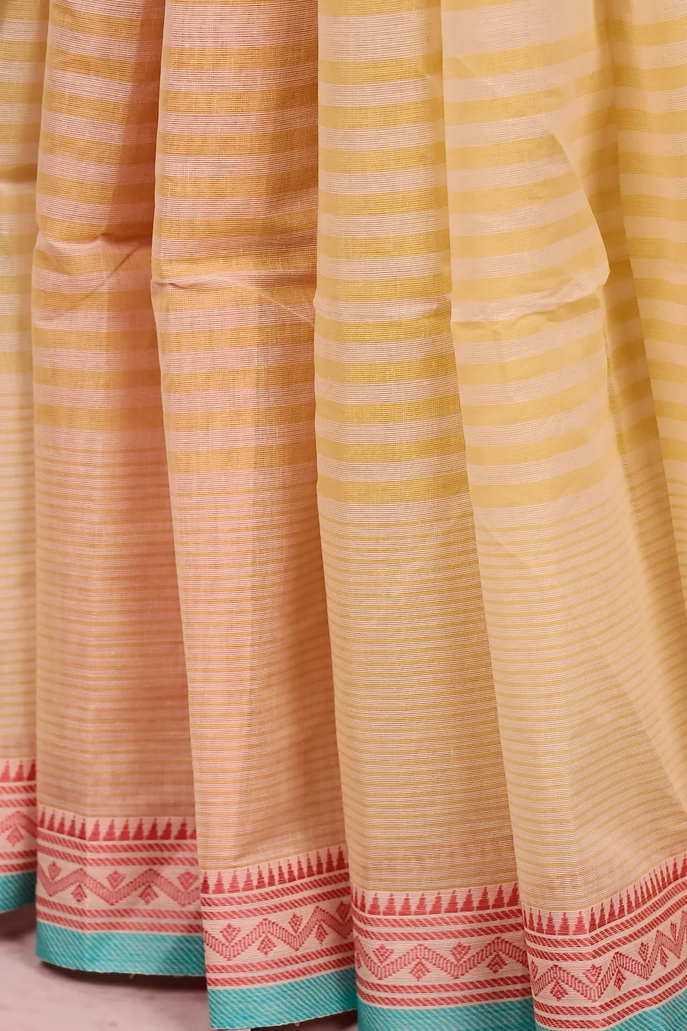 Cream Cotton Lines Saree with Thread Border. Includes Unstitched Blouse