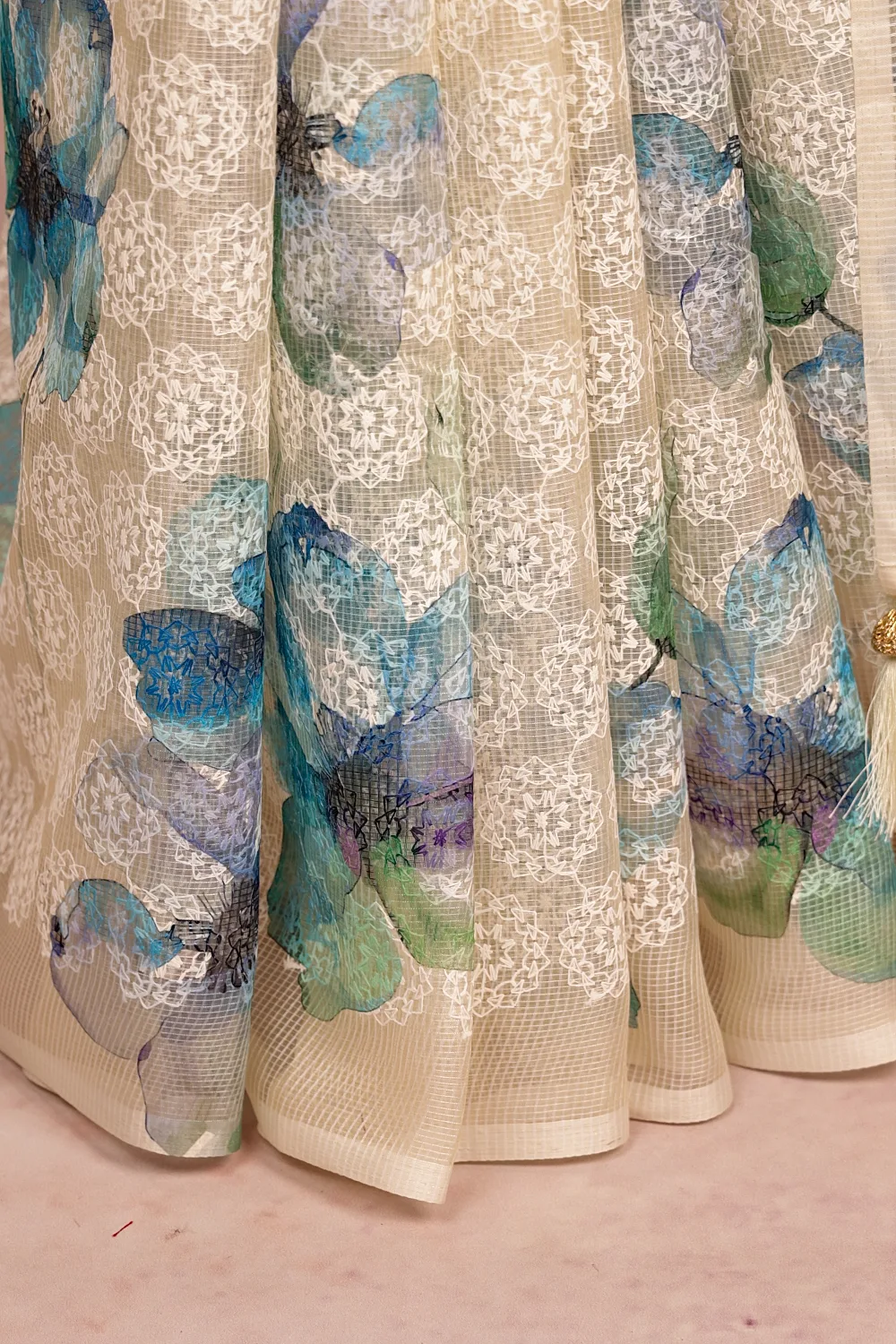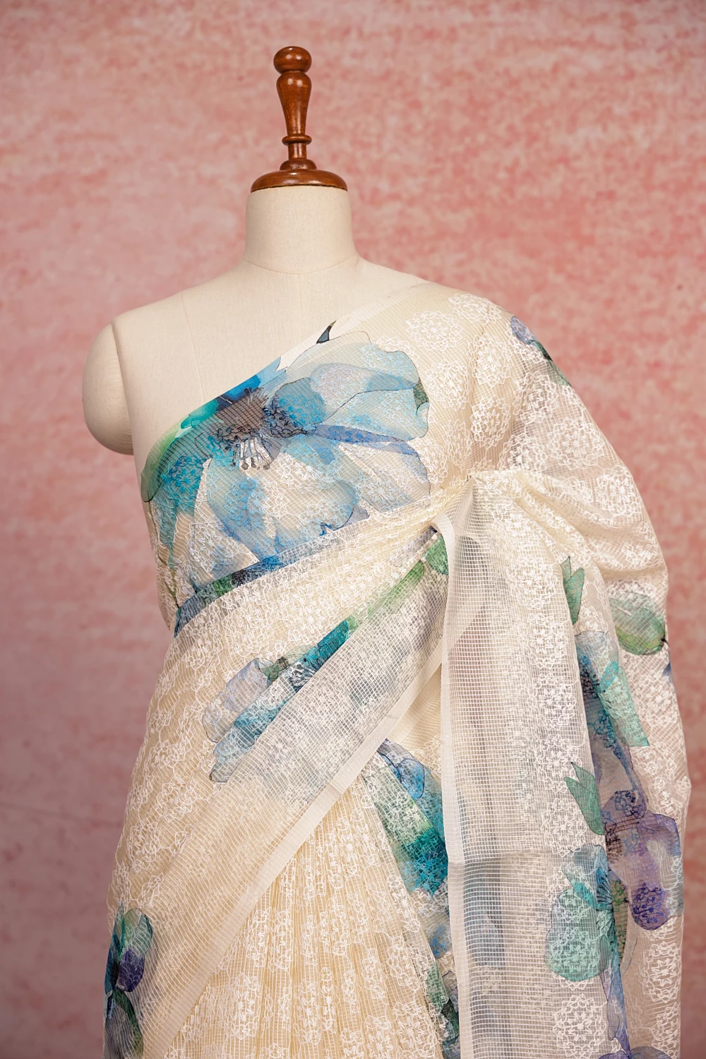 Cream Kota Floral Print Saree Without Border. Includes Unstitched Blouse