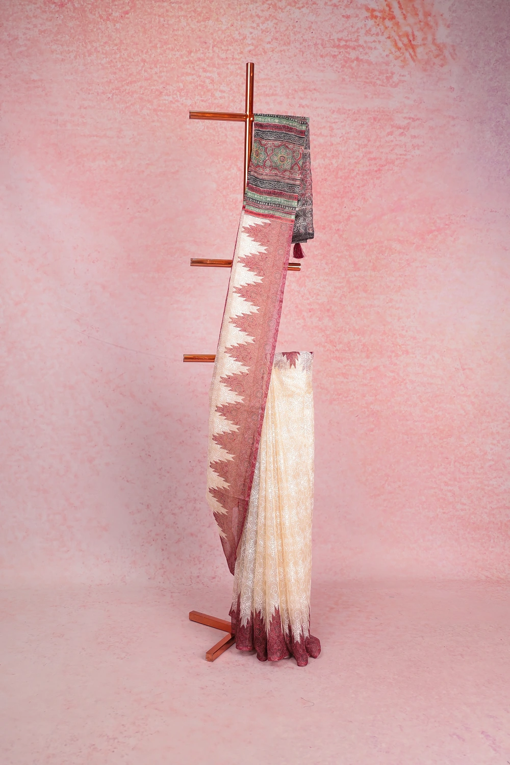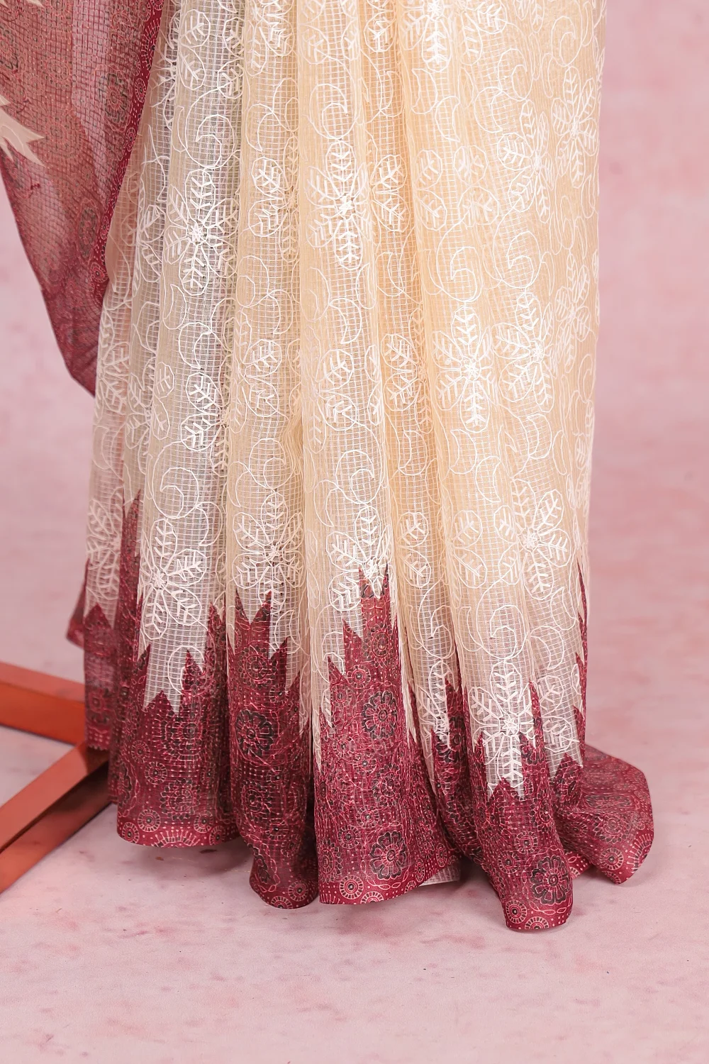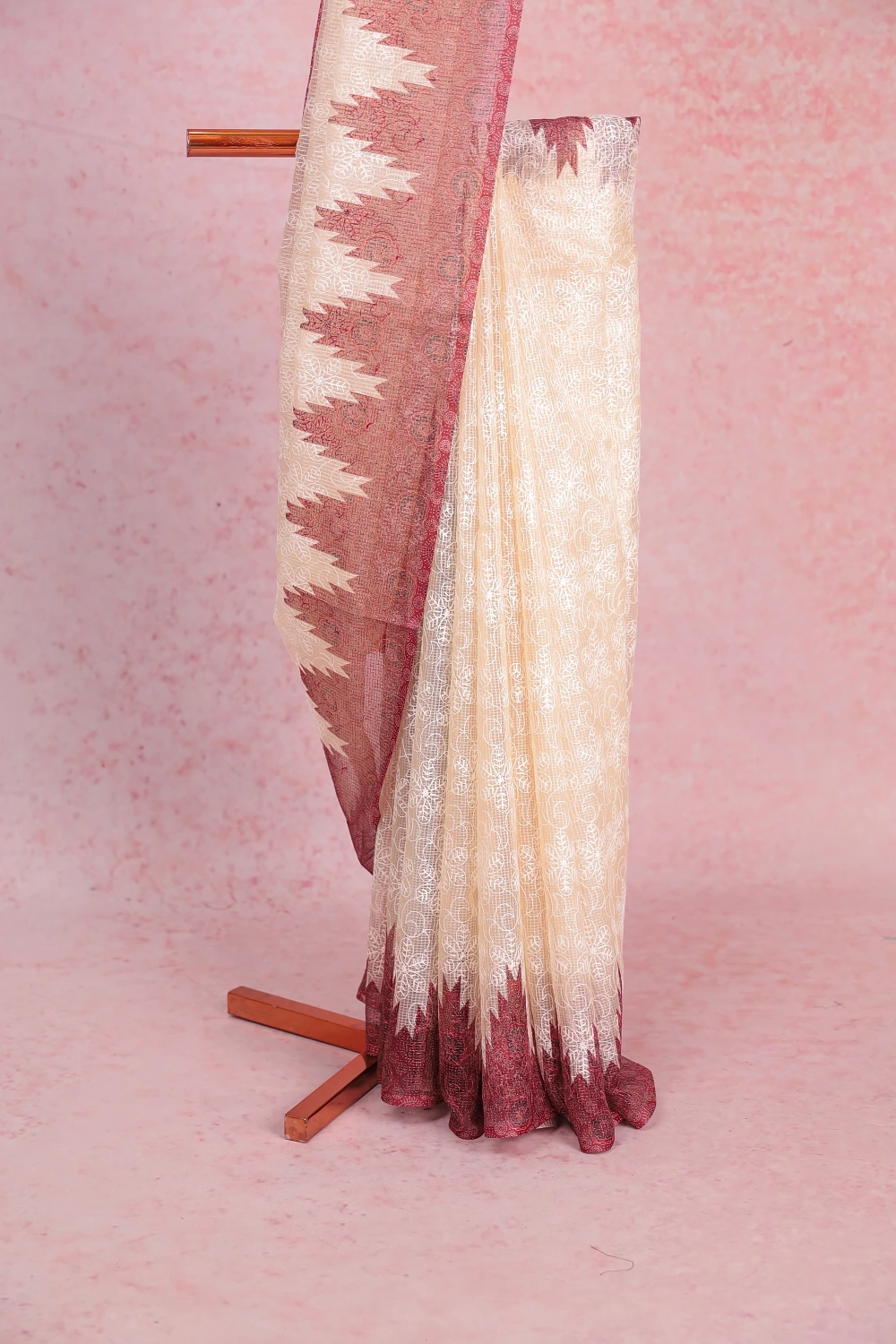Cream Kota Embroidary Saree with Temple Border. Includes Unstitched Blouse