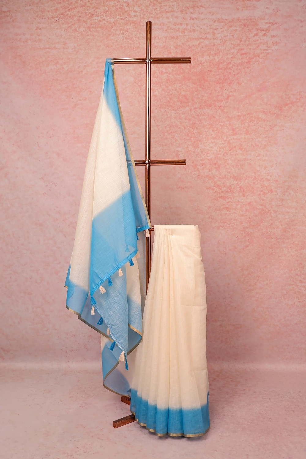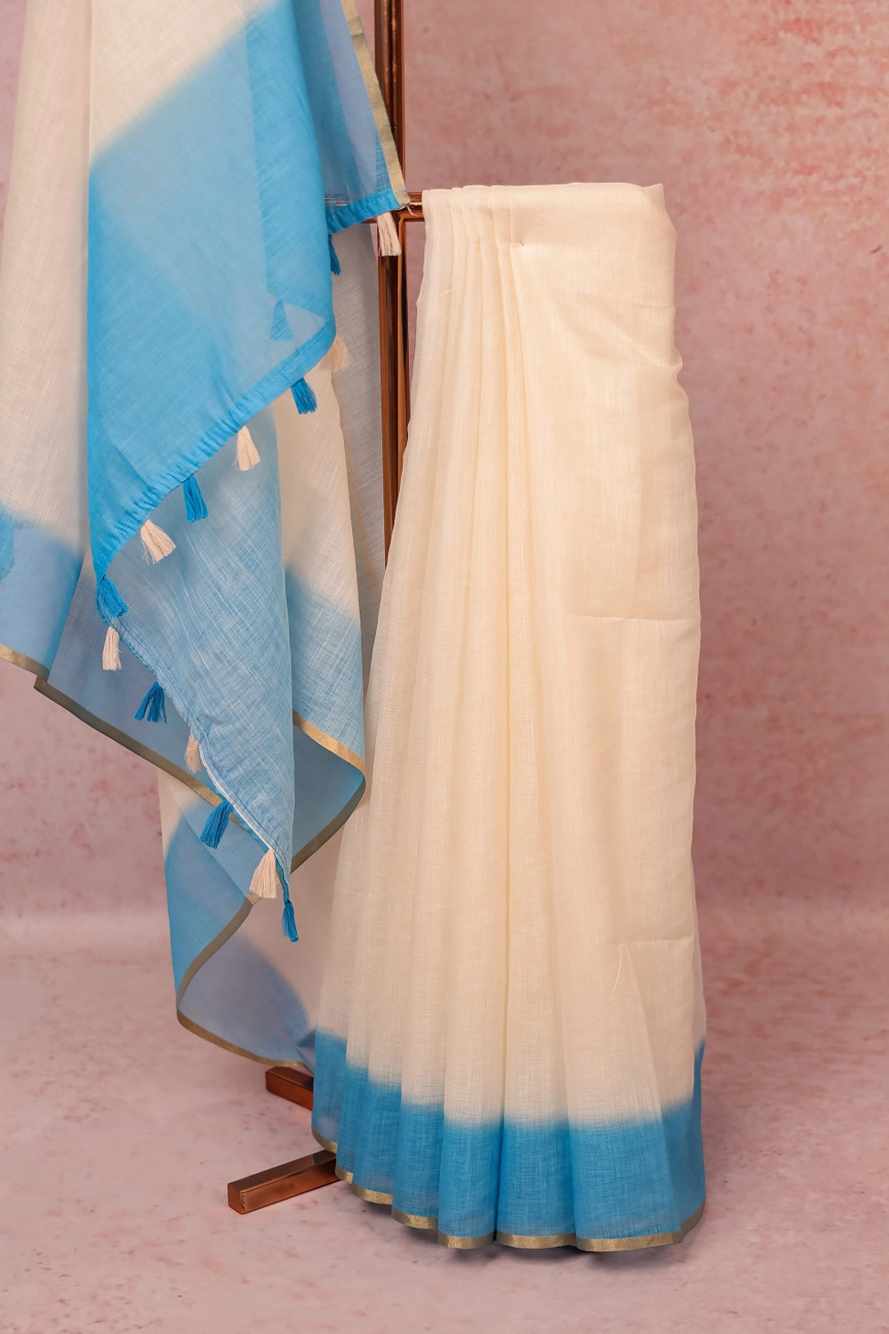 Cream Linen Cotton Kerala Plain Body Saree with Plain border. Includes Unstitched Blouse
