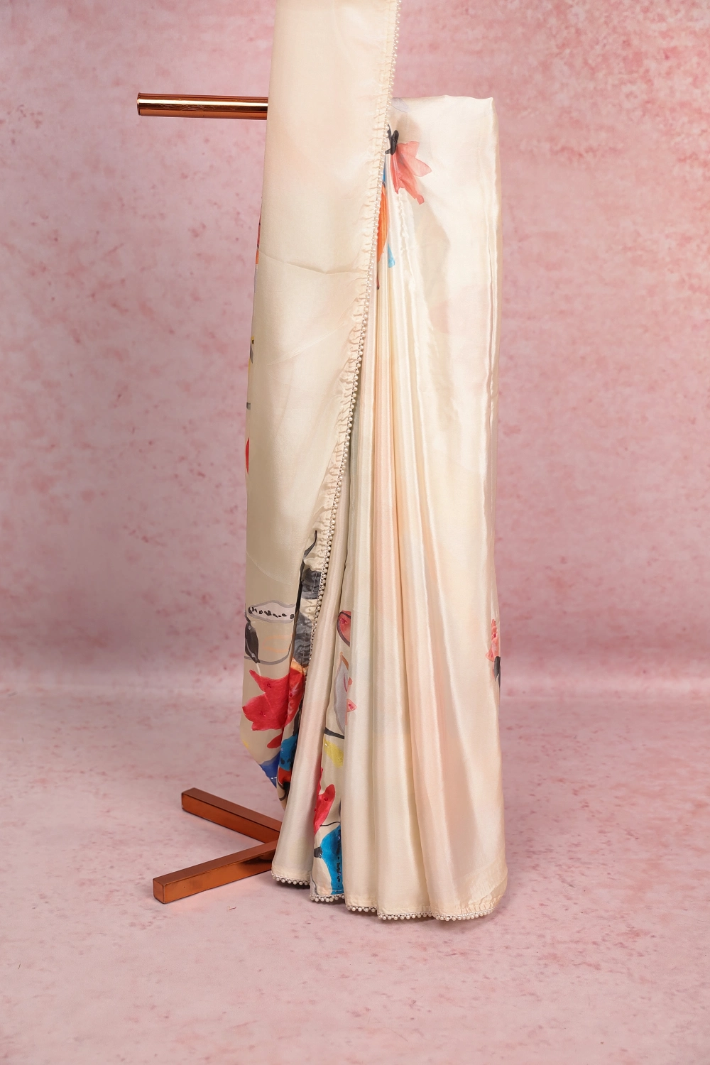 Cream Modal Printed Saree With Piping Border. Includes Un Stitched Blouse