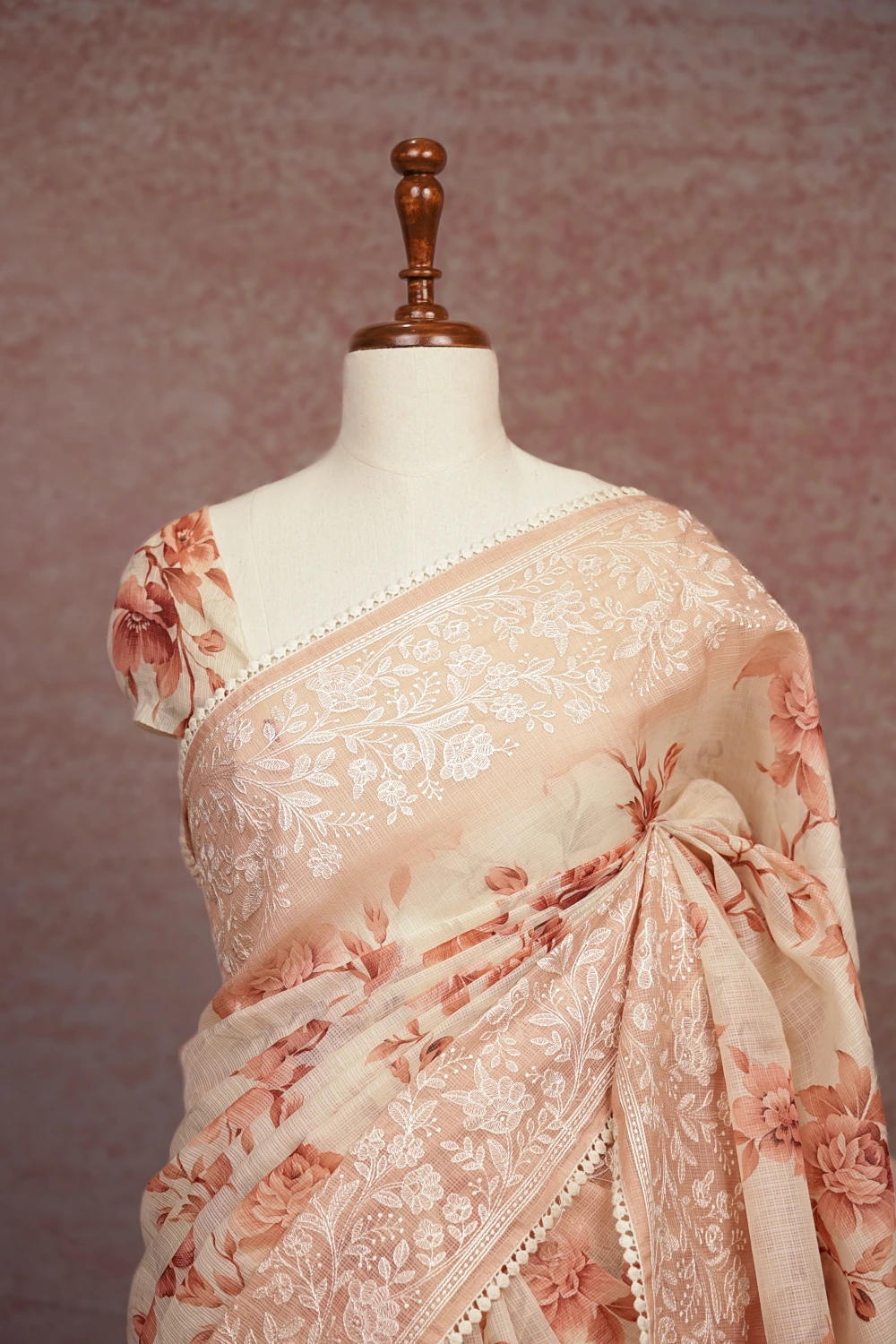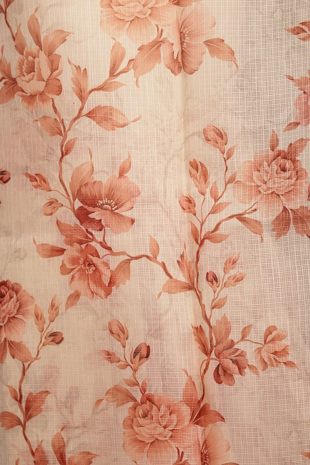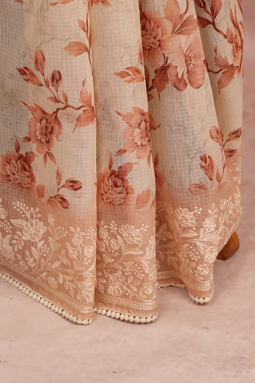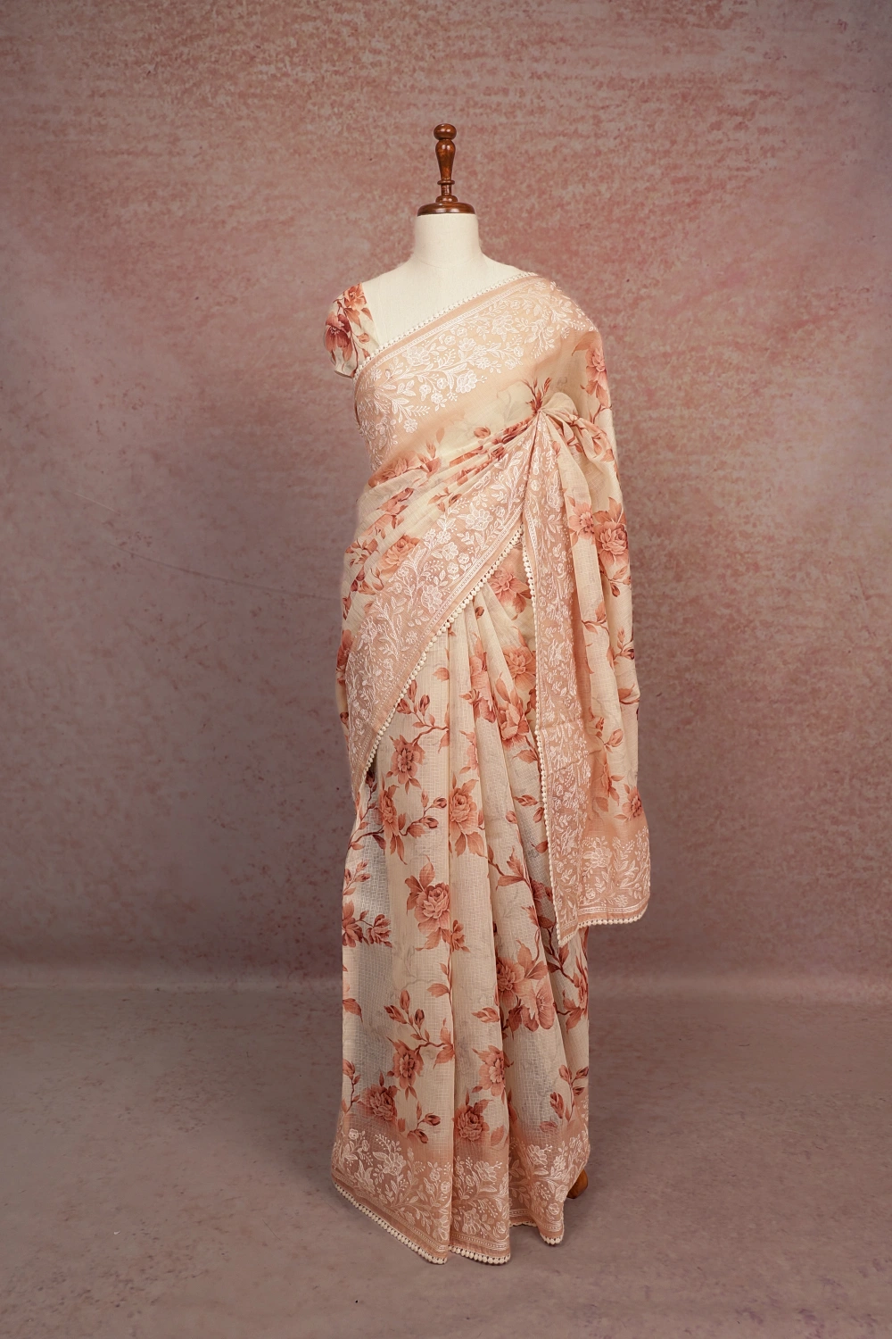 Cream Net Kota Floral Print Saree With Embroidary Border. Includes Unstitched Blouse