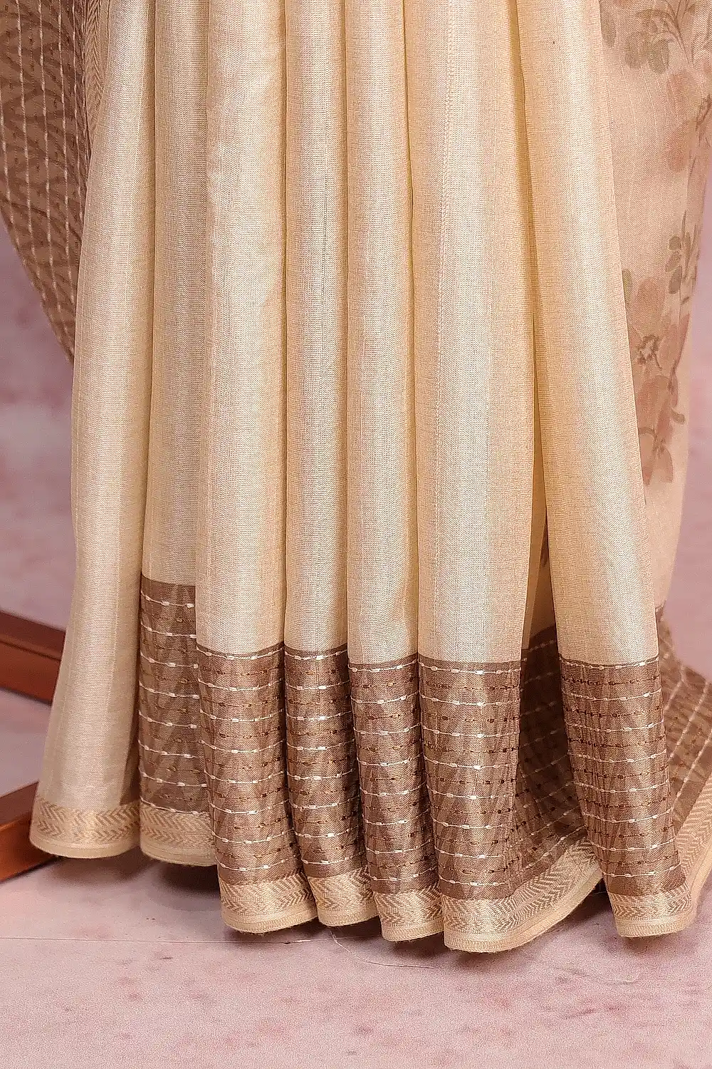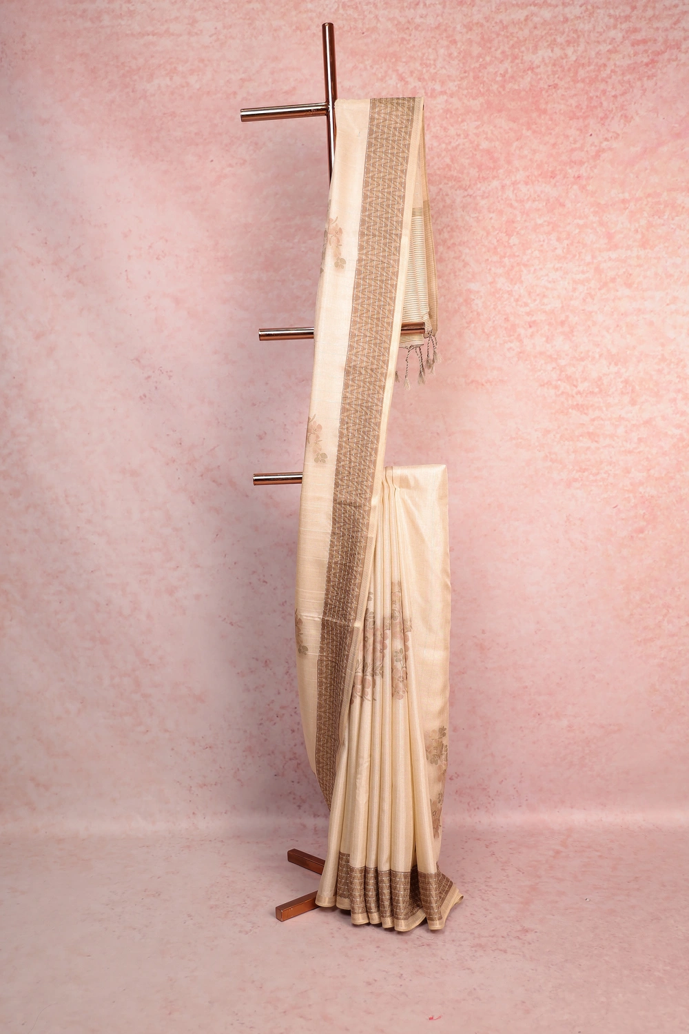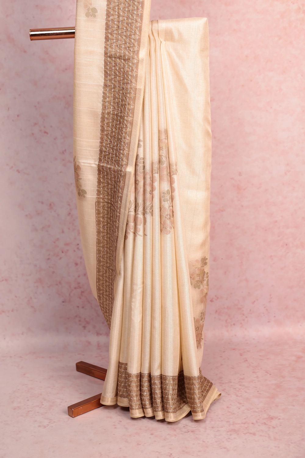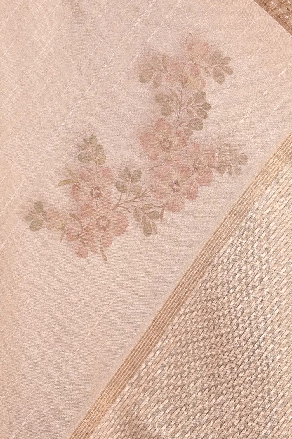 Cream Semi Jute Printed Saree with Thread Border. Includes Un stitched Blouse