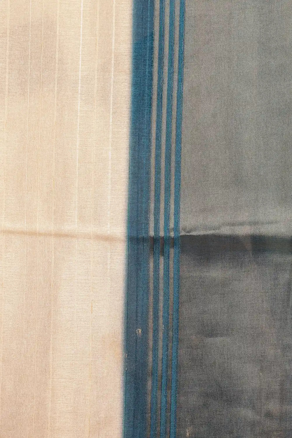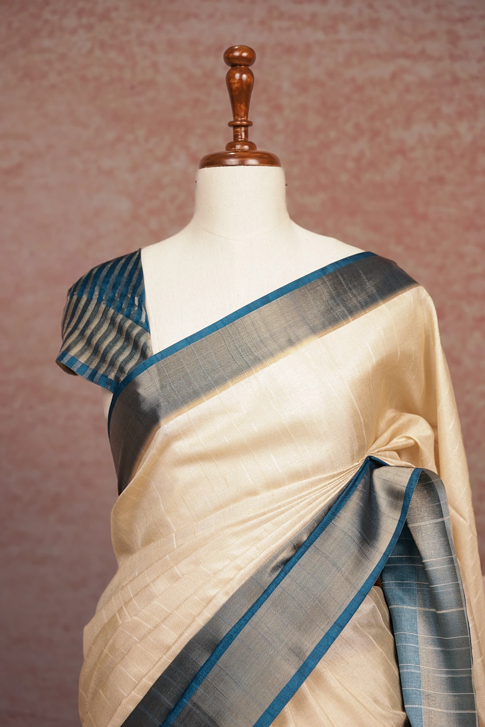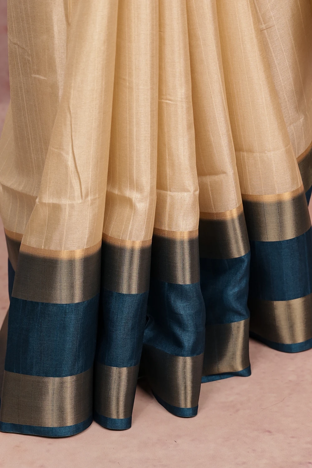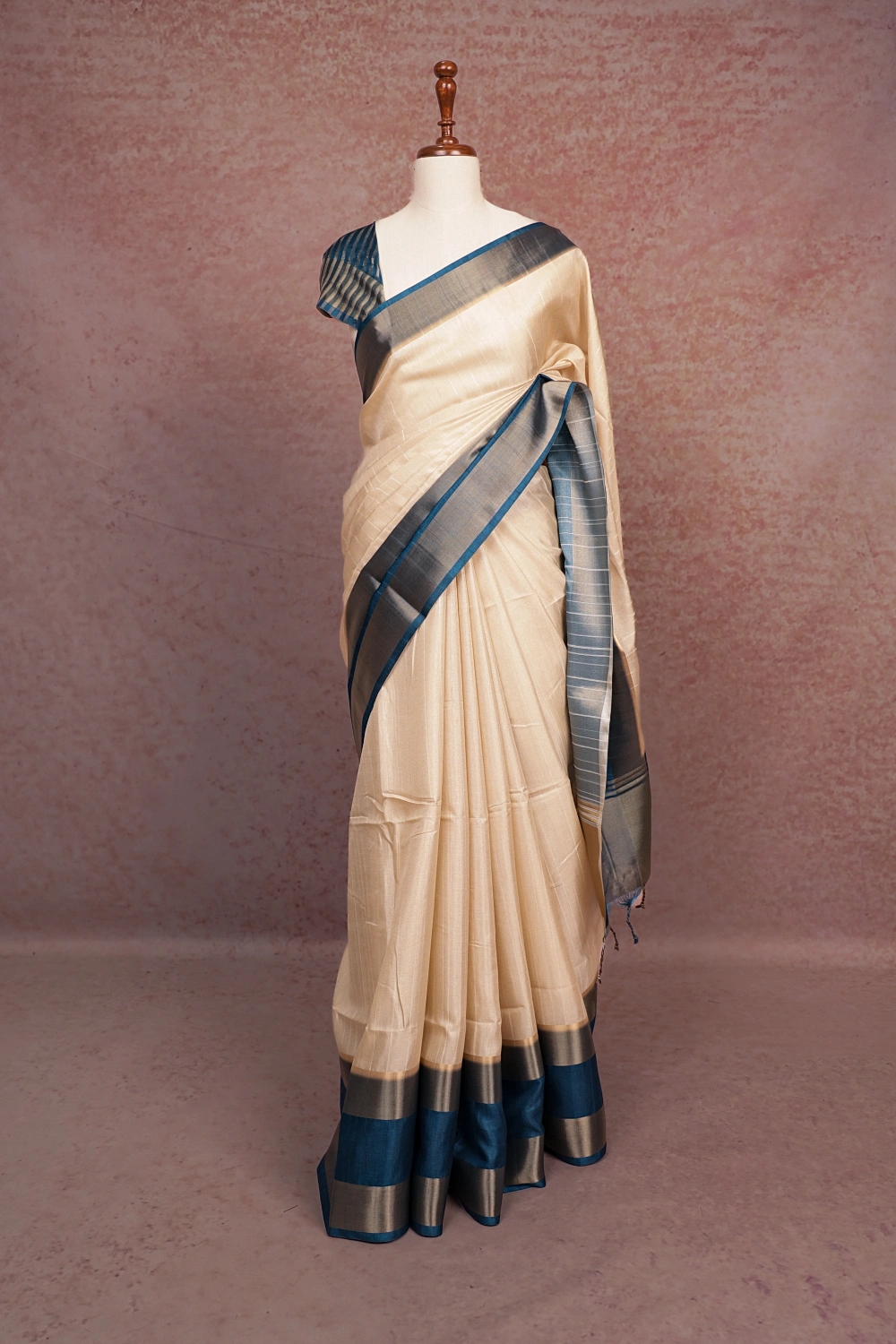 Cream Semi Jute Plain Saree with Golden Border. Includes Unstitched Blouse