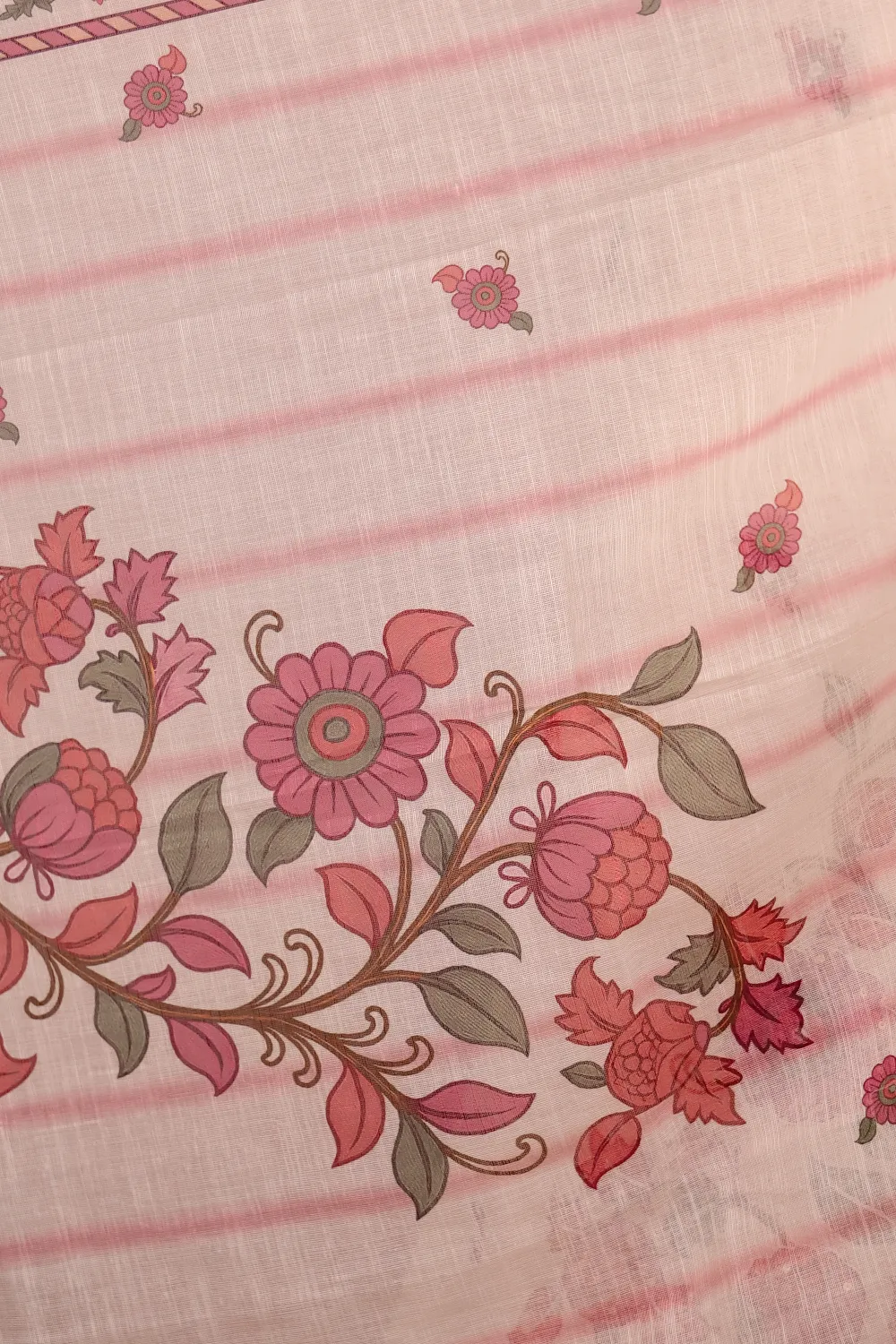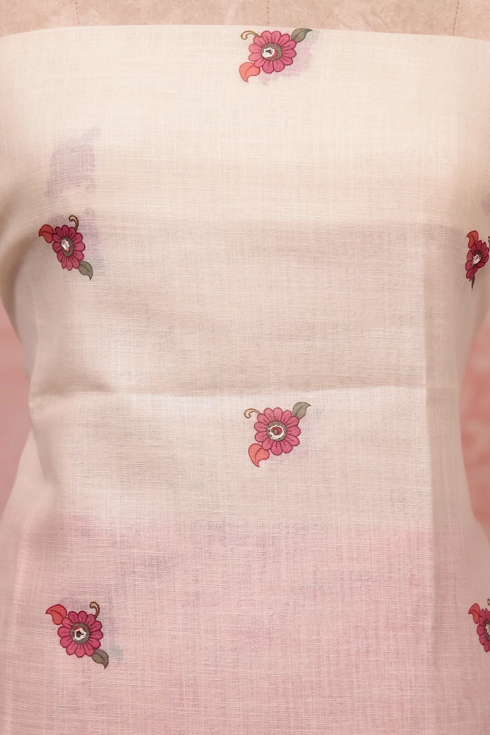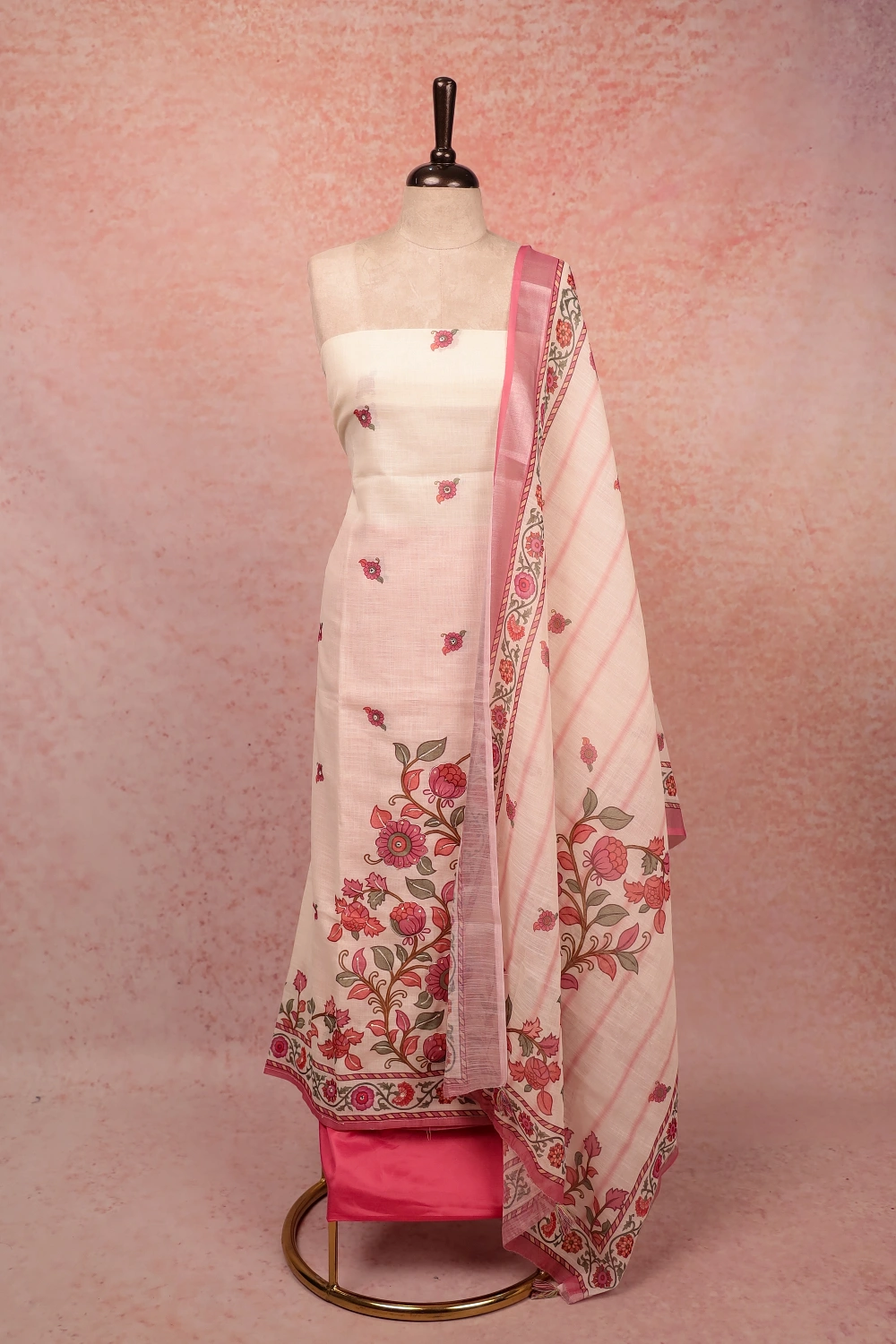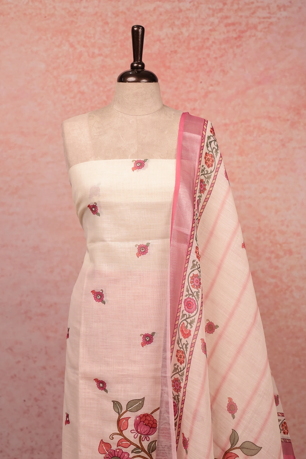Cream Semi Linen Printed Unstitched Churidar Material. Includes Dupatta.