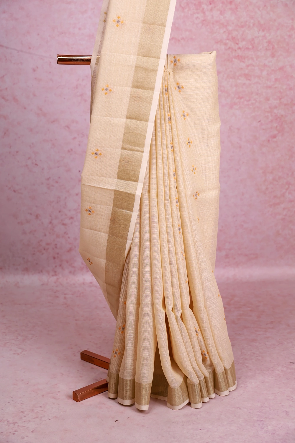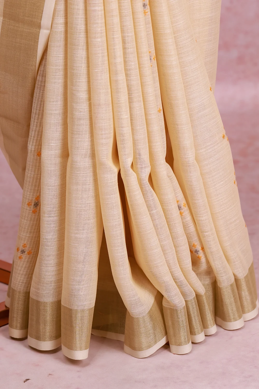 Cream Semi Linen Butta Saree With Zari Border. Includes Unstitched Blouse