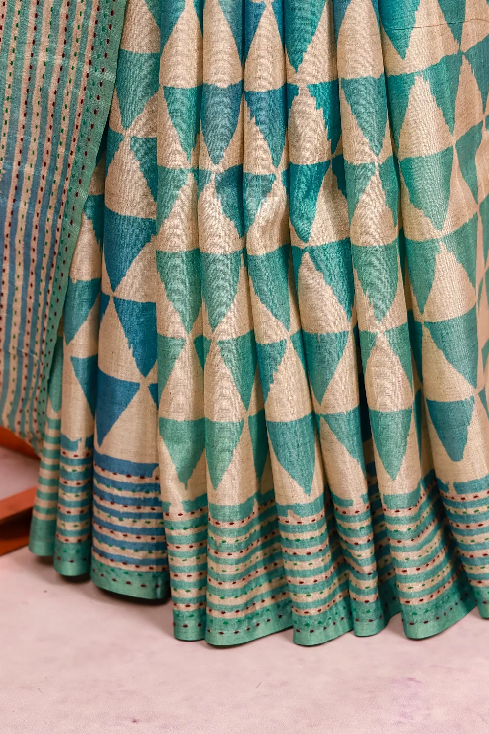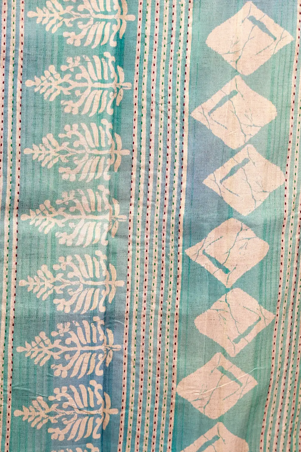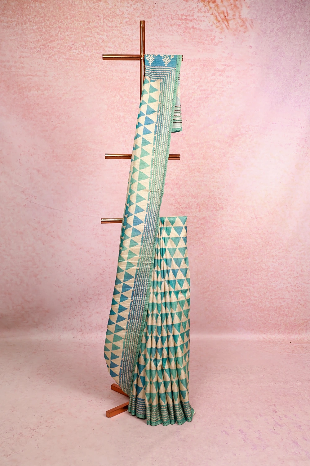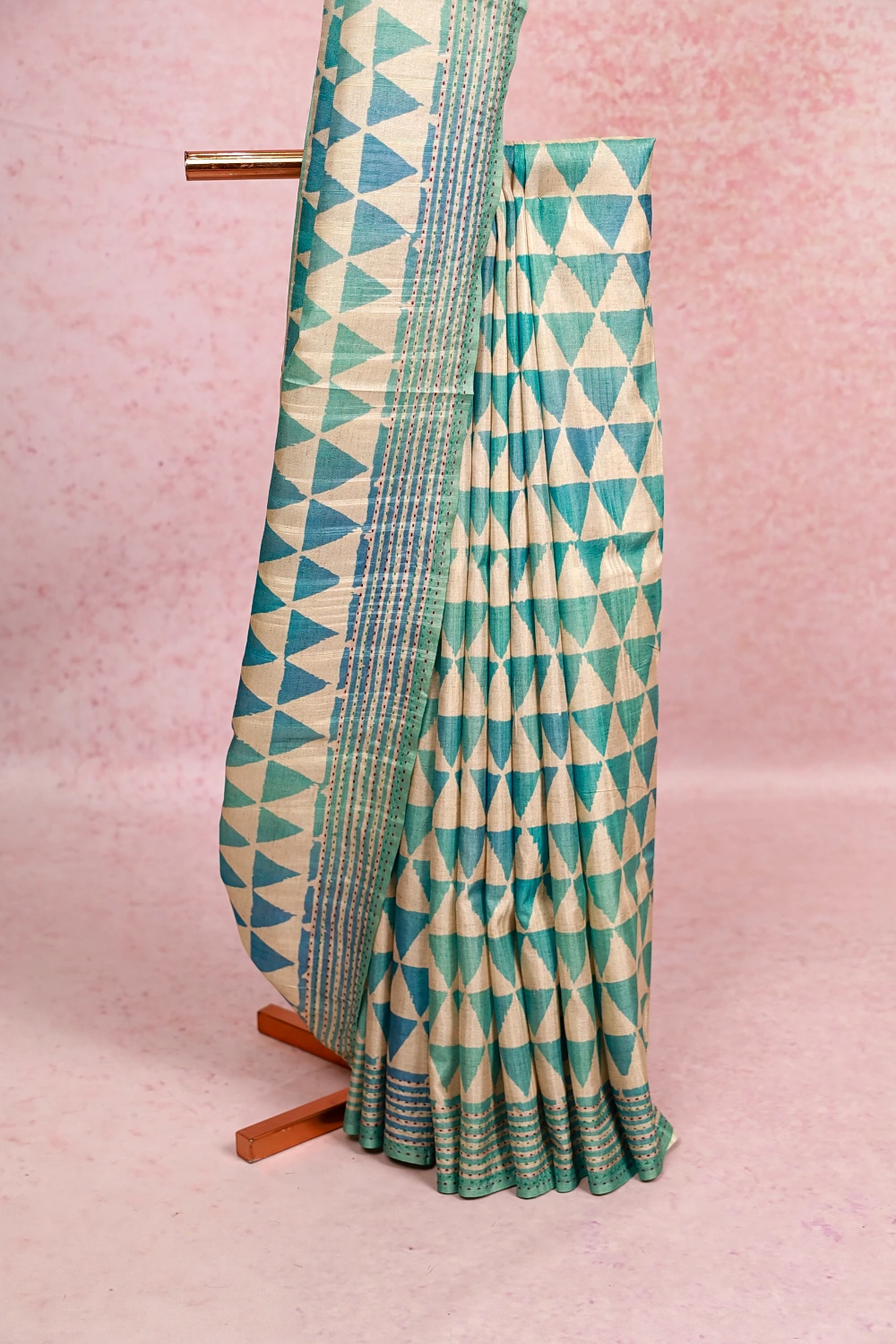 Cream Semi Silk Geometrical Design Saree With Kantha Border. Includes Unstitched Blouse
