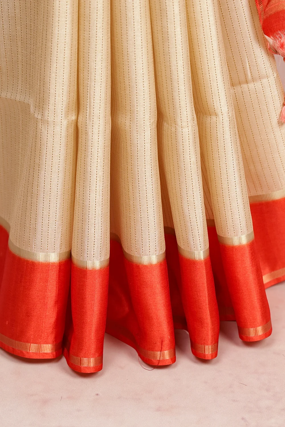 Cream Semi Silk Lines Saree With Plain Border. Includes Unstitched Blouse
