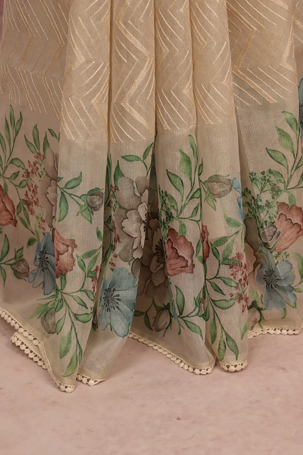Cream Semi Tissue Embroidary Saree With Lays Border. Includes Unstitched Blouse
