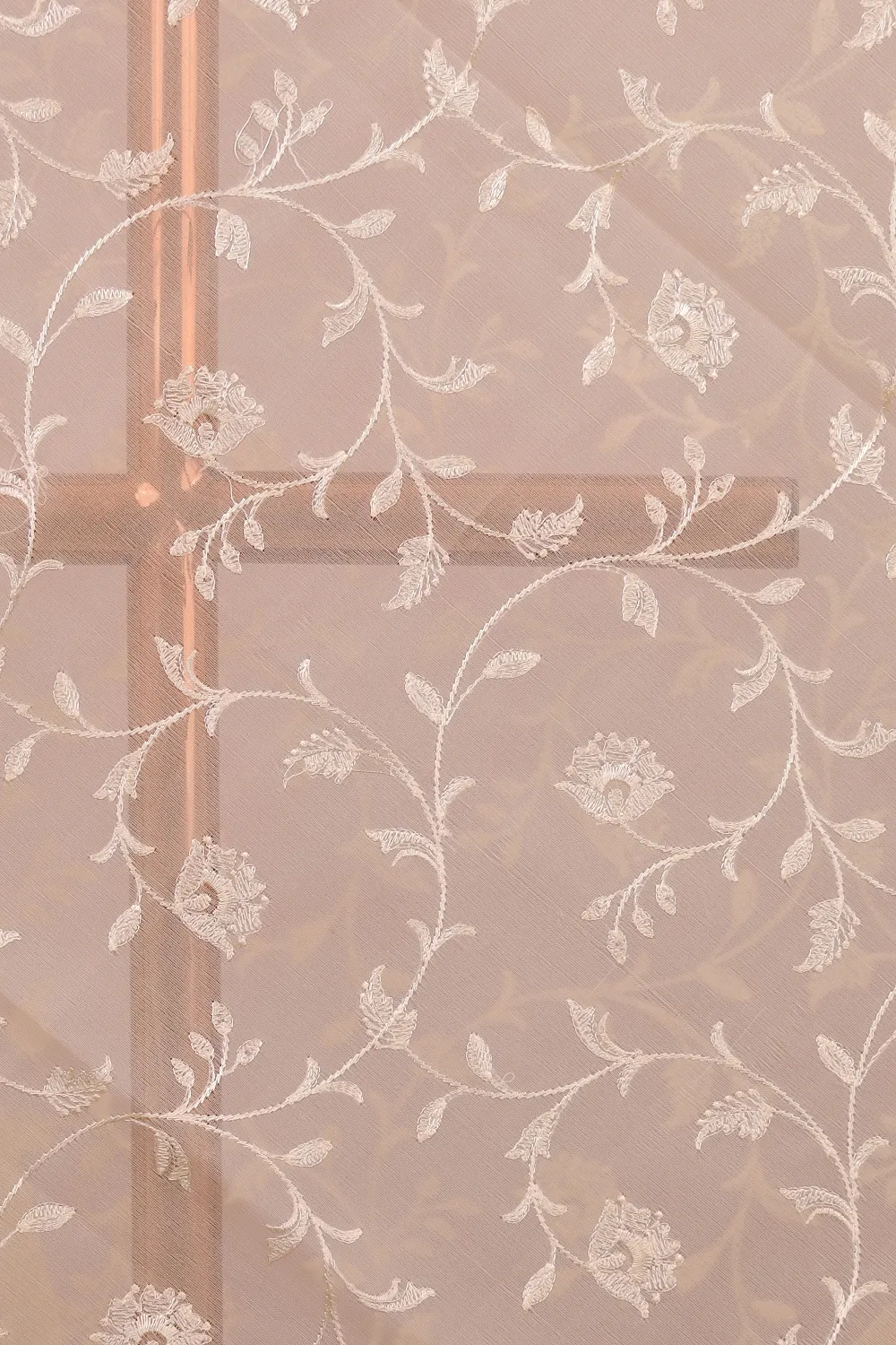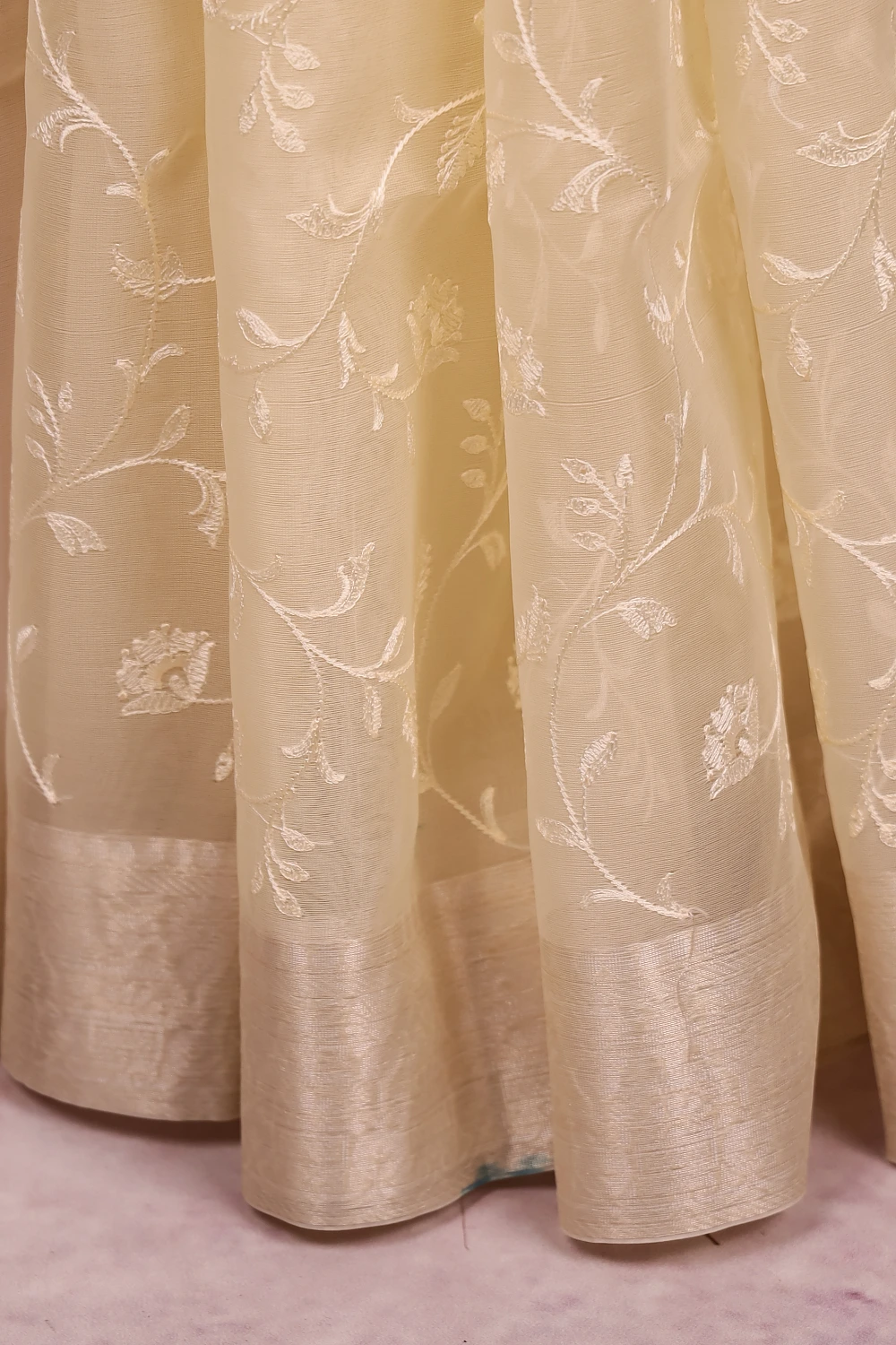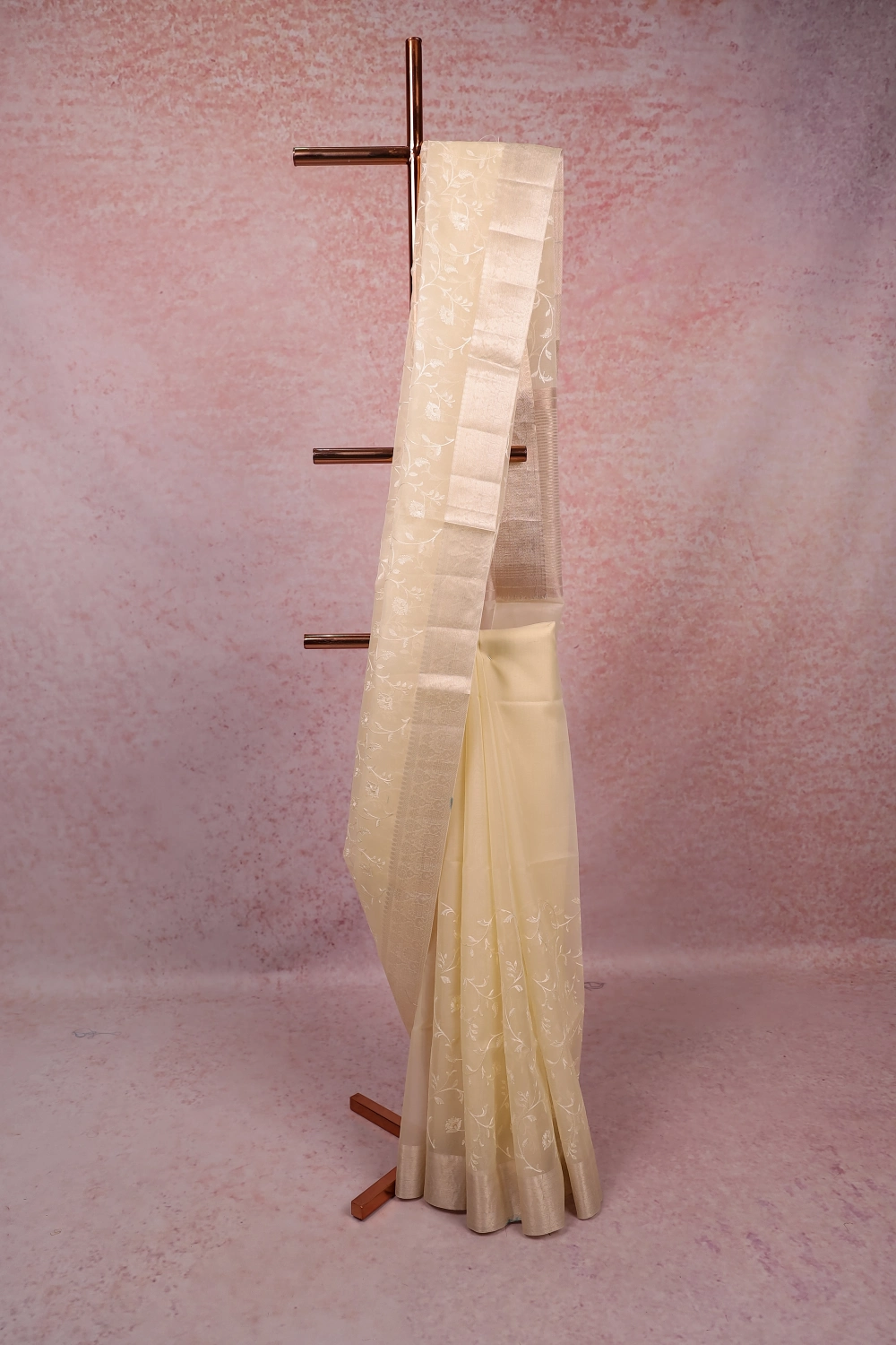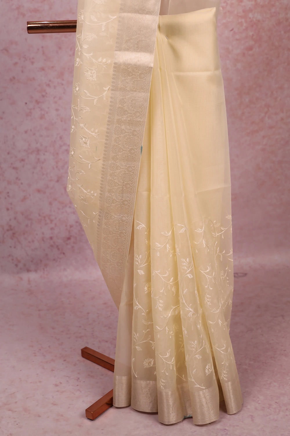 ]Cream Semi Tissue Embroidery Saree with Designer Border. Includes Unstitched Blouse