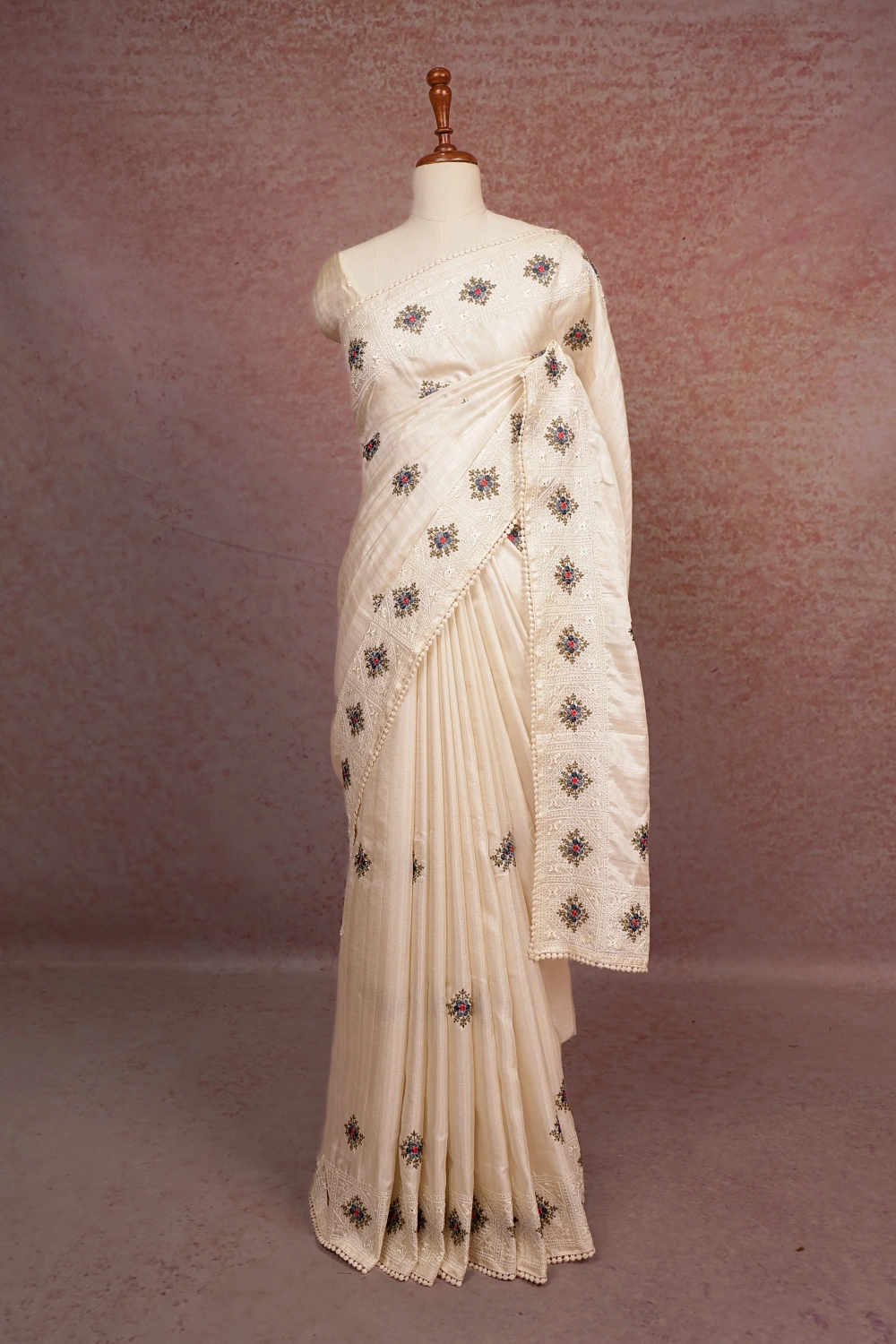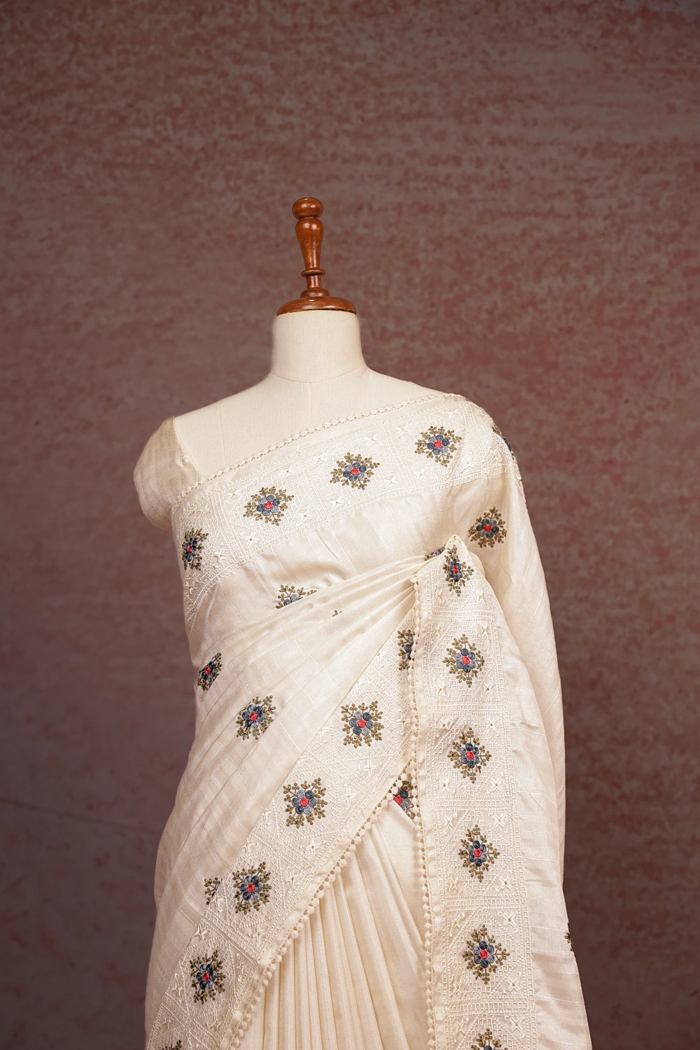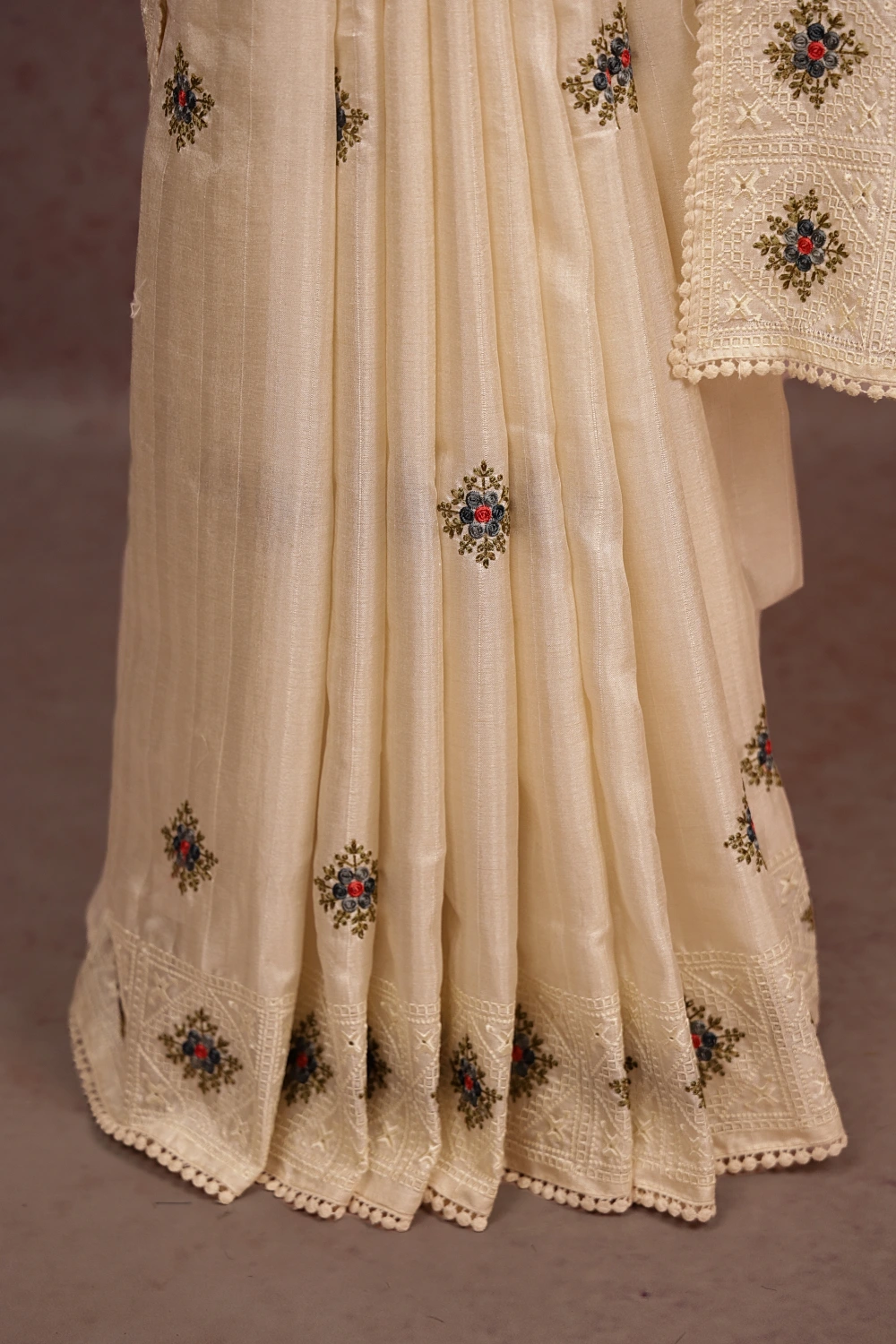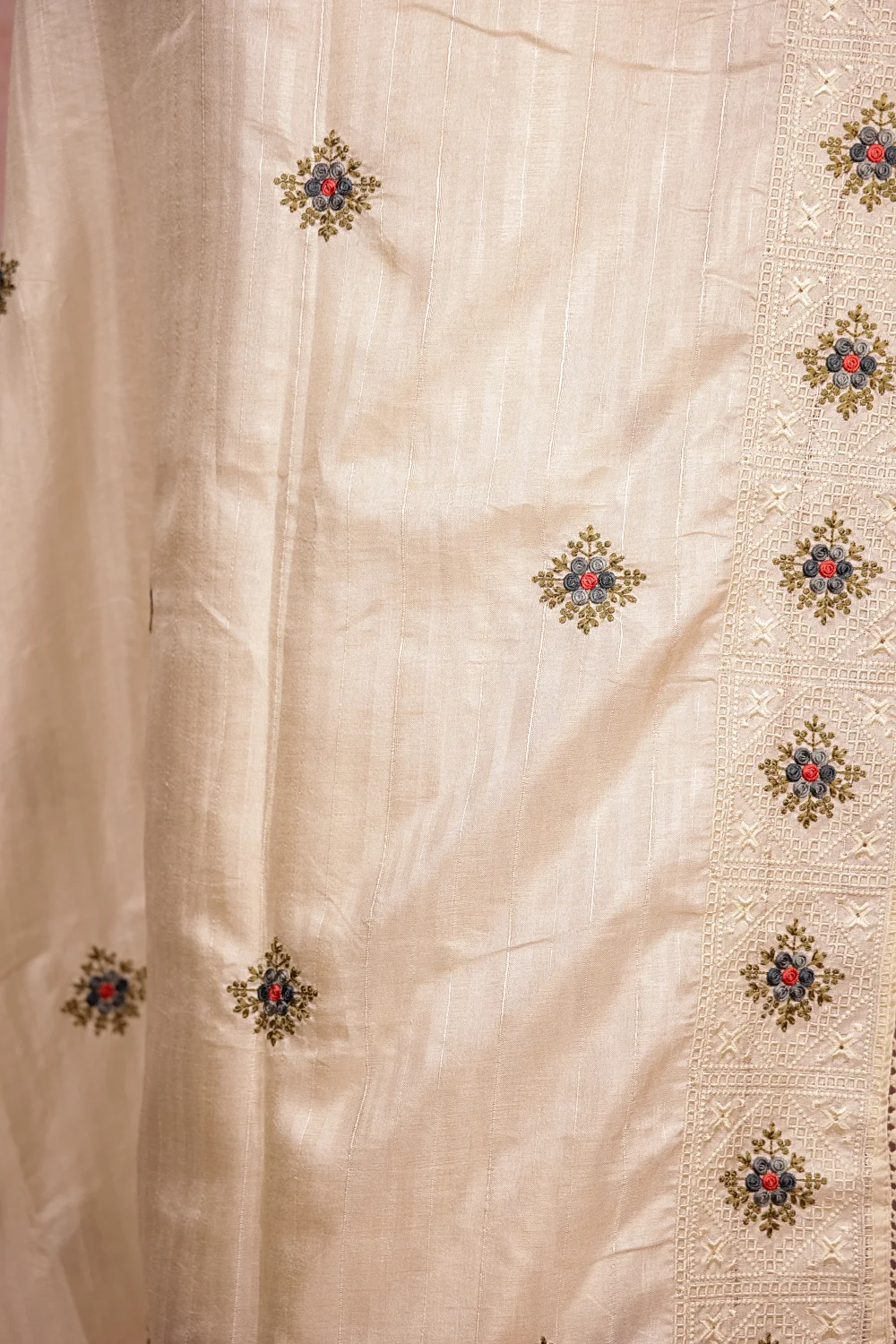 Cream Semi Tussar Embroidery Saree With Lays Border. Includes Unstitched Blouse