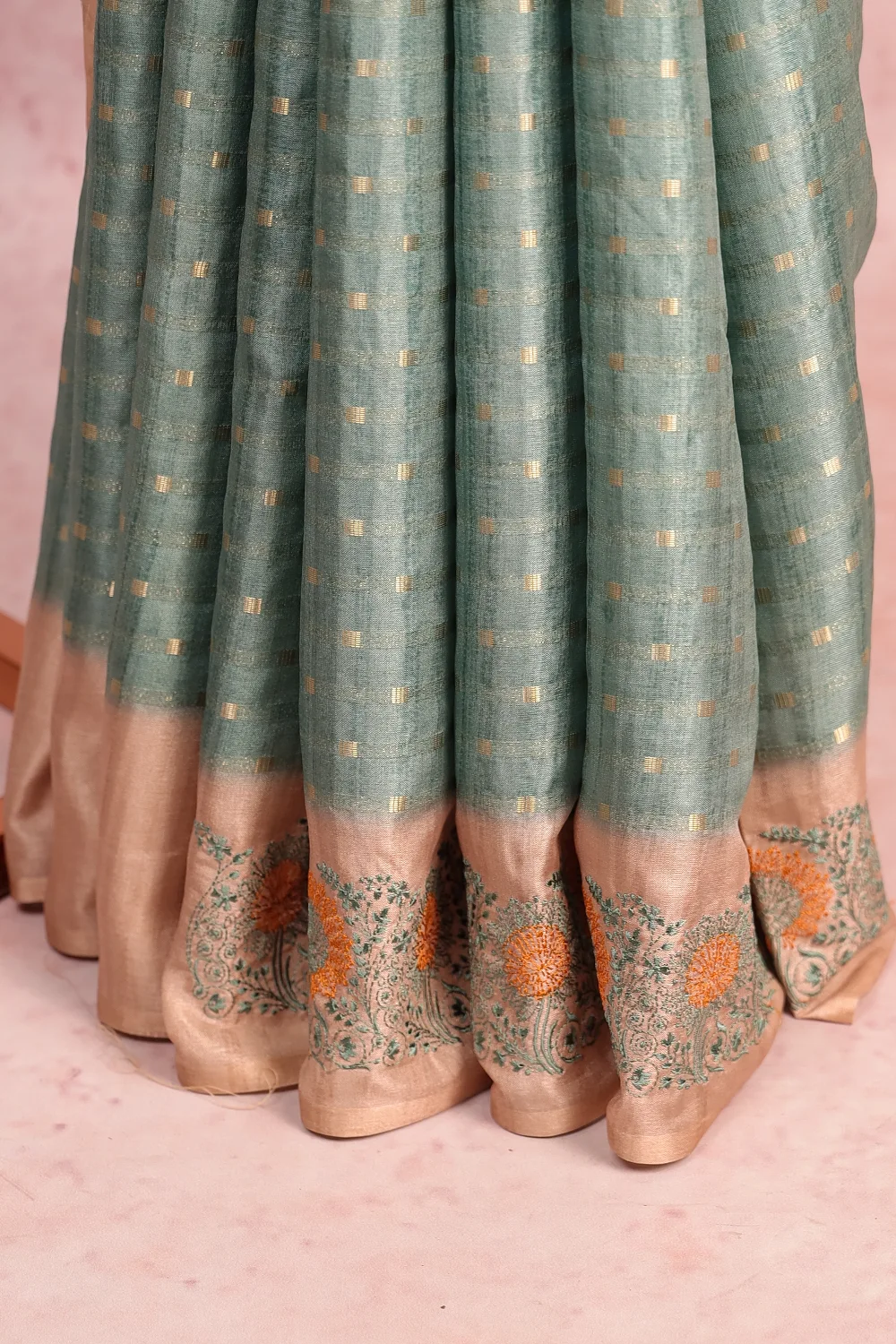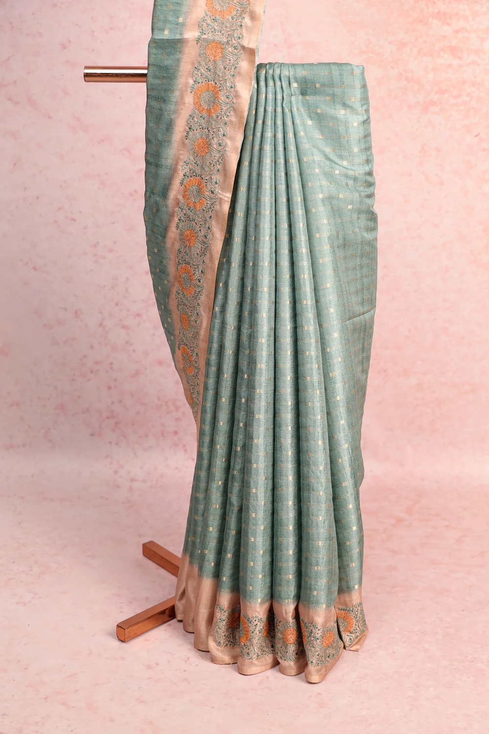 Green Semi Tussar Zari Design Saree with Thread Border. Includes Unstitched Blouse