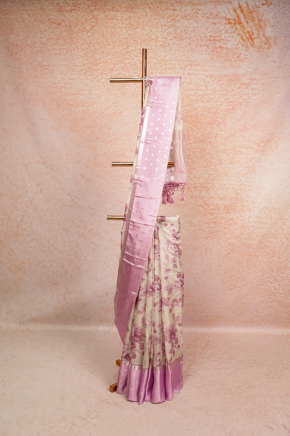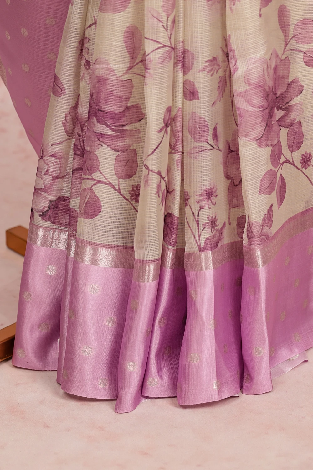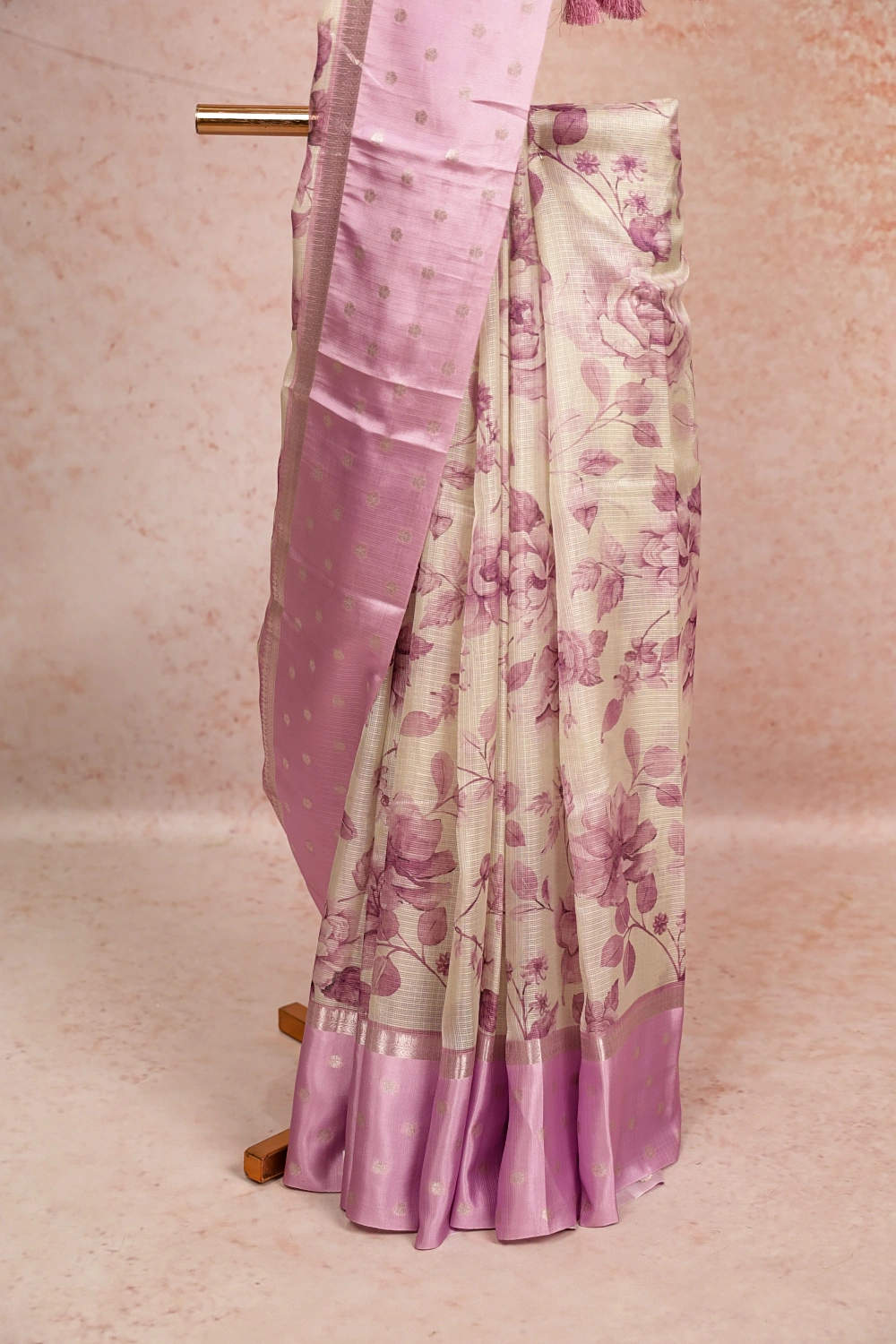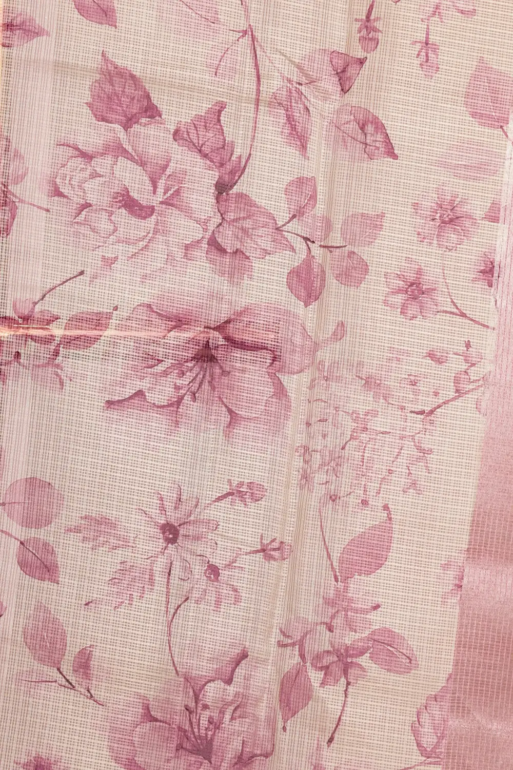 Cream Silky Kota Floral Print Saree With Zari Design Border. Includes Unstitched Blouse
