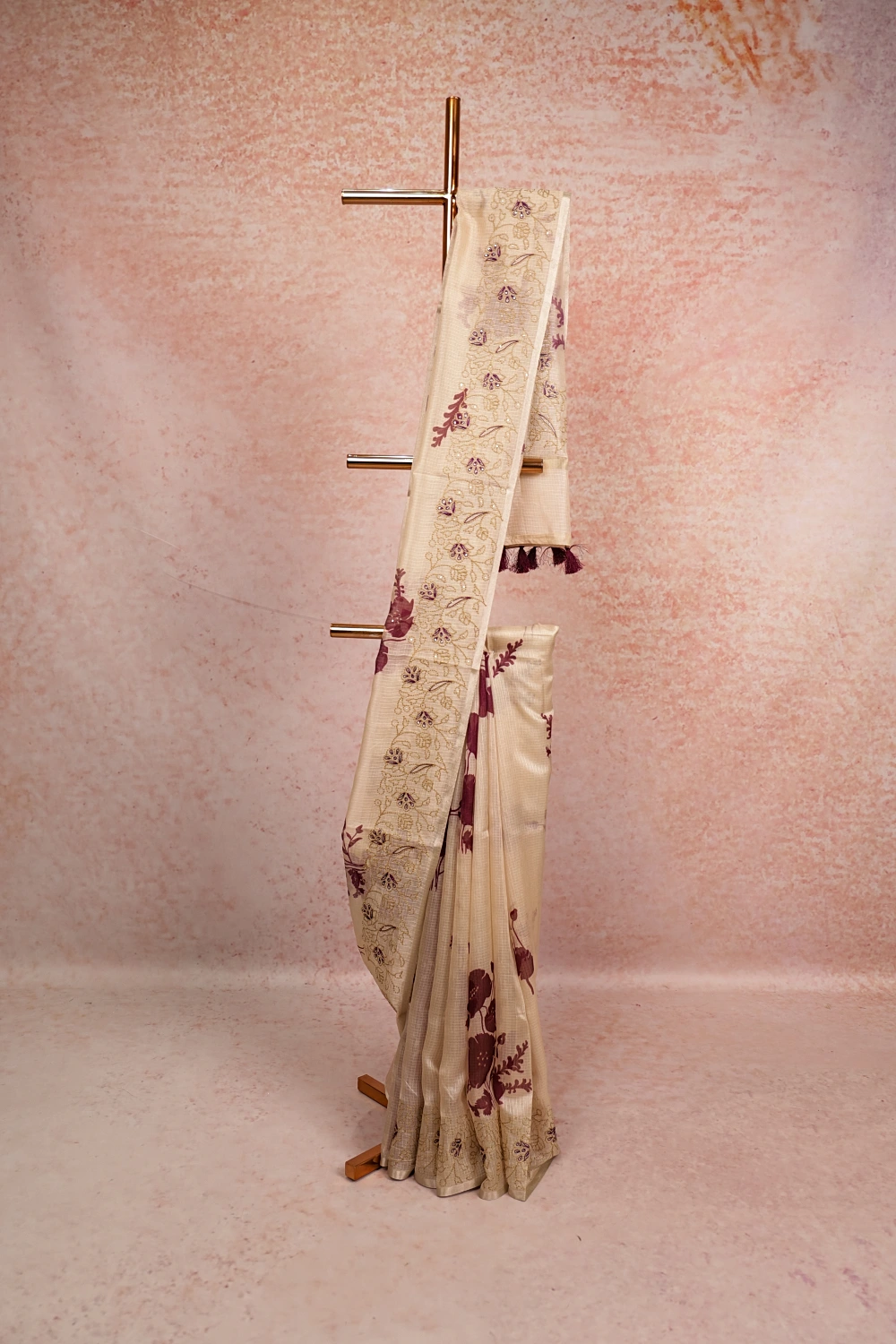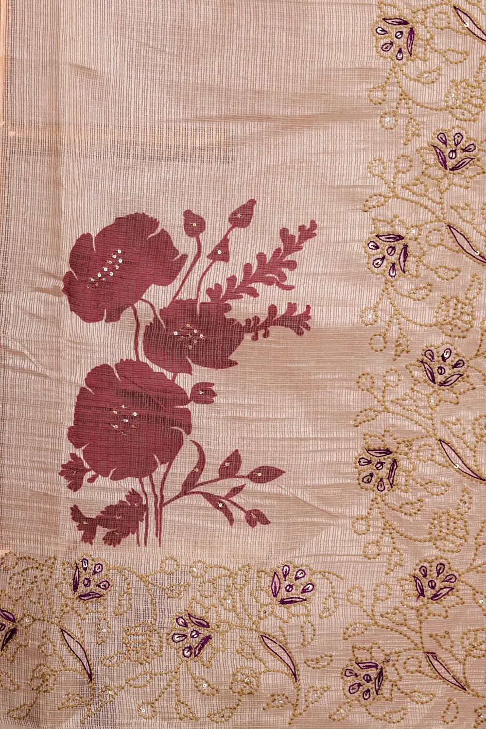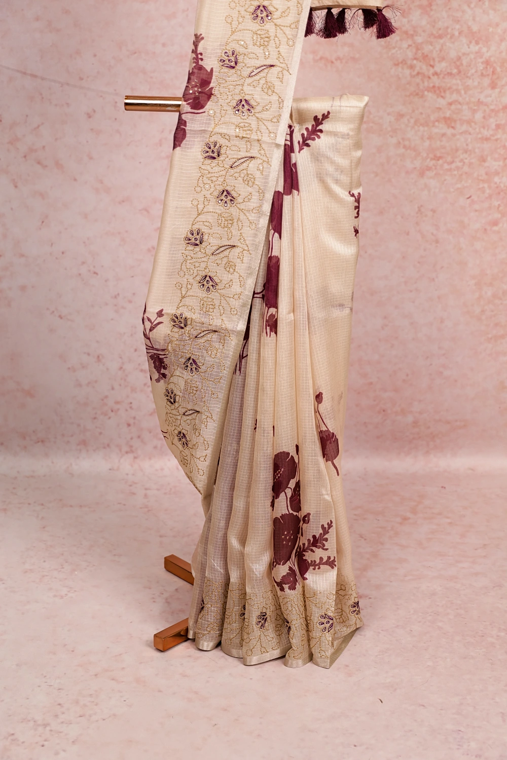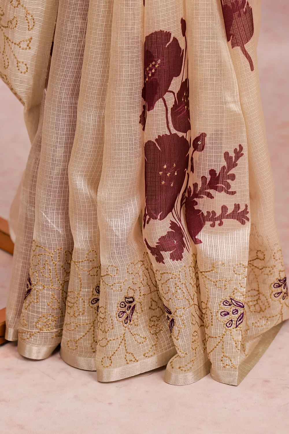 Cream Silky Kota Floral Print Saree With Thread Border. Includes Unstitched Blouse