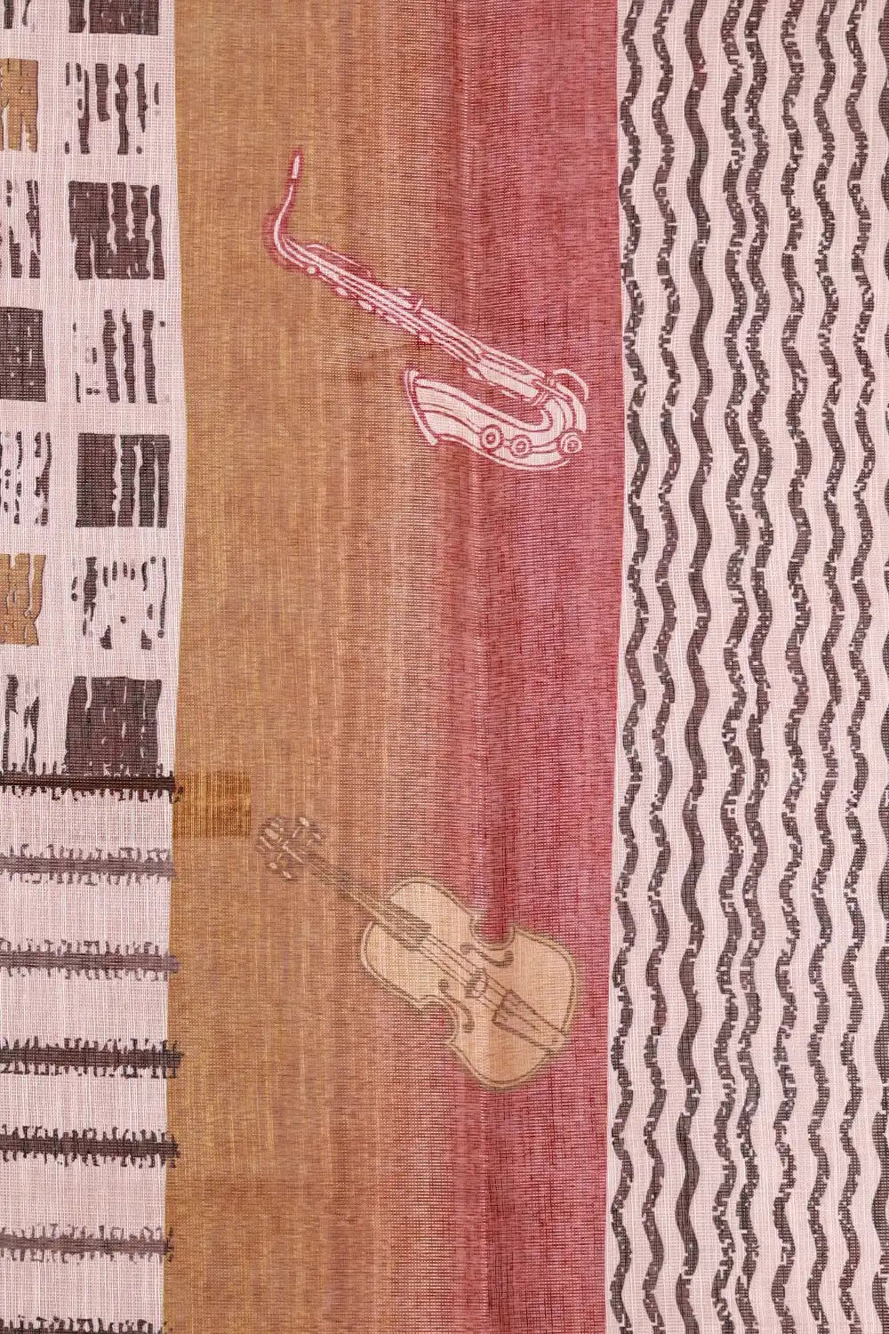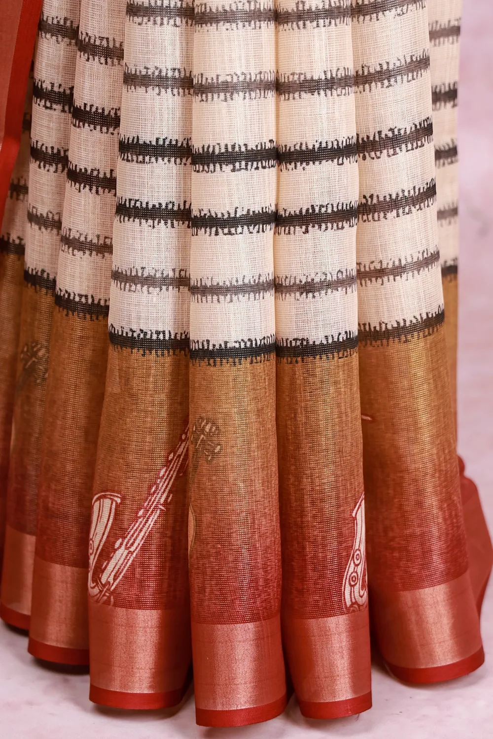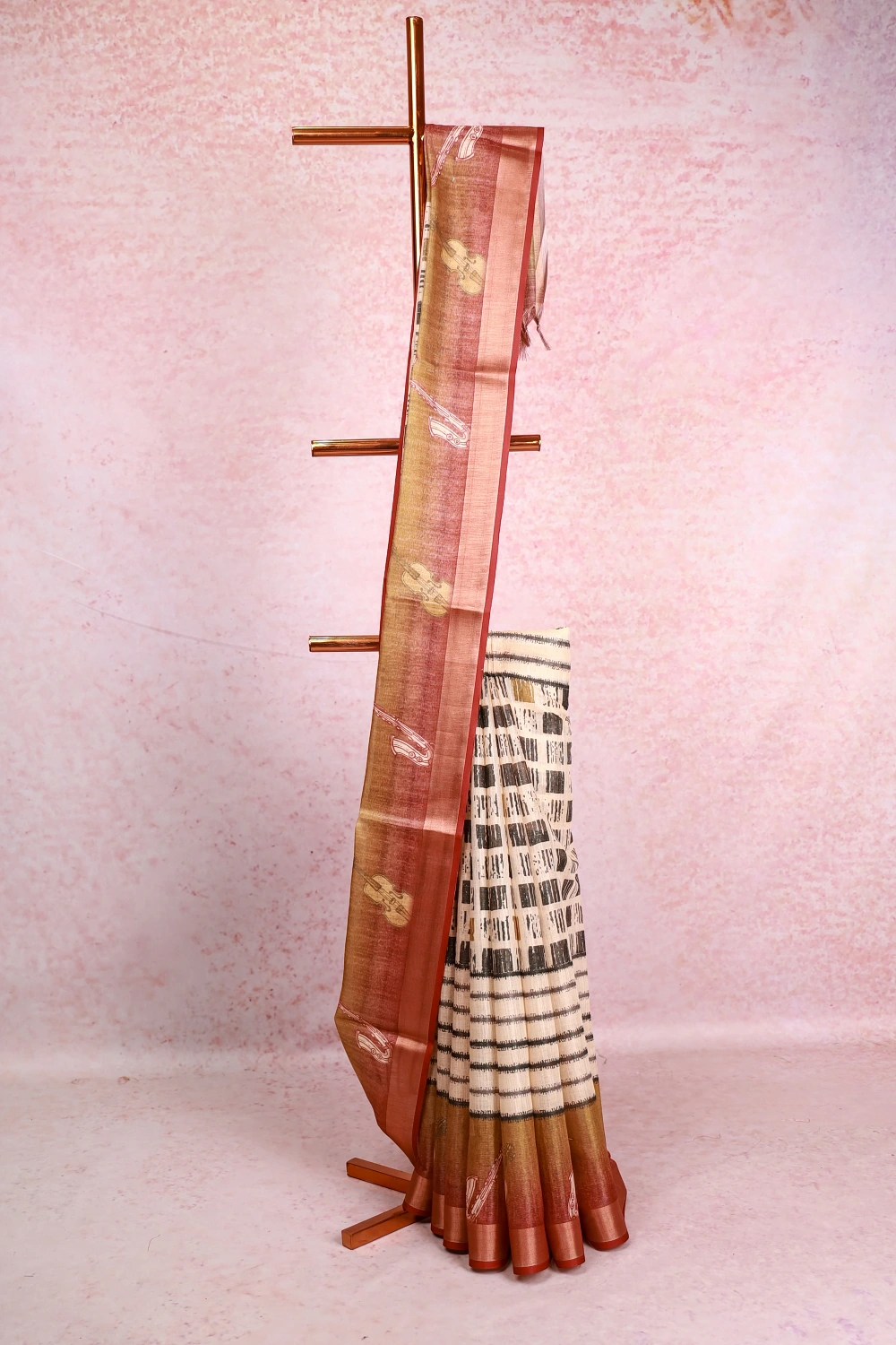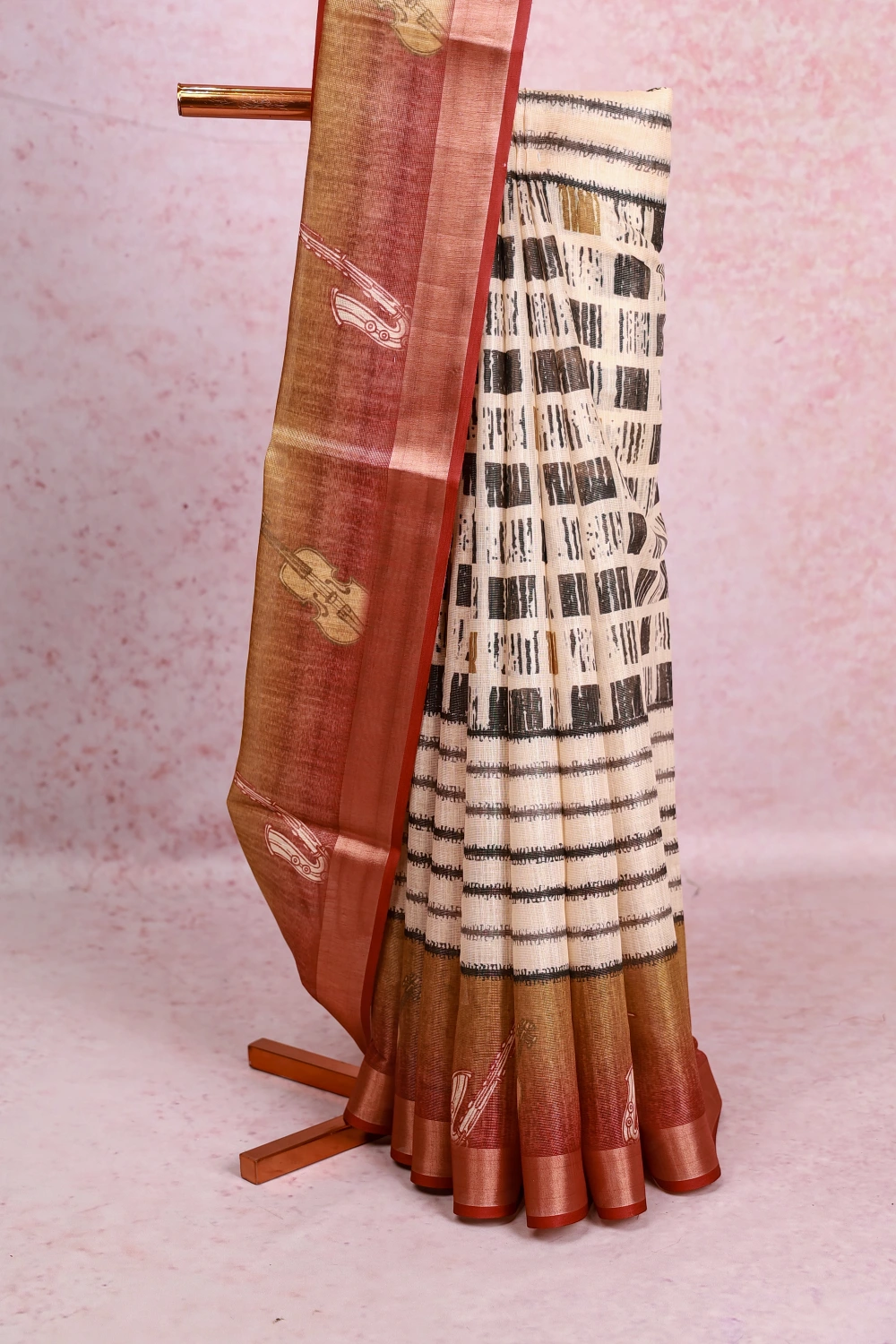 Cream Tissue Jute Printed Saree with Zari Border. Includes Un stitched Blouse