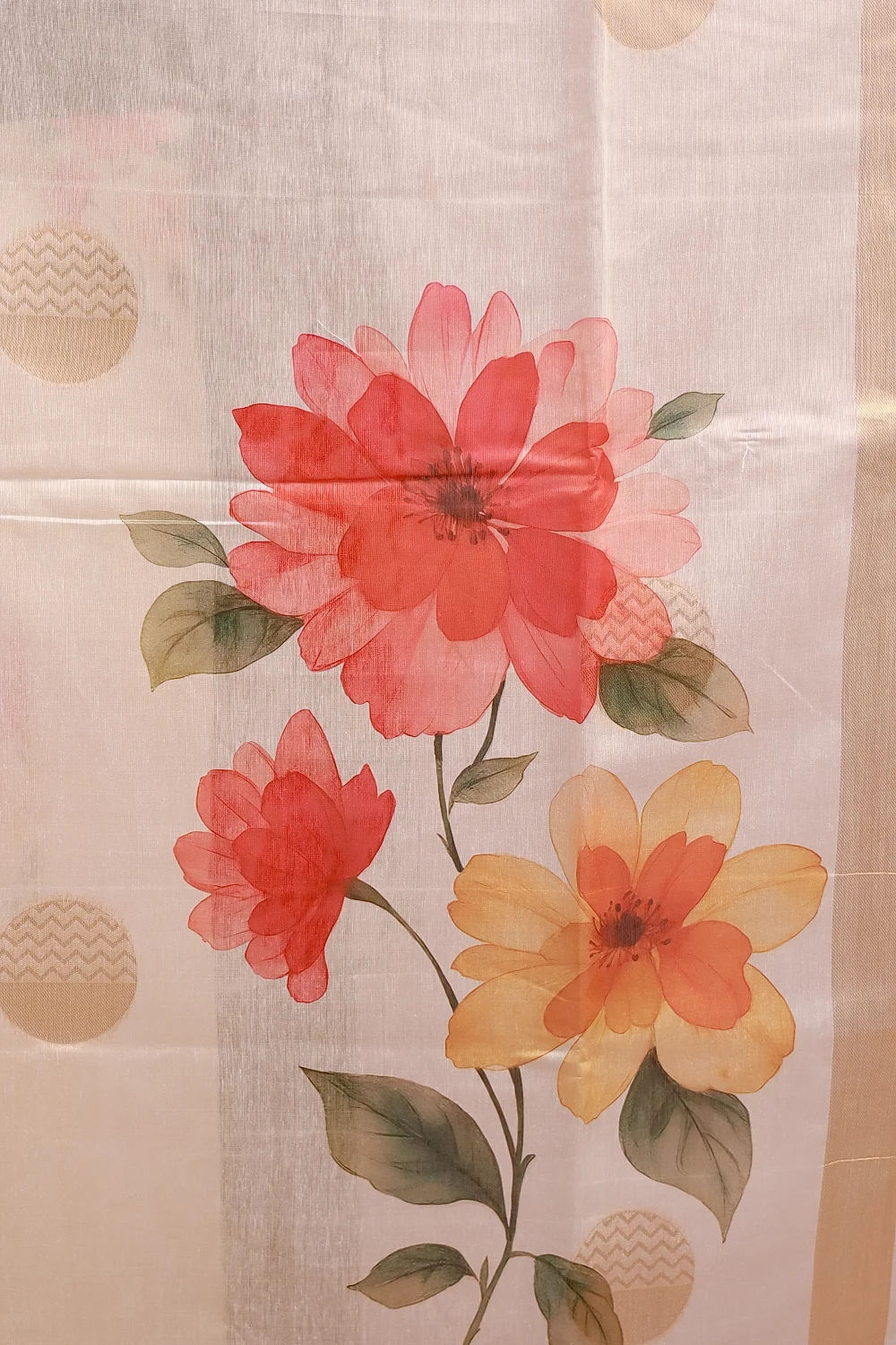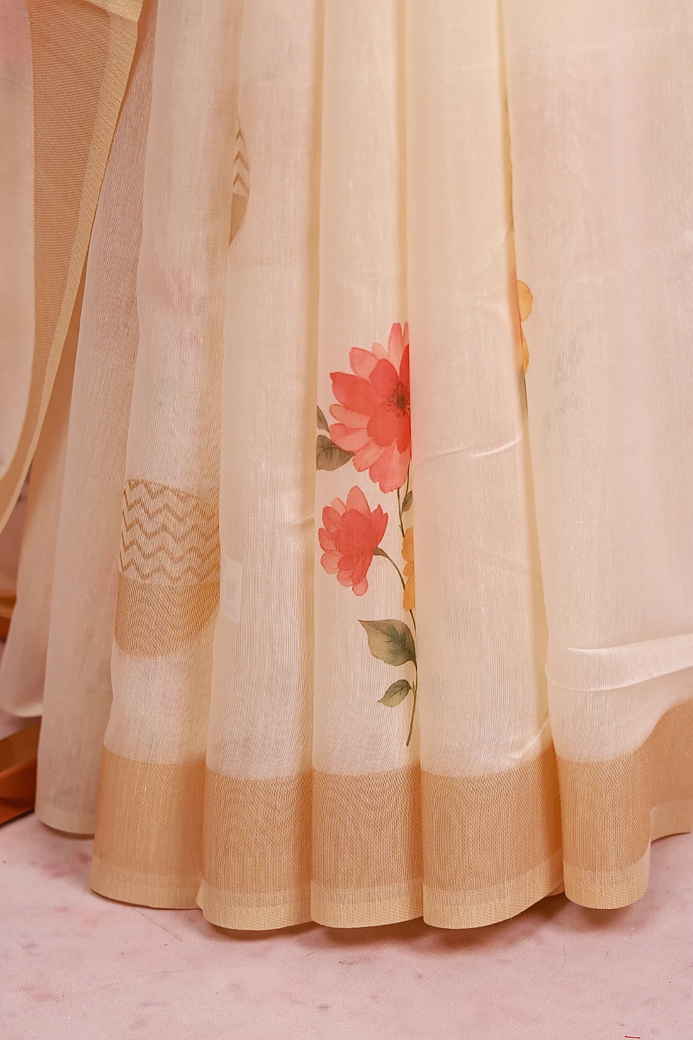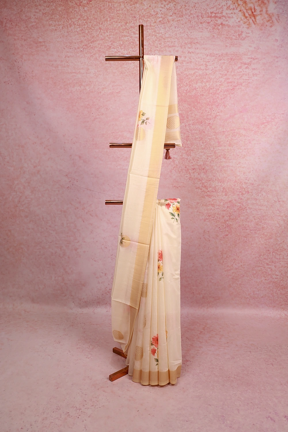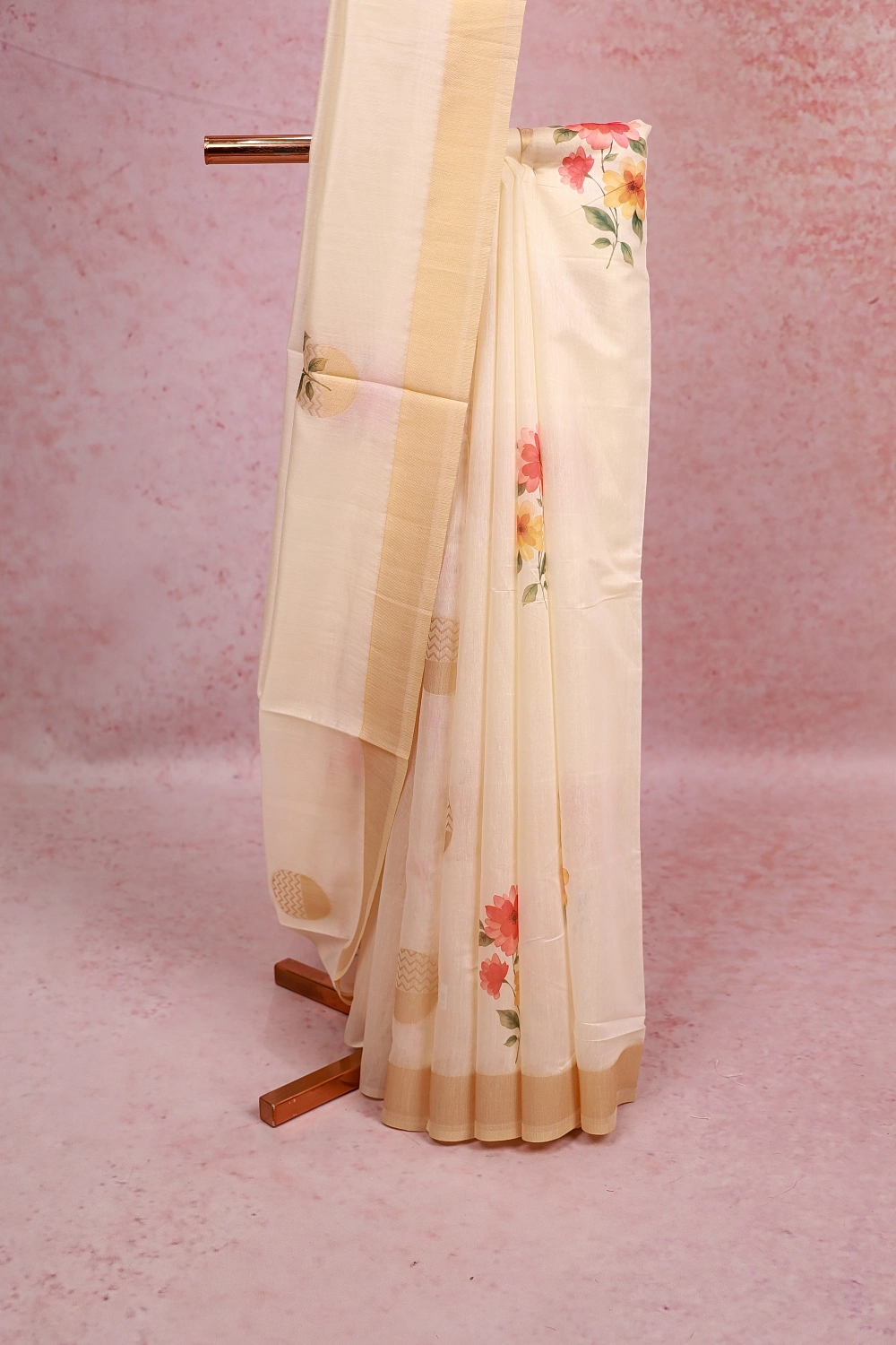 Cream Tissue Kerala Floral Design Saree with Zari Border. Includes Unstitched Blouse