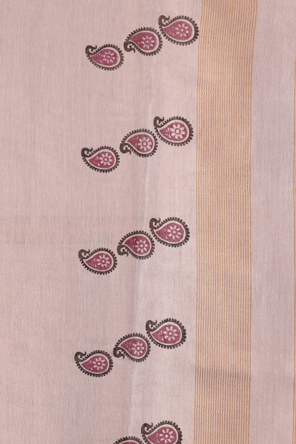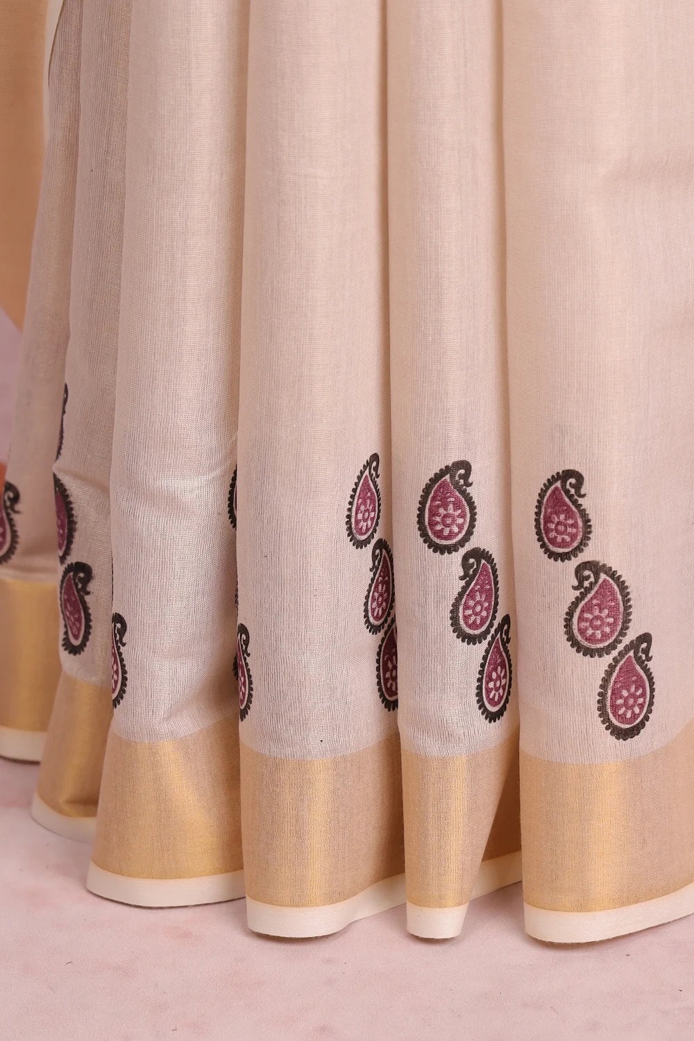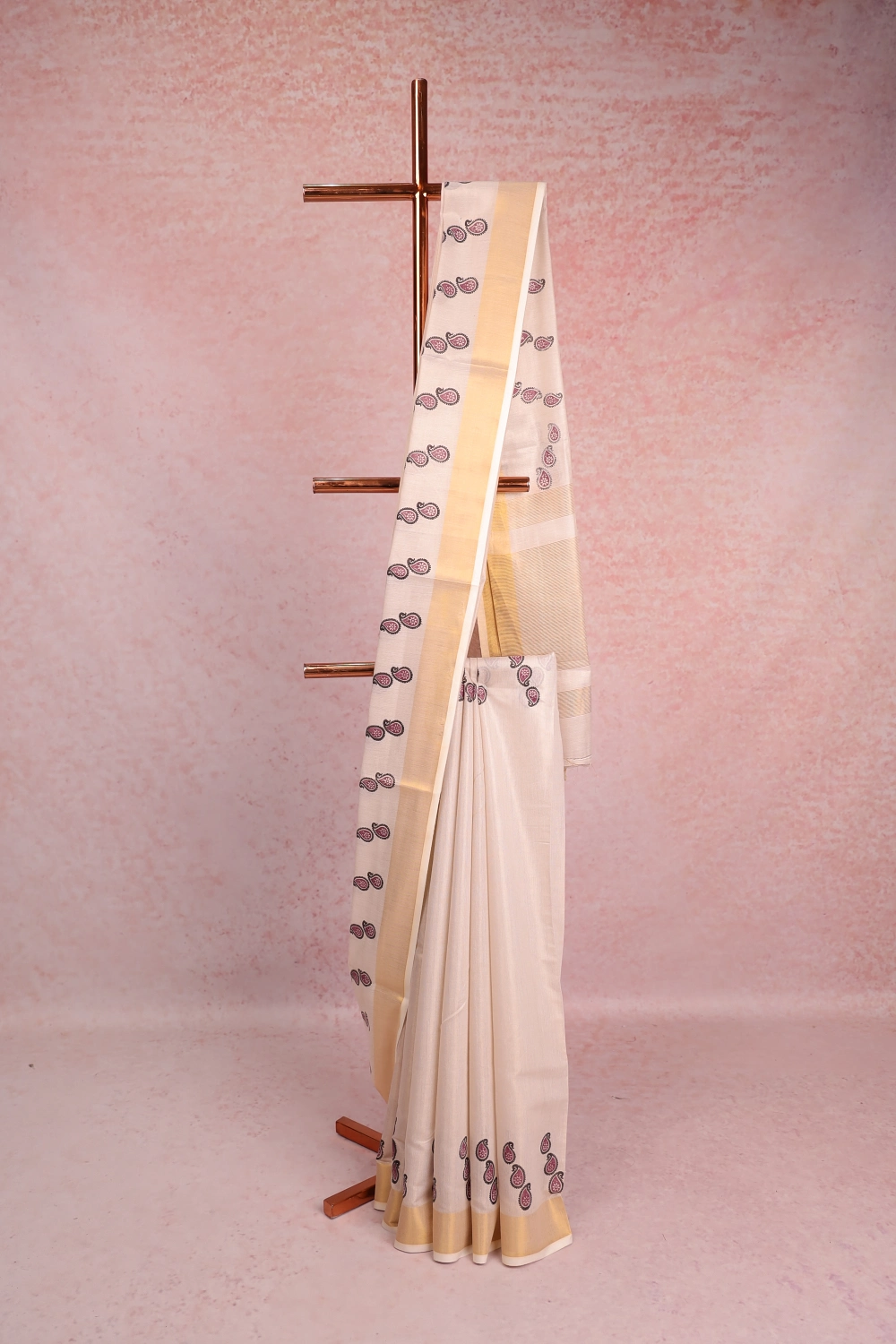 Cream Tissue Kerala Plain Body Saree With Golden Border. Includes Un Stitched Blouse