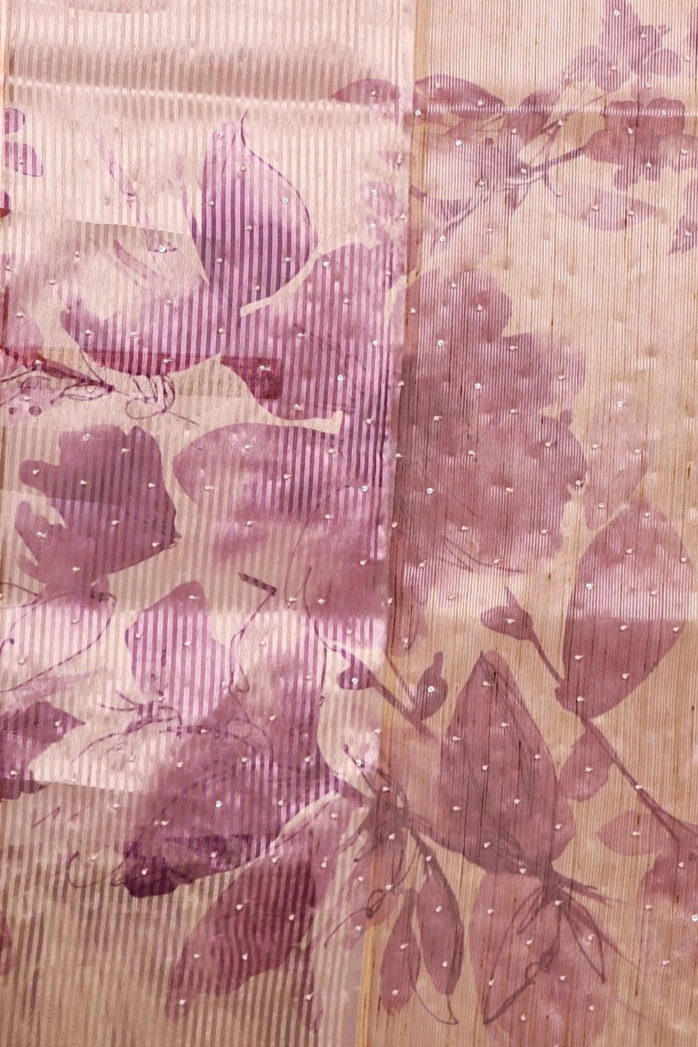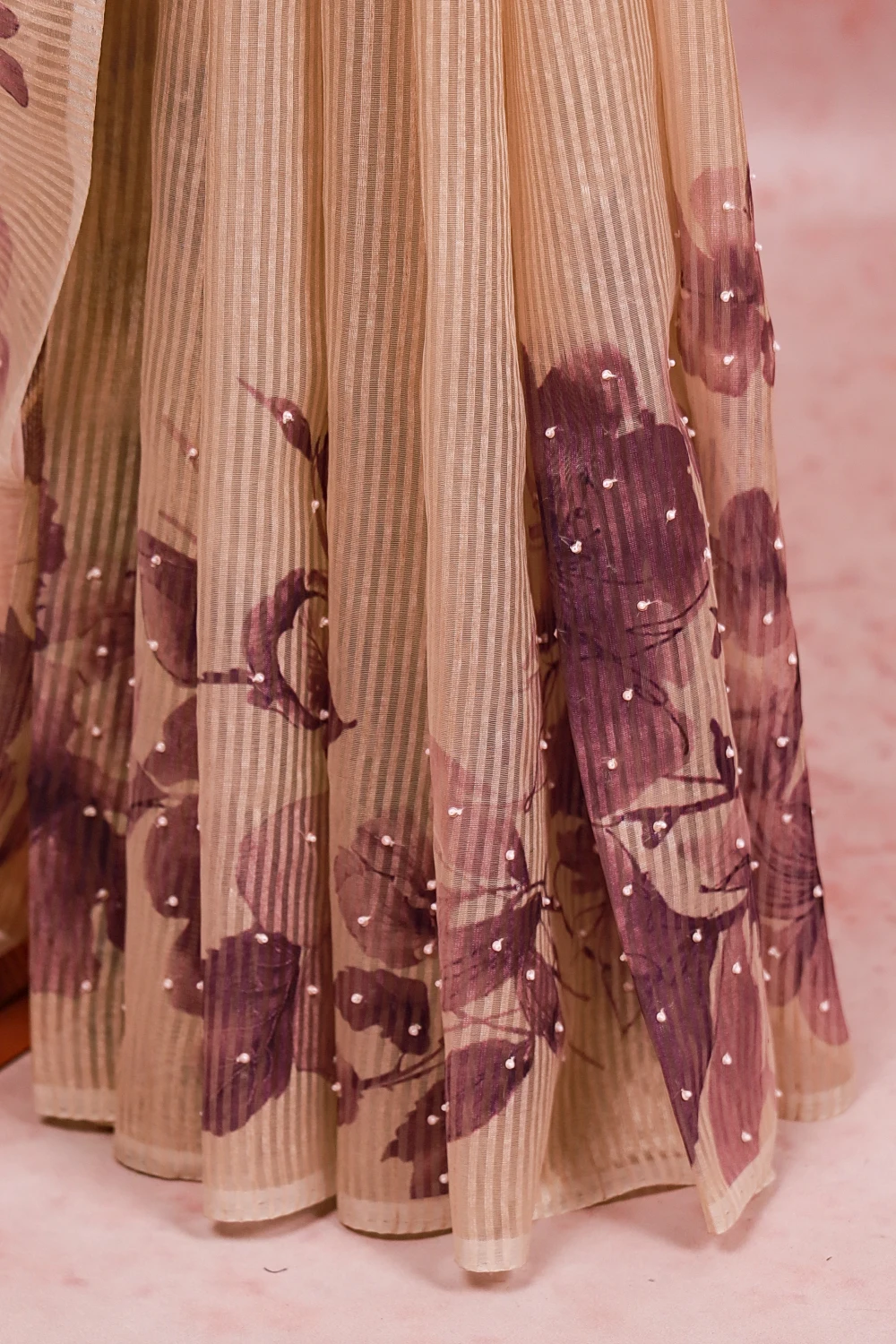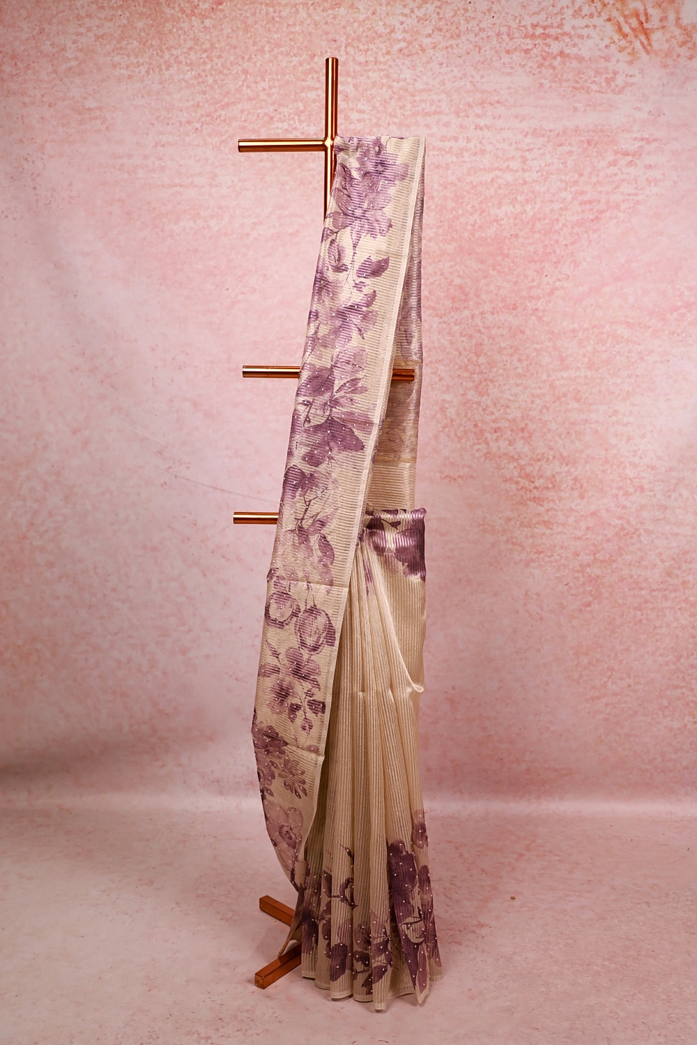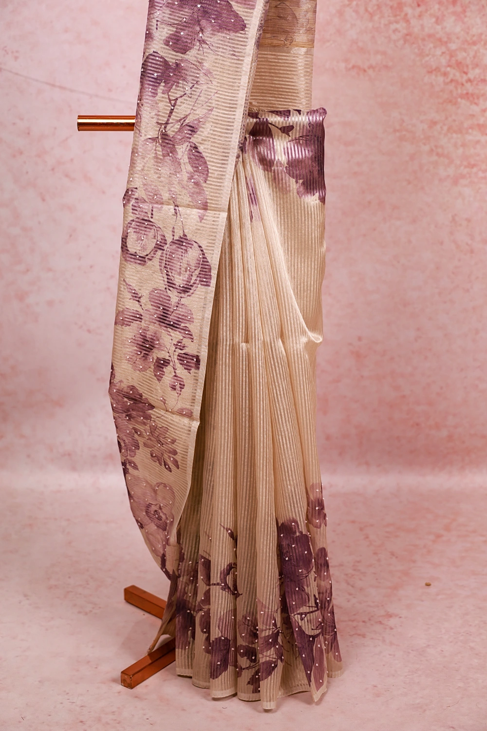 Cream Tissue Organza Plain Body Saree With Floral Border. Includes Unstitched Blouse