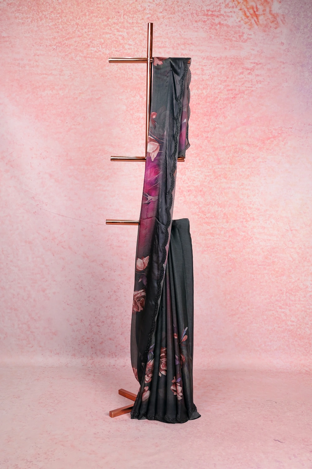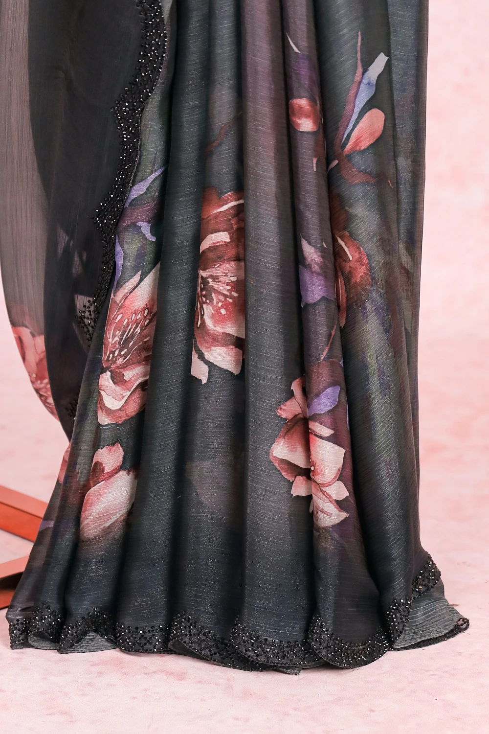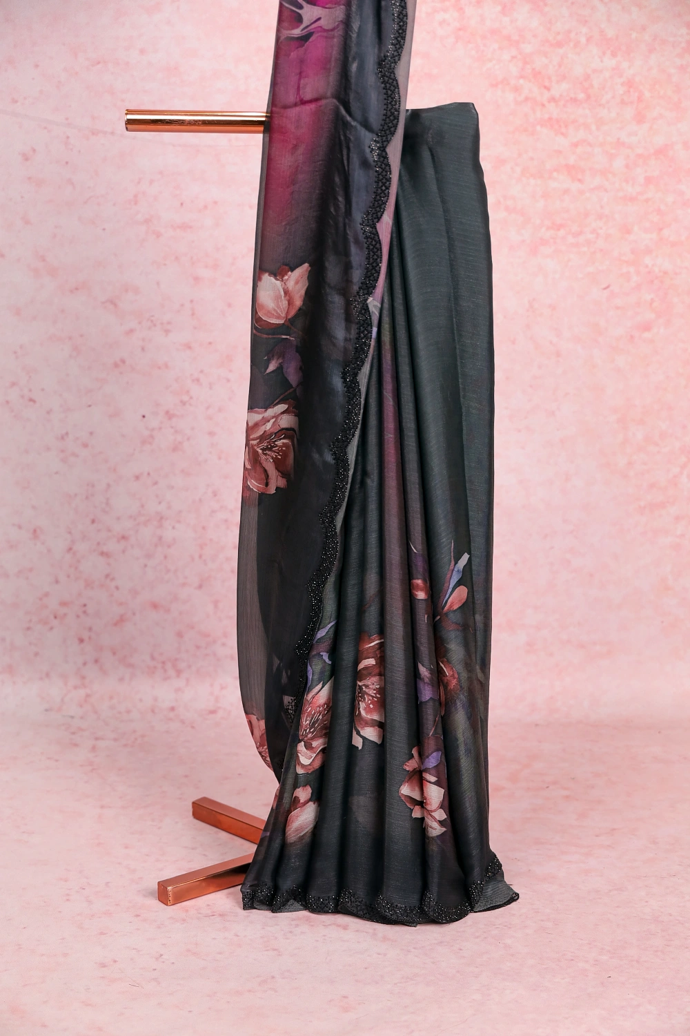 Dark Ash Organza Printed Saree with Scallop Border. Includes Unstitched Blouse
