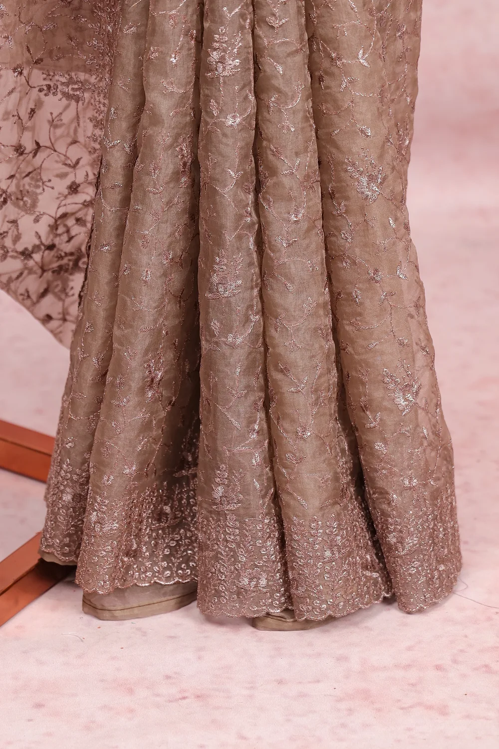 Dark Ash Organza Plain Work Saree with Scallop Border. Includes Unstitched Blouse