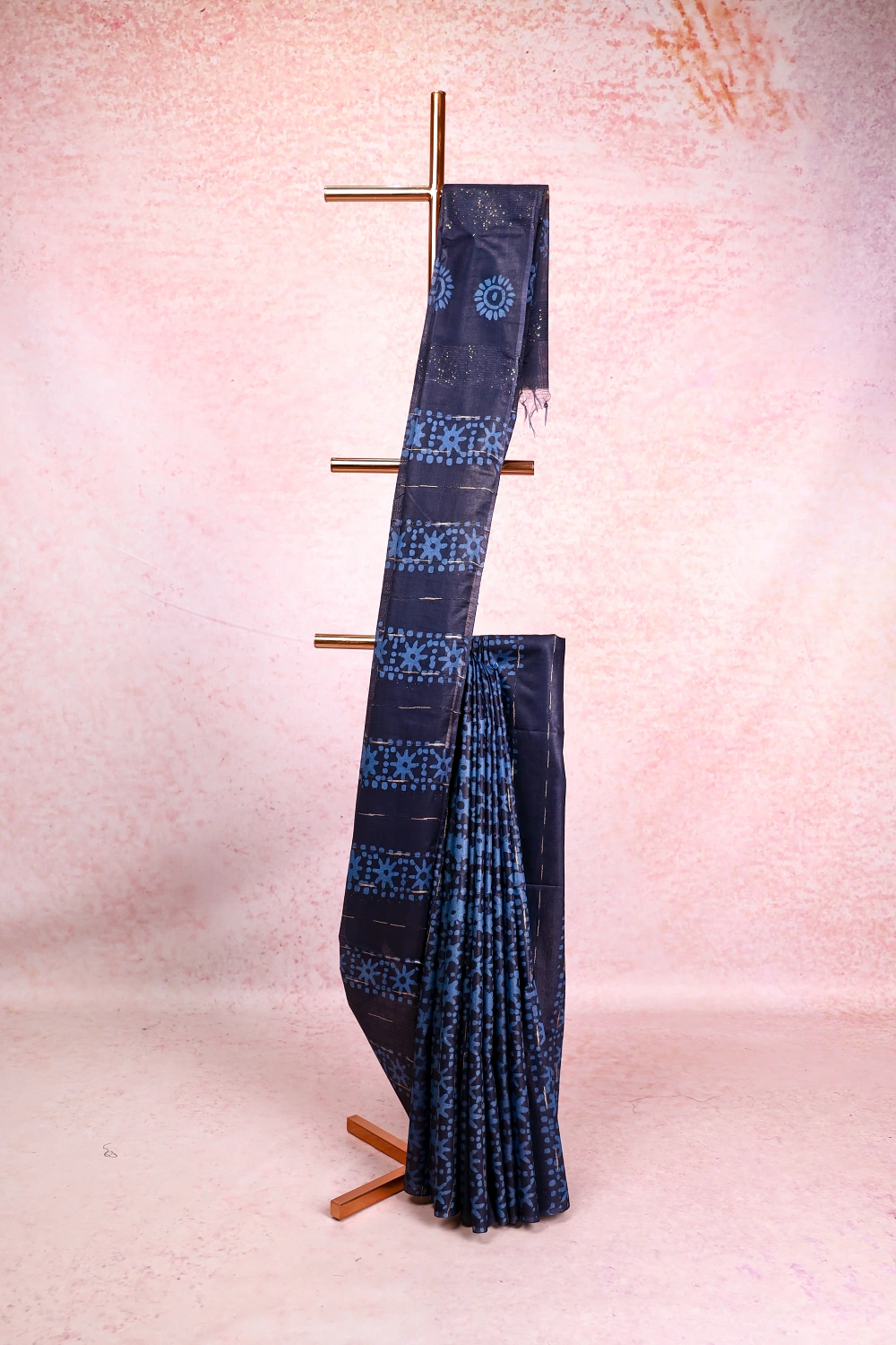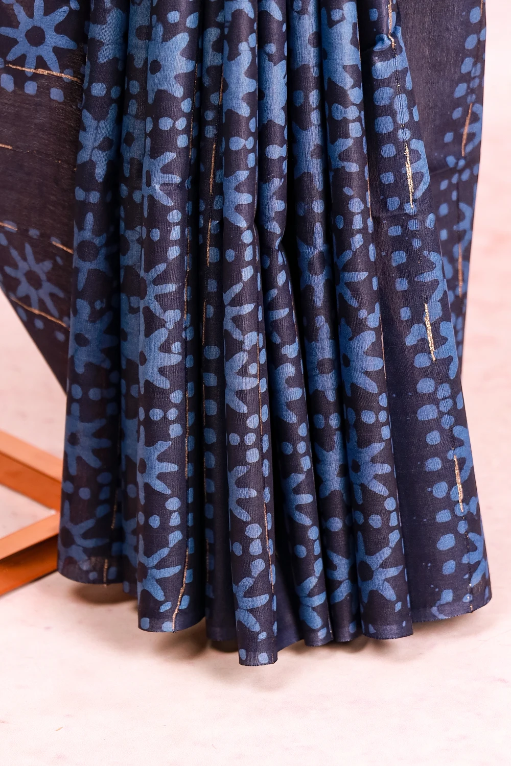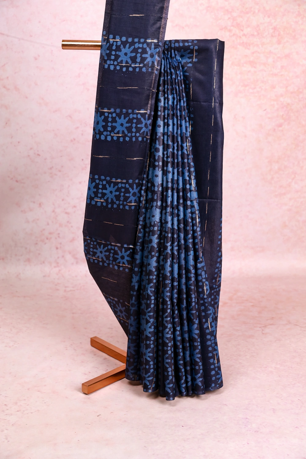 Dark Blue Semi Tussar Bandhani Print Saree Without Border. Includes Unstitched Blouse