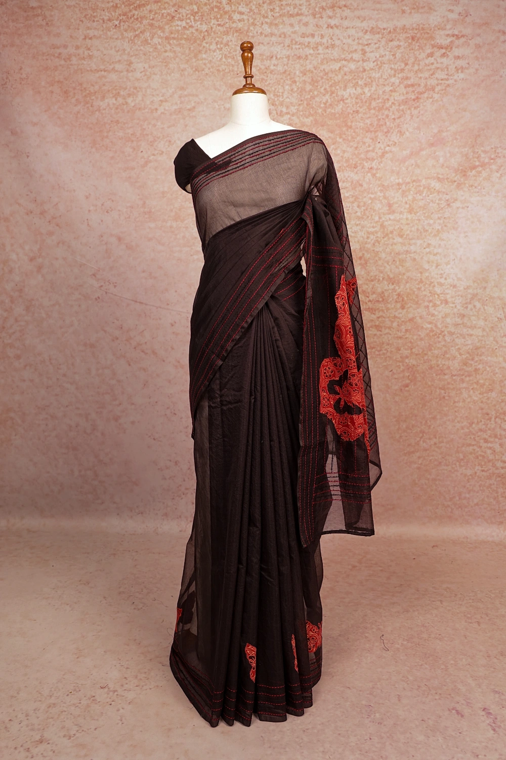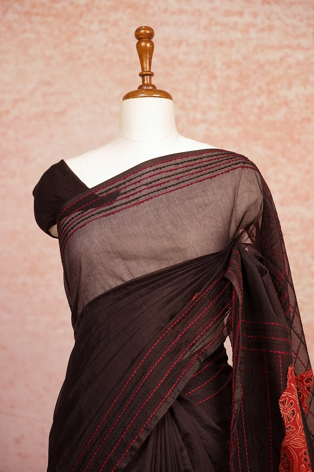 Dark Coffee Brown Silky Kota Plain Saree With Thread Border. Includes Unstitched Blouse