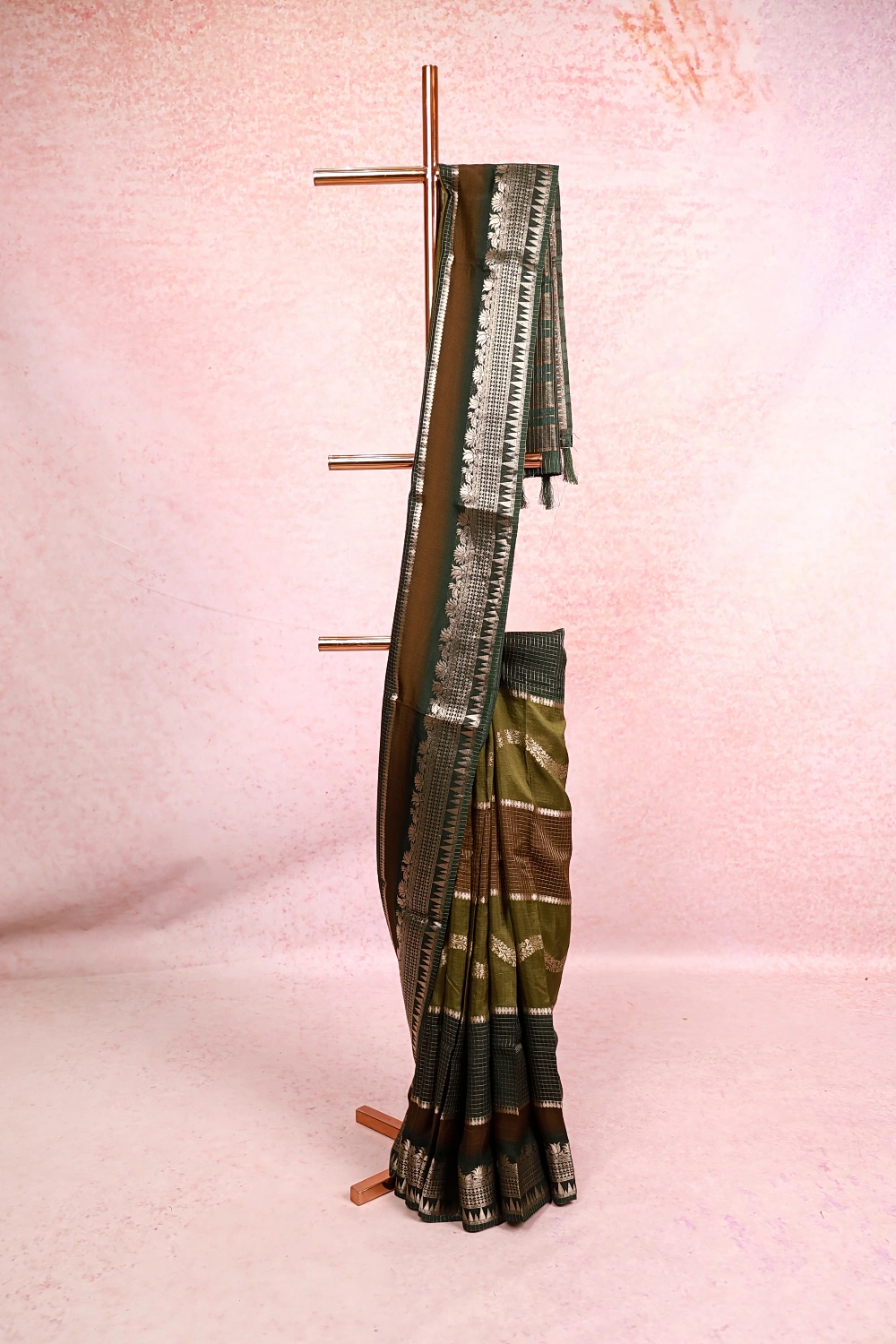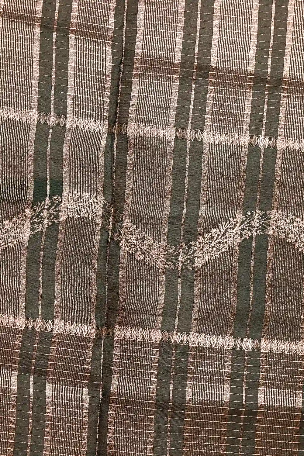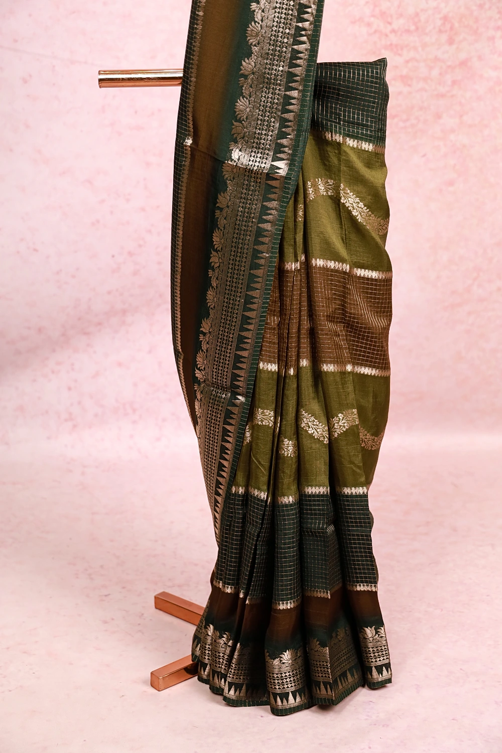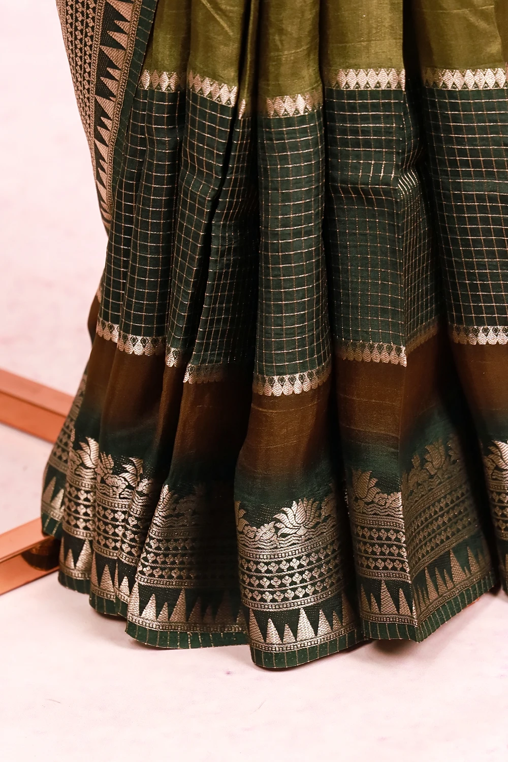 Dark Green And Moss Green Semi Silk Check And Zari Work Saree With Banarasi Border. Includes Unstitched Blouse