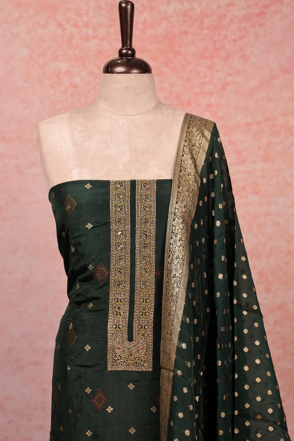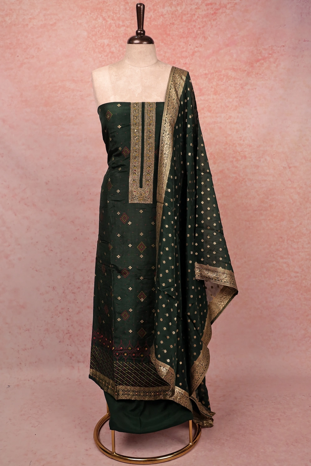 Dark Green Banarasi Banarasi Design Unstitched Churidar Material. Includes Dupatta.