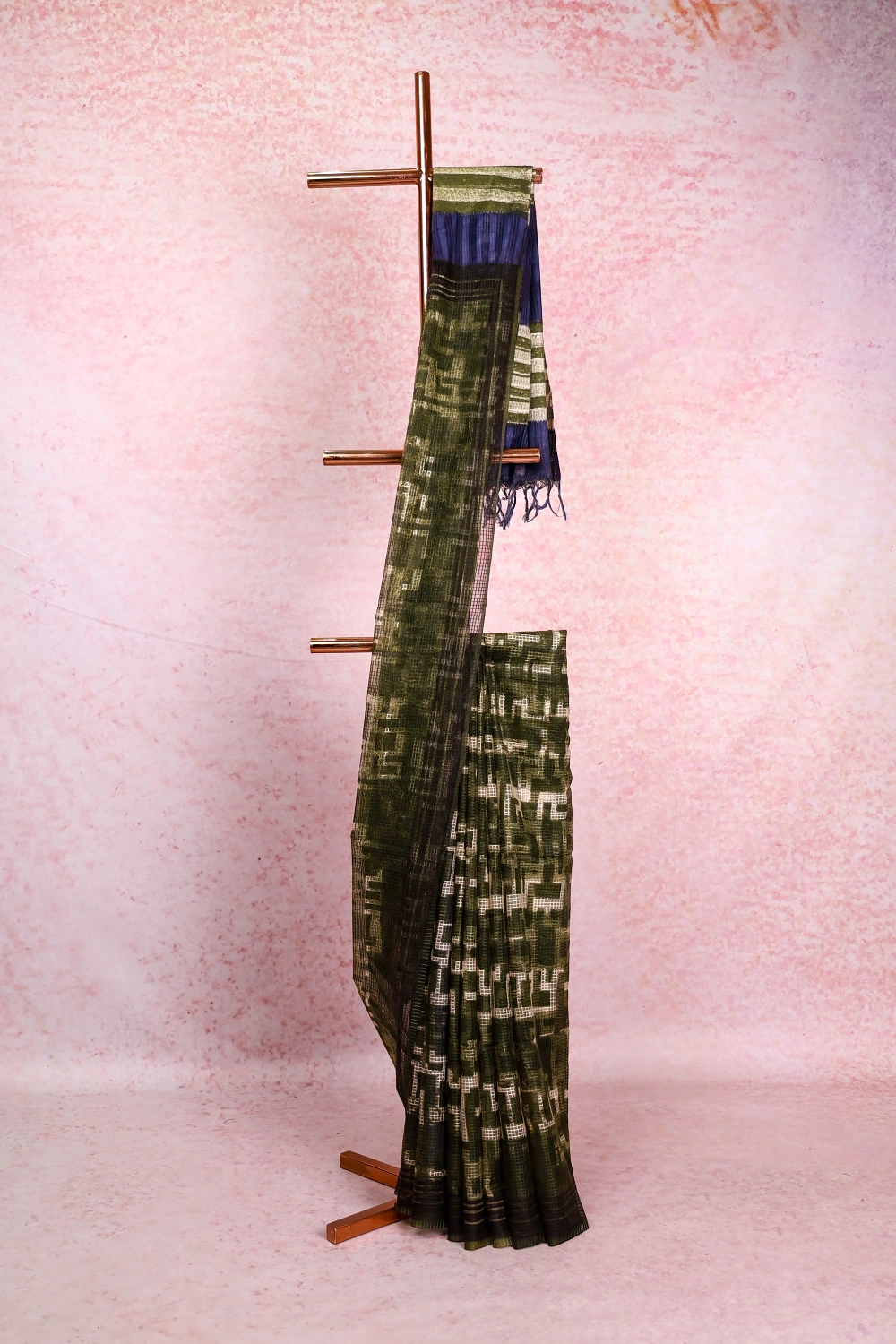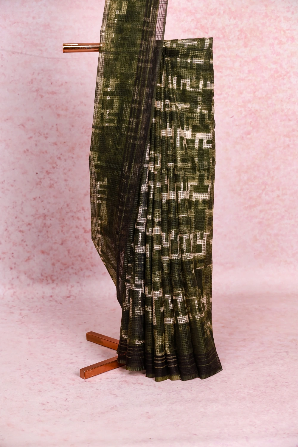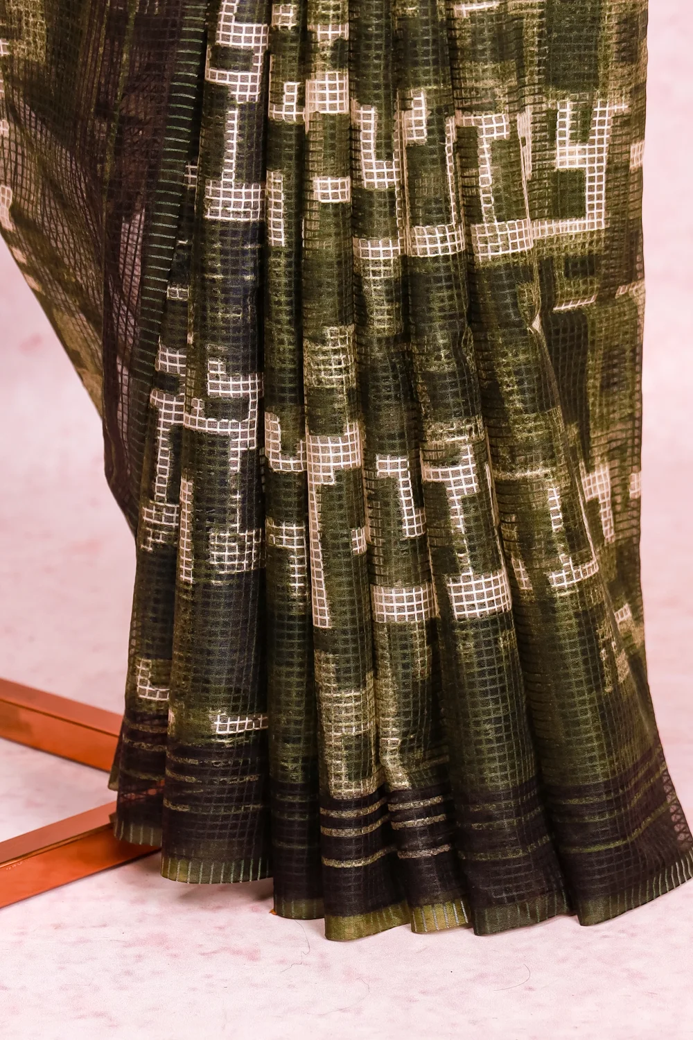 Dark Green Semi Tussar Check Saree With Check Border. Includes Unstitched Blouse