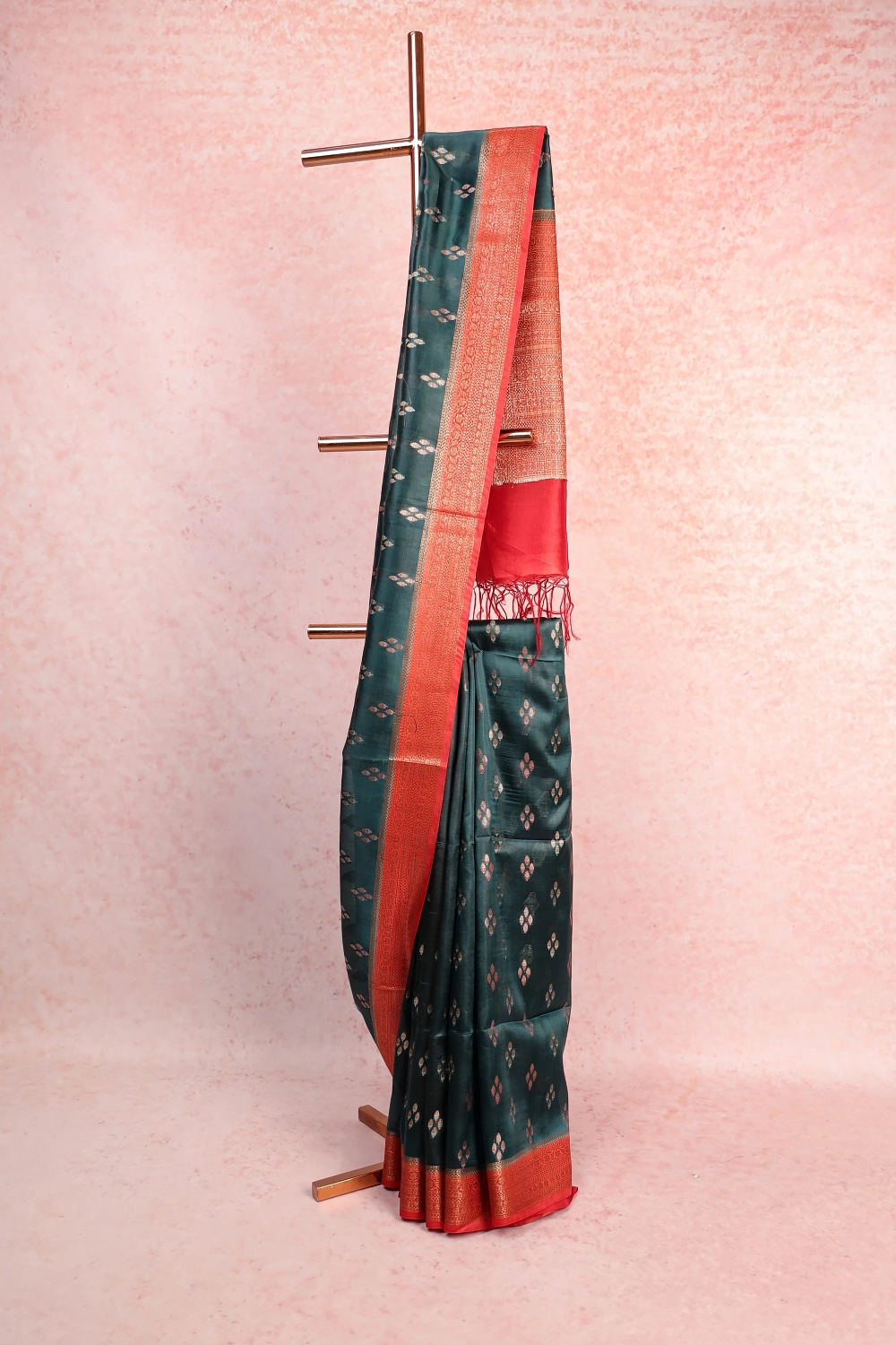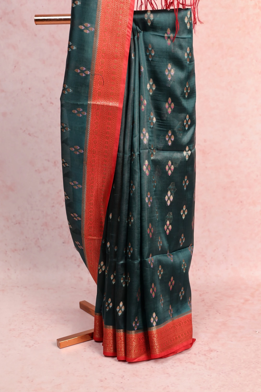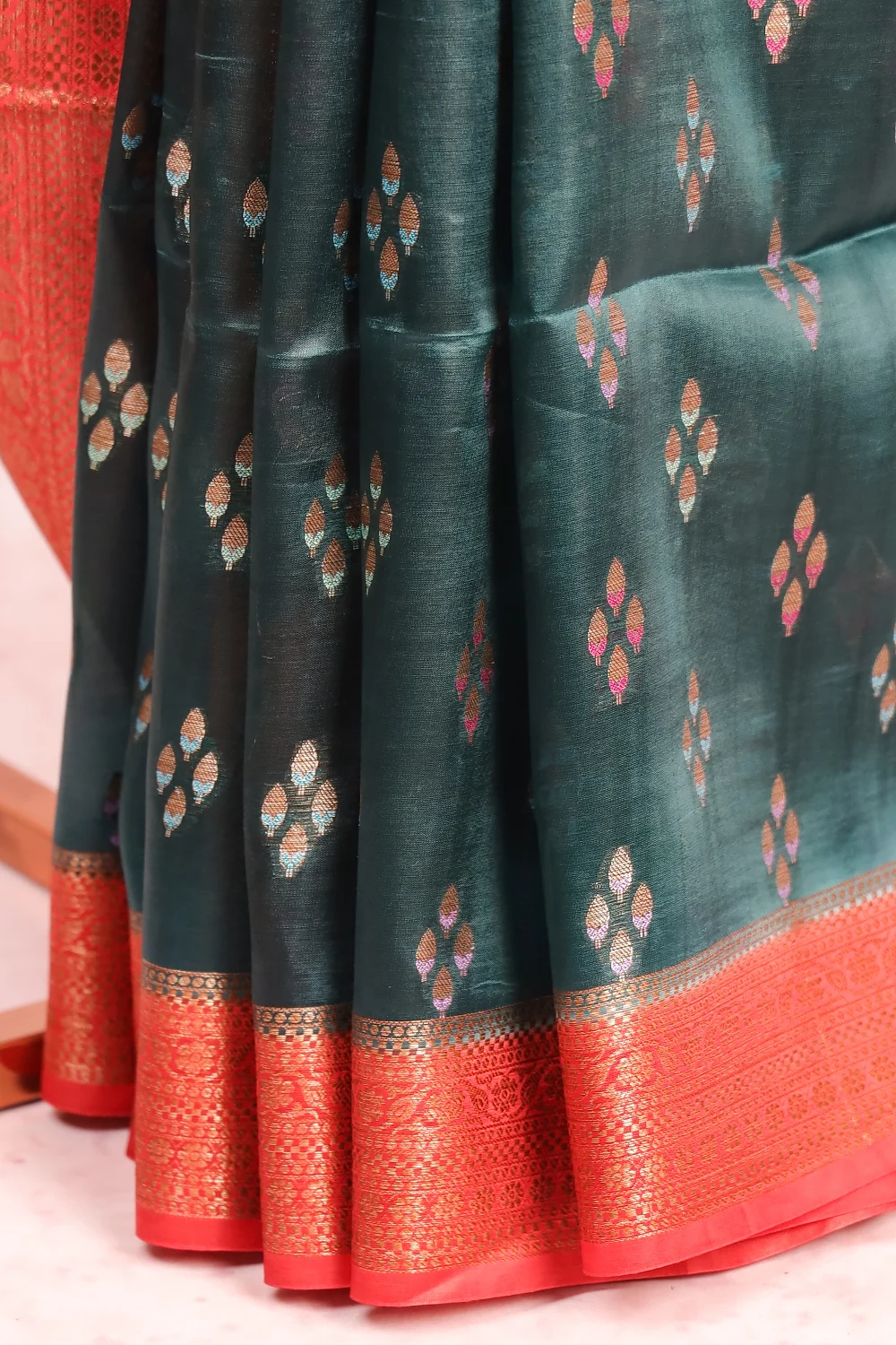 Dark Green Tussar Silk Butta Saree with Designer Border. Includes Un stitched Blouse