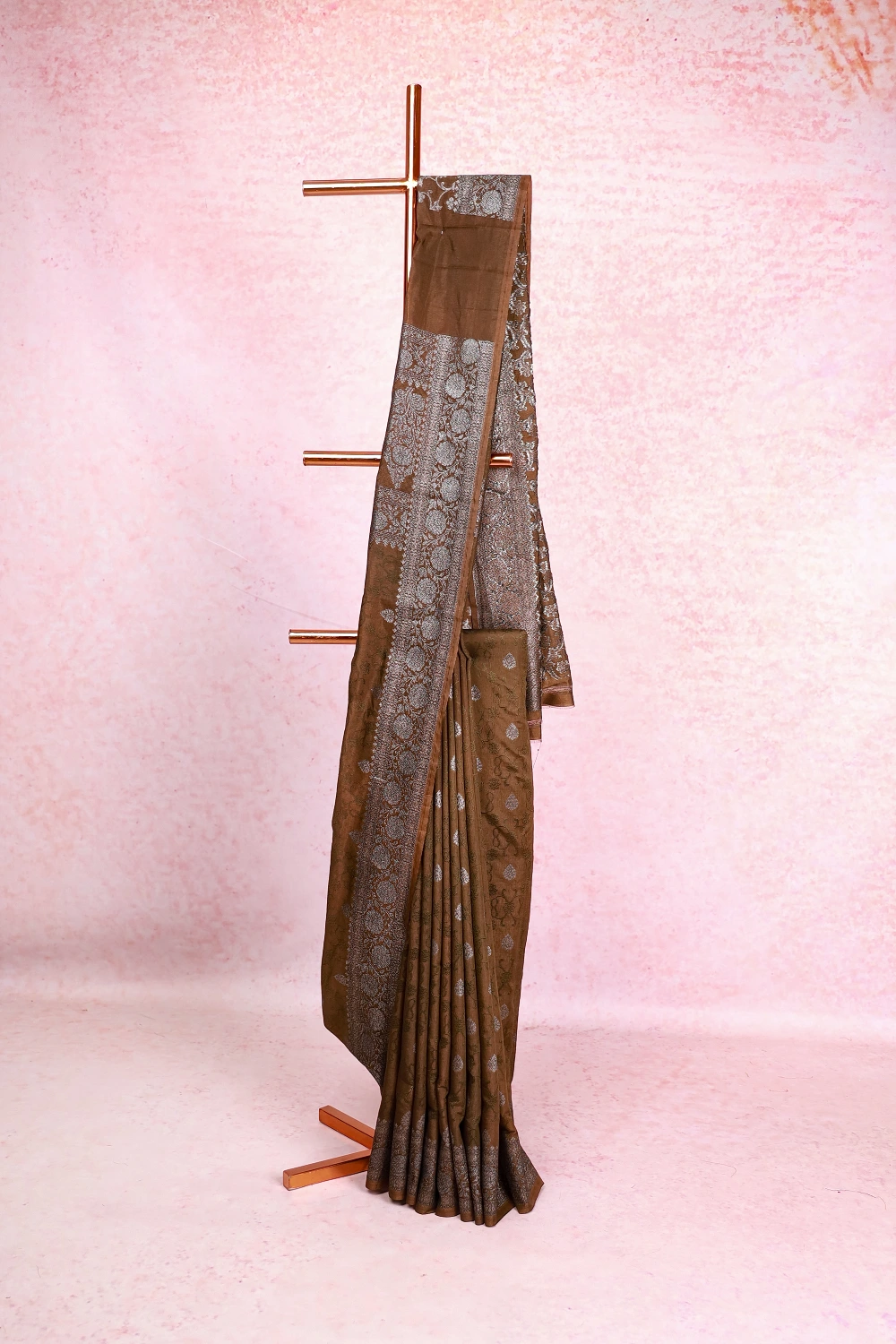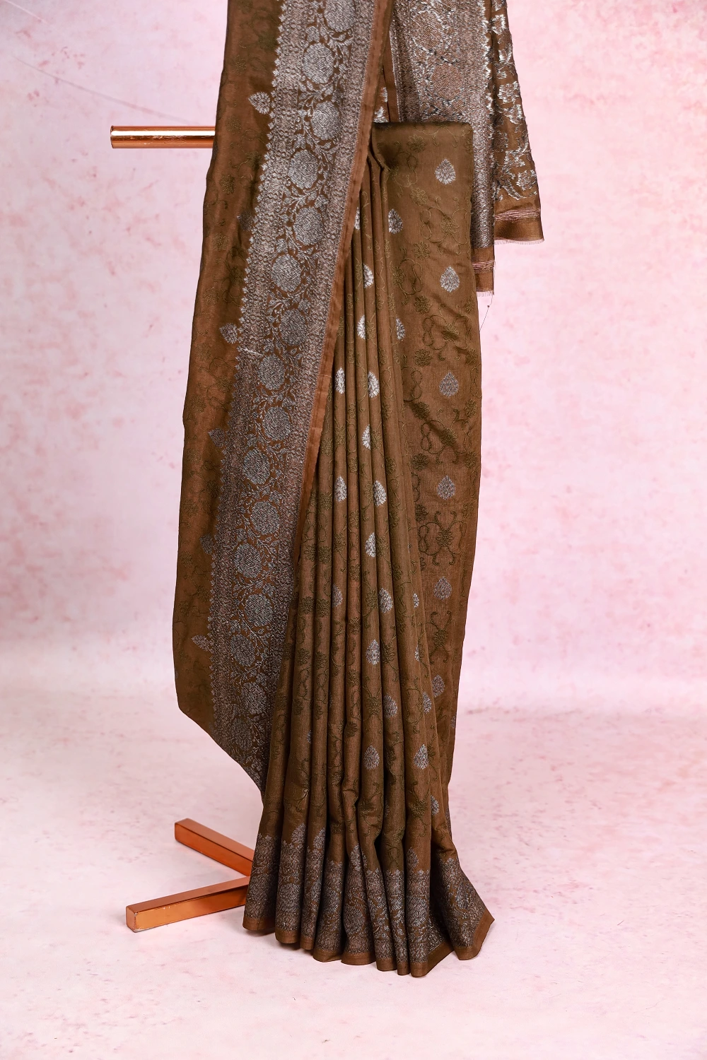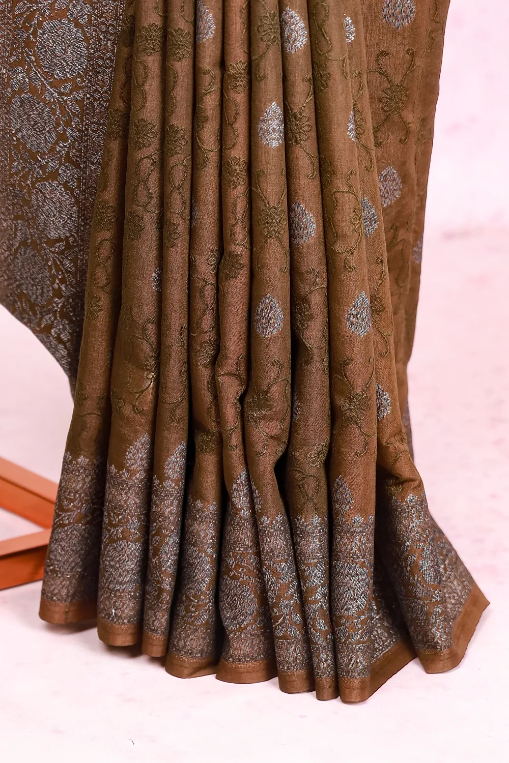 Dark Olive Green Semi Tussar Thread Design Saree with Zari Border. Includes Unstitched Blouse