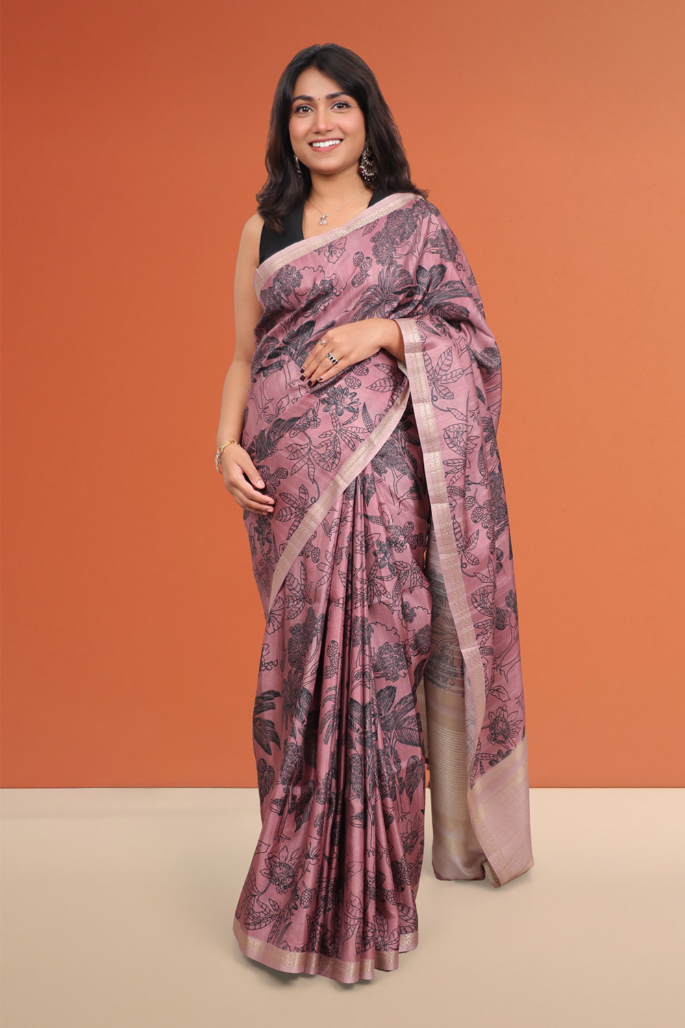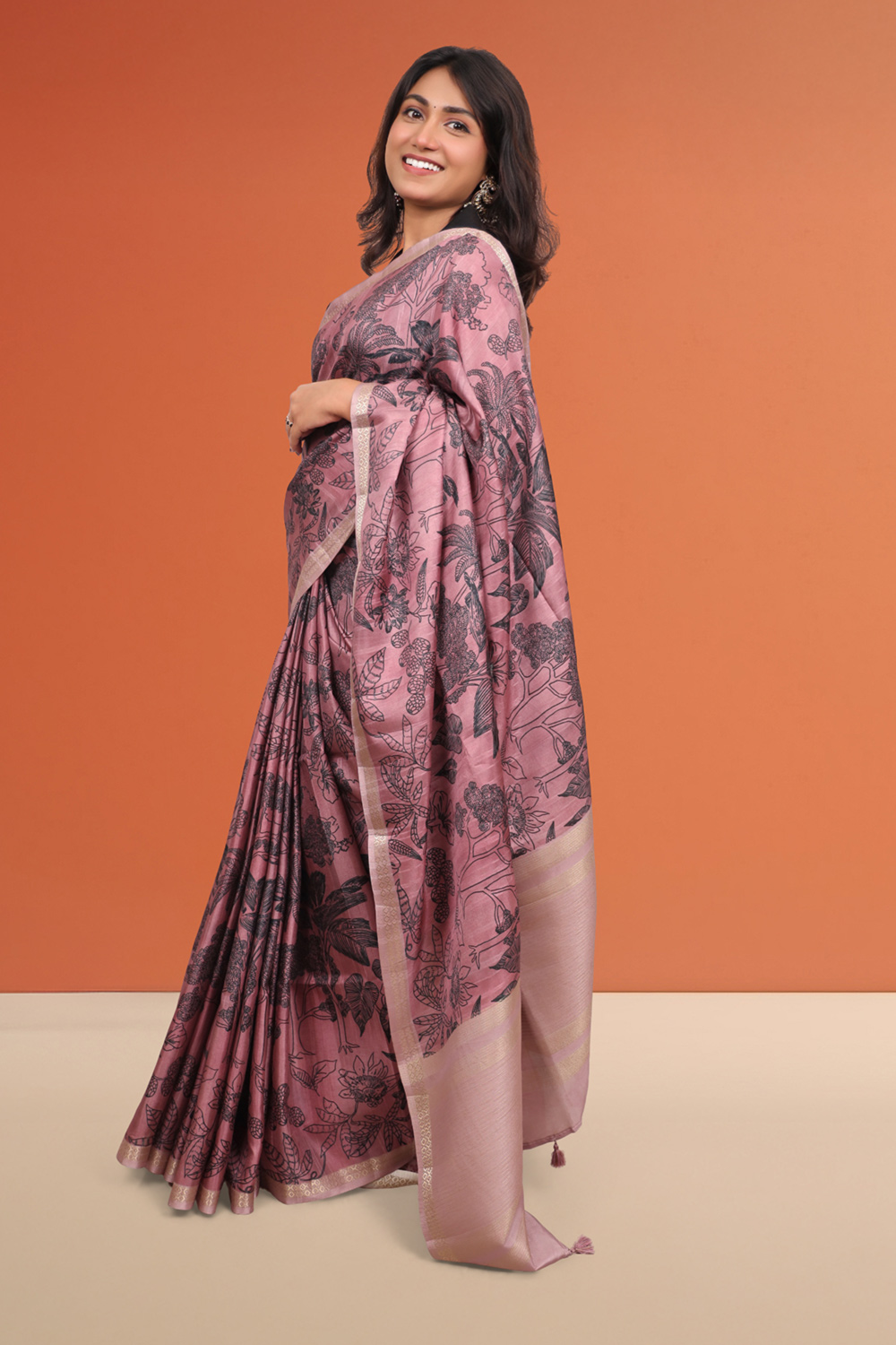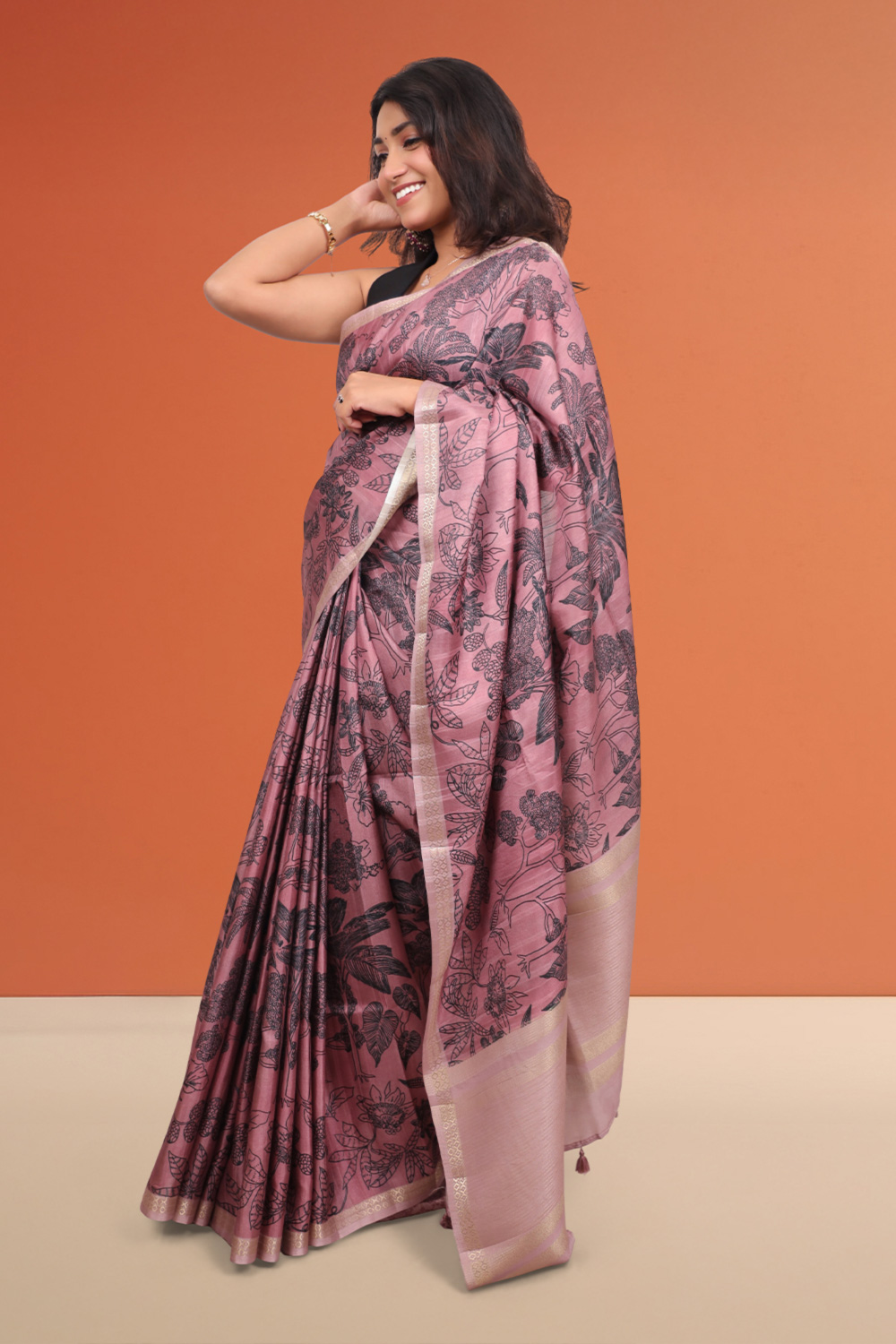 Dark Onion Pink Semi Tussar Printed Saree with Small border. Includes Unstitched Blouse