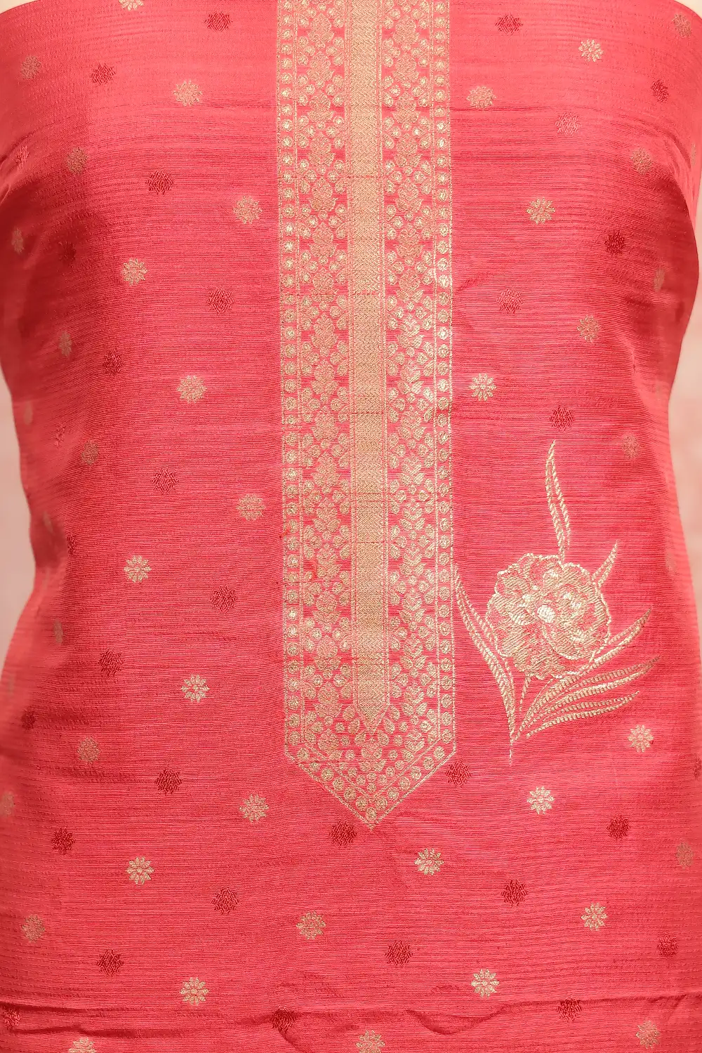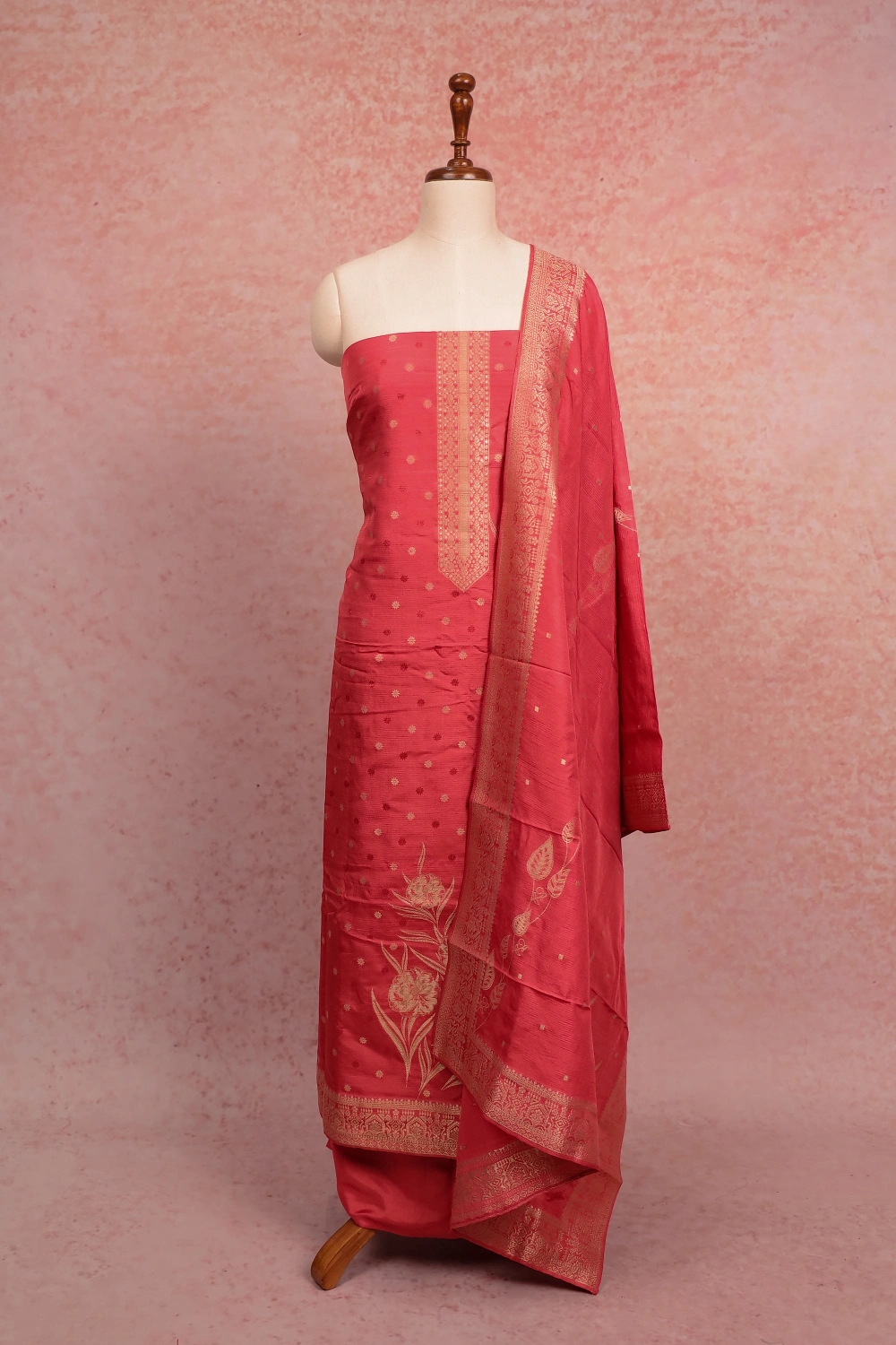 Dark Peach Banarasi Butta Unstitched Churidar Material. Includes Dupatta.