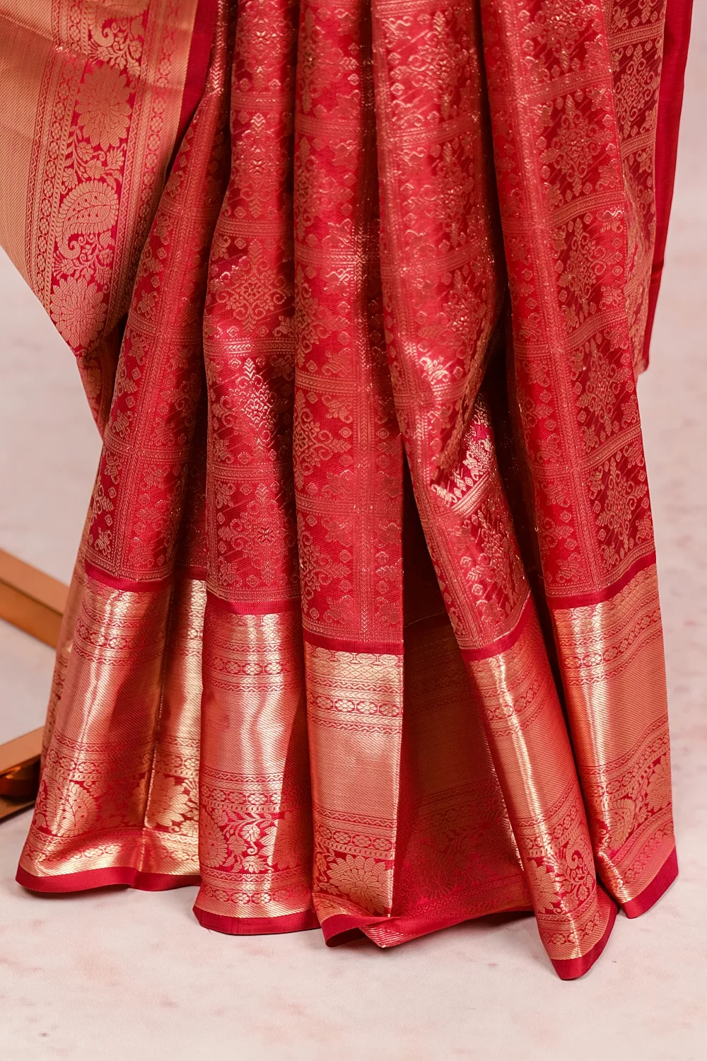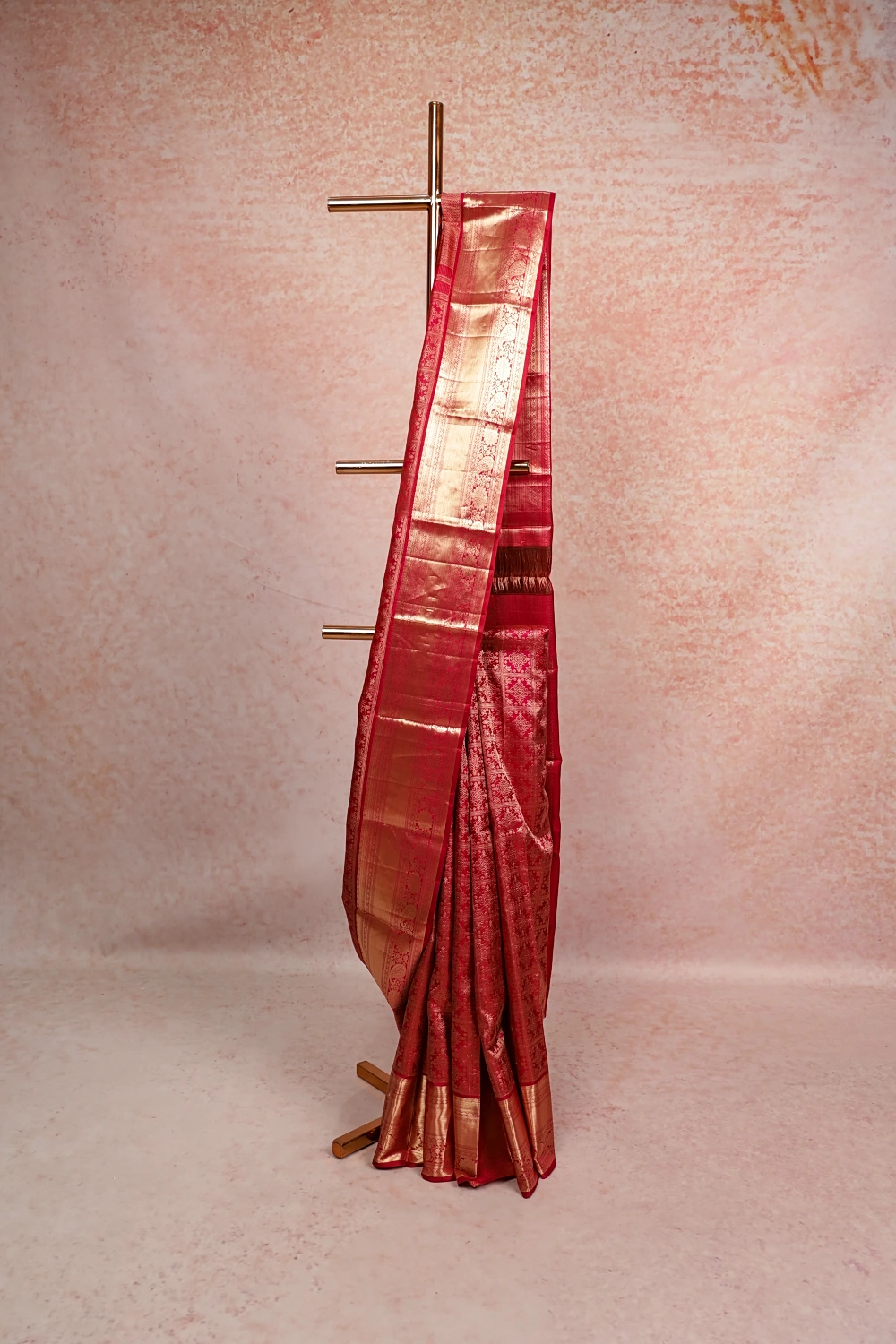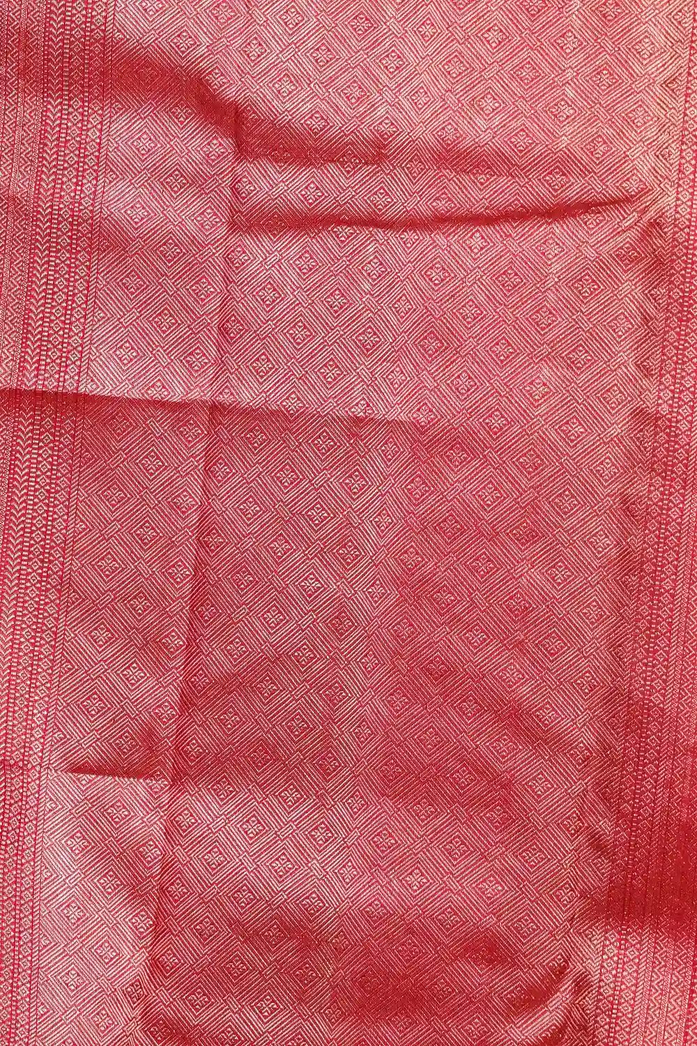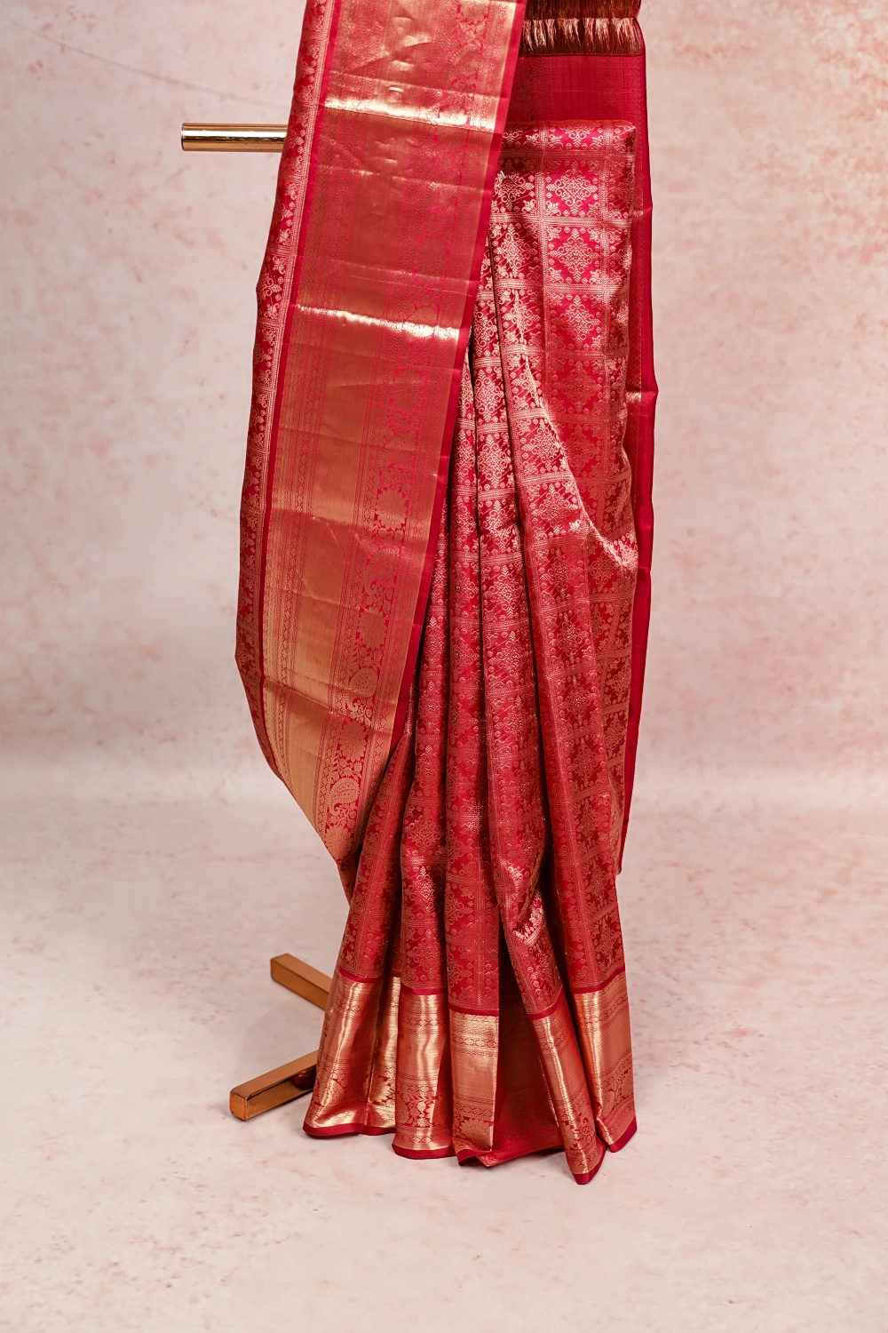 Dark Pink Kancheepuram Banarasi Design Saree with Traditional Zari Border. Includes Unstitched Blouse