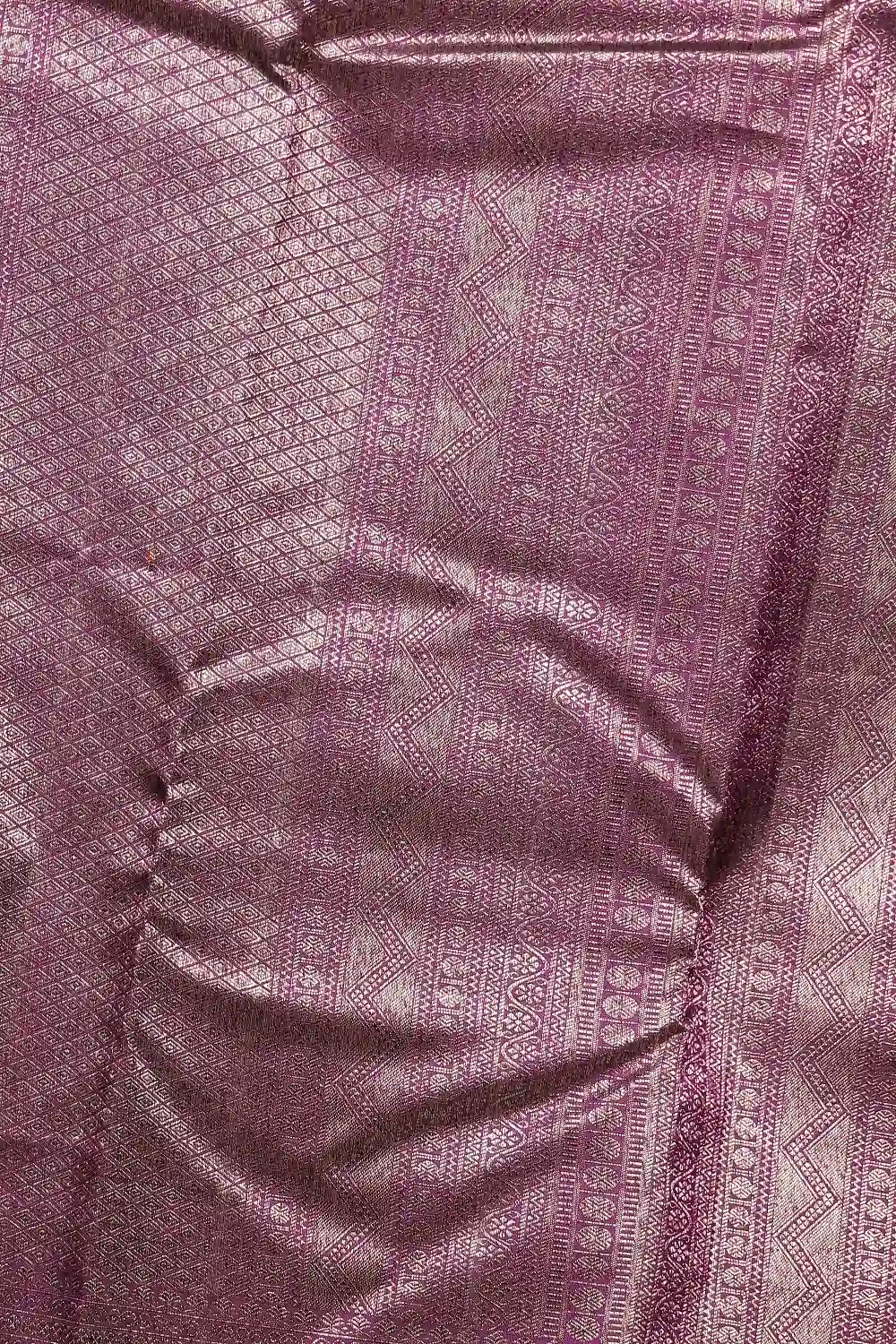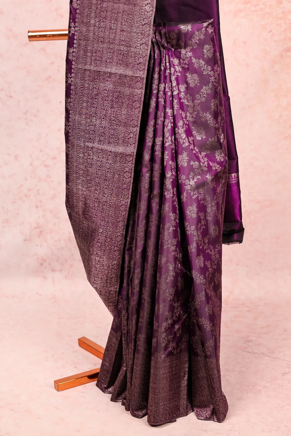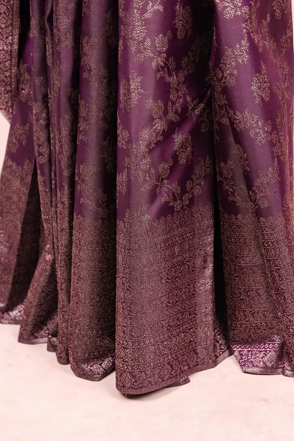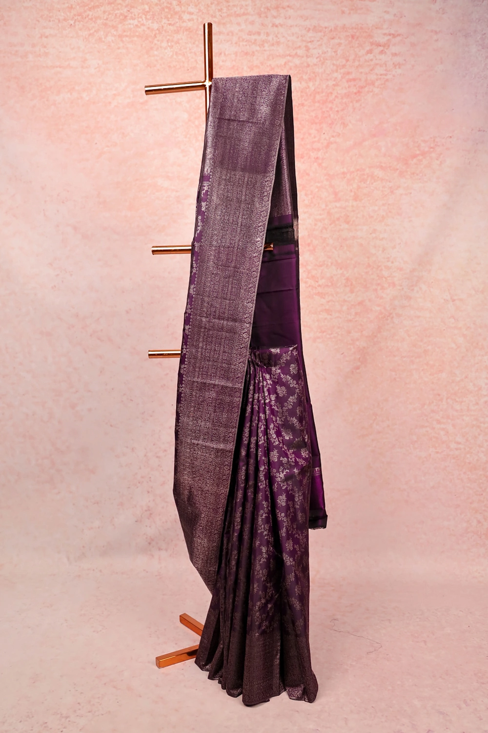 Dark Purple Kancheepuram Silk Banarasi Design Saree with Designer Border. Includes Unstitched Blouse