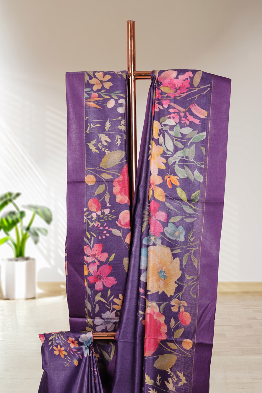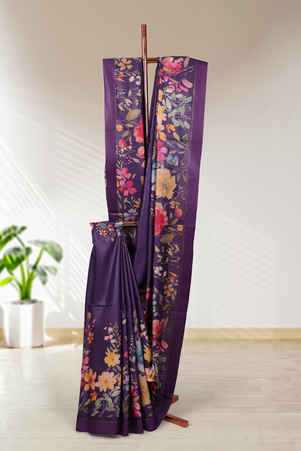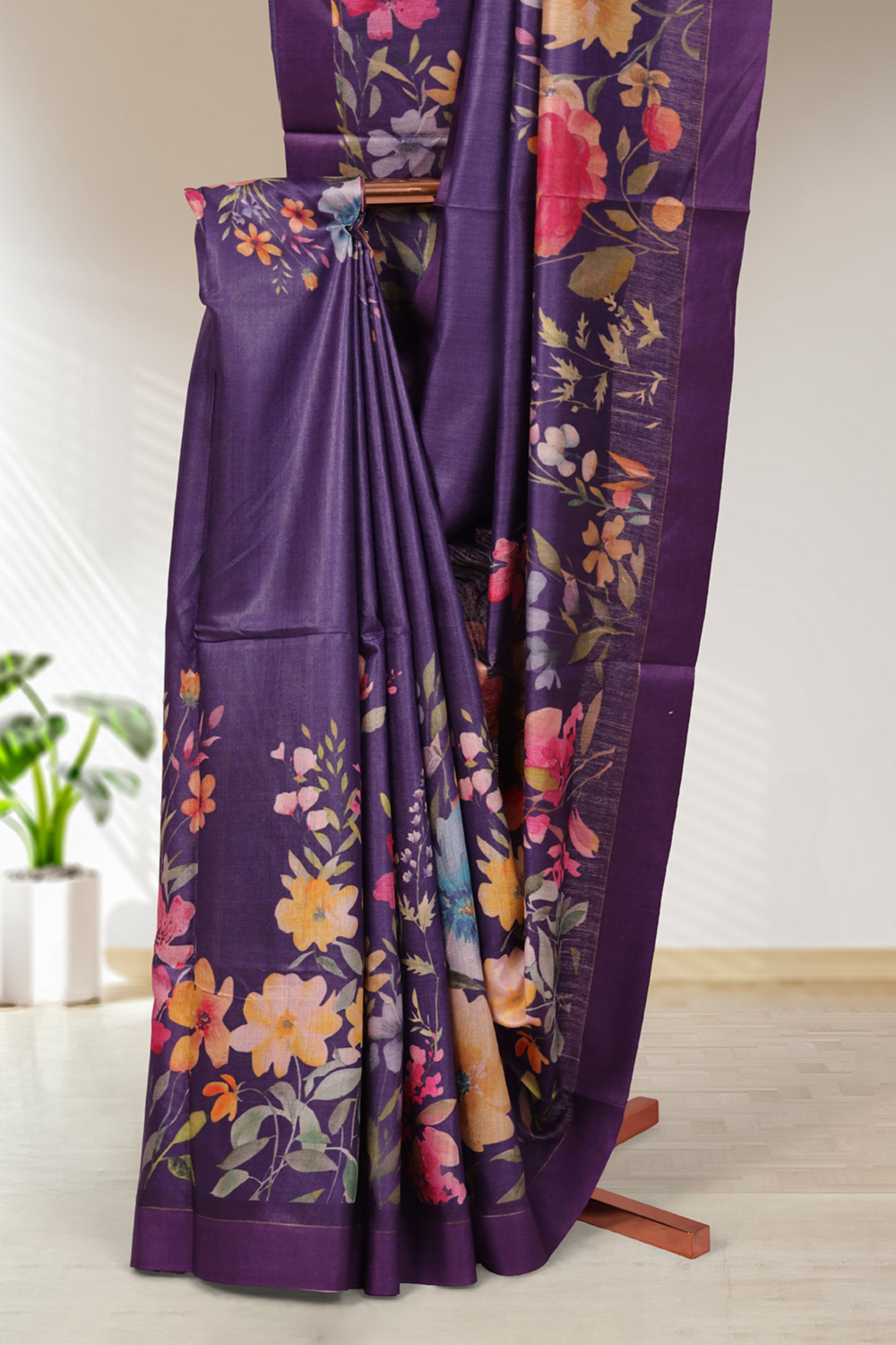 Dark Violet Tussar Silk Printed Saree with Plain border. Includes Unstitched Blouse