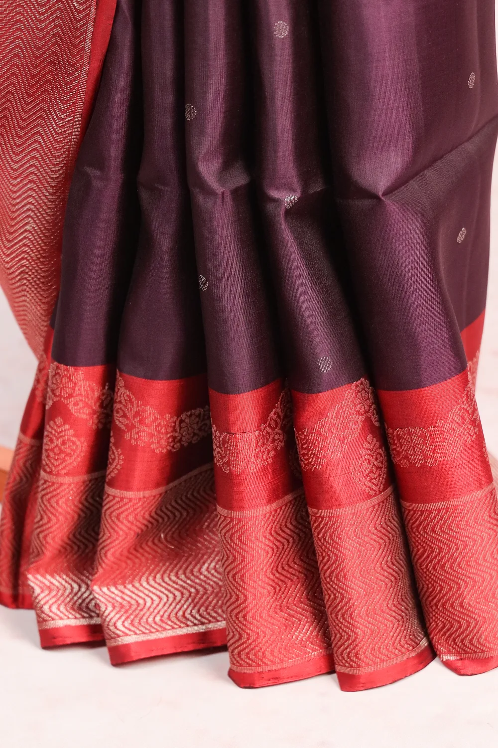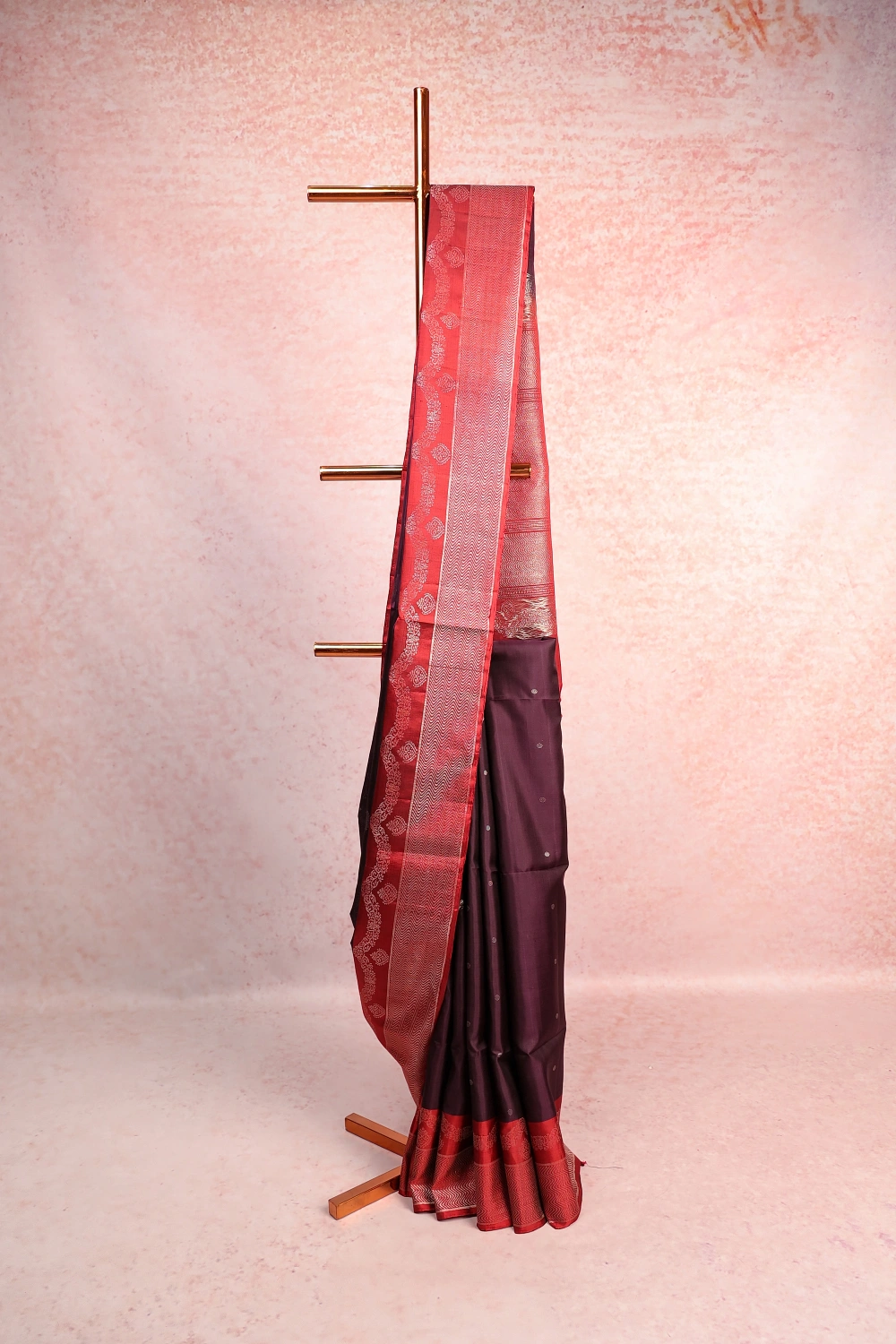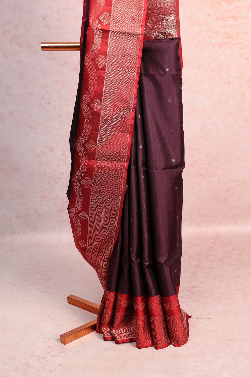 Dark Wine Kancheepuram Soft Silk Butta Saree with Plain Border. Includes Un stitched Blouse
