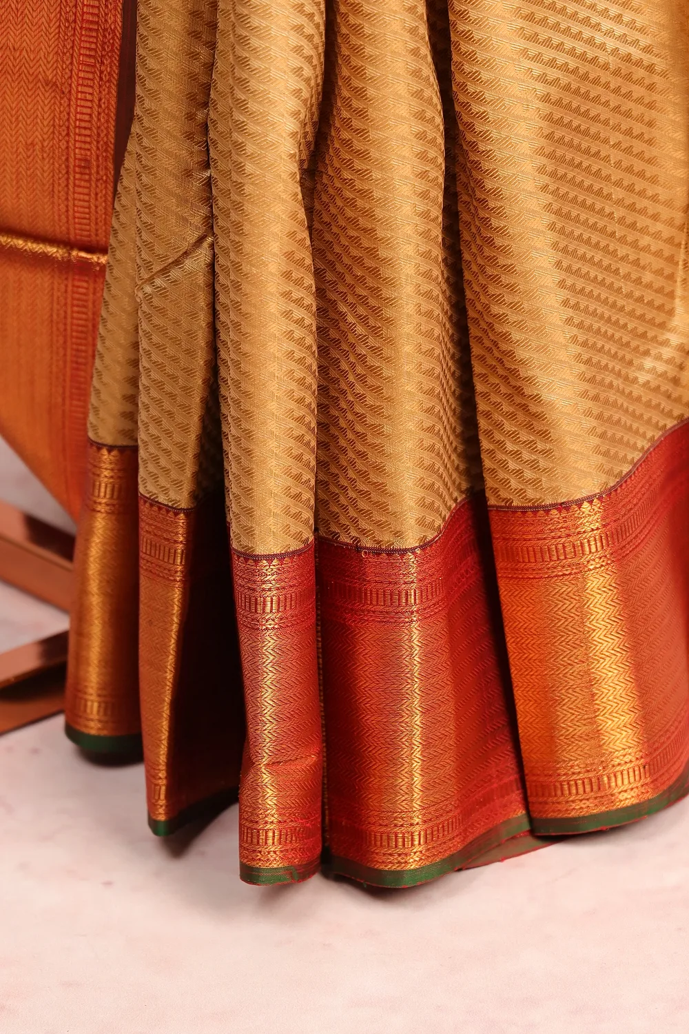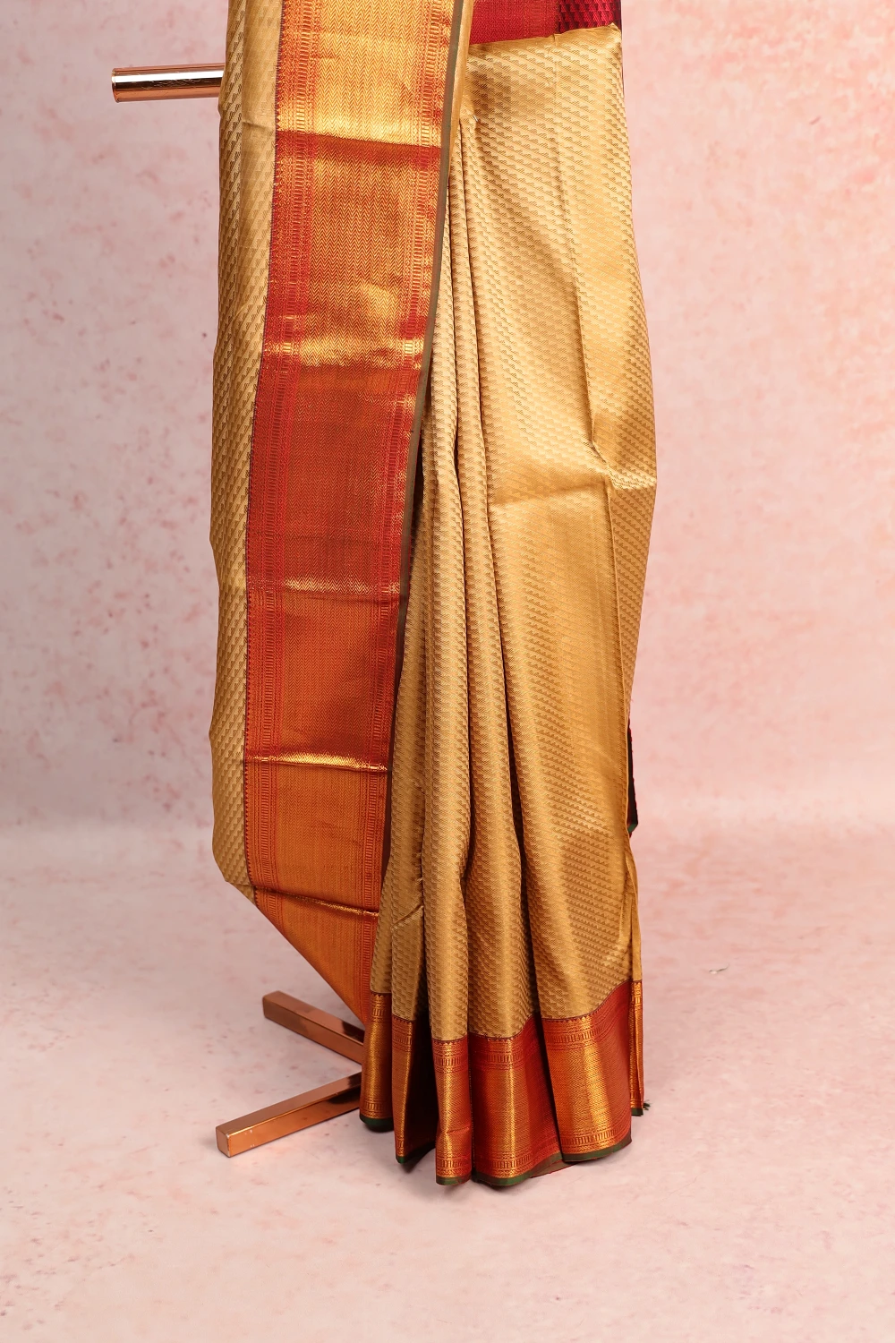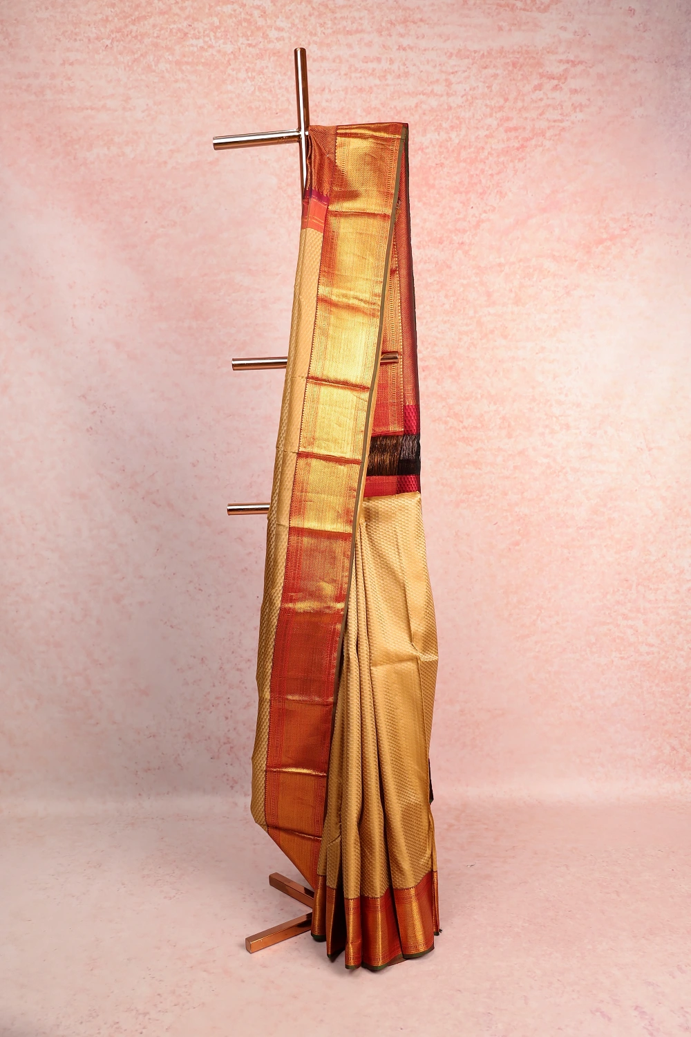 Gold Kancheepuram Self Design Saree With Contrast Border. Includes Un Stitched Blouse
