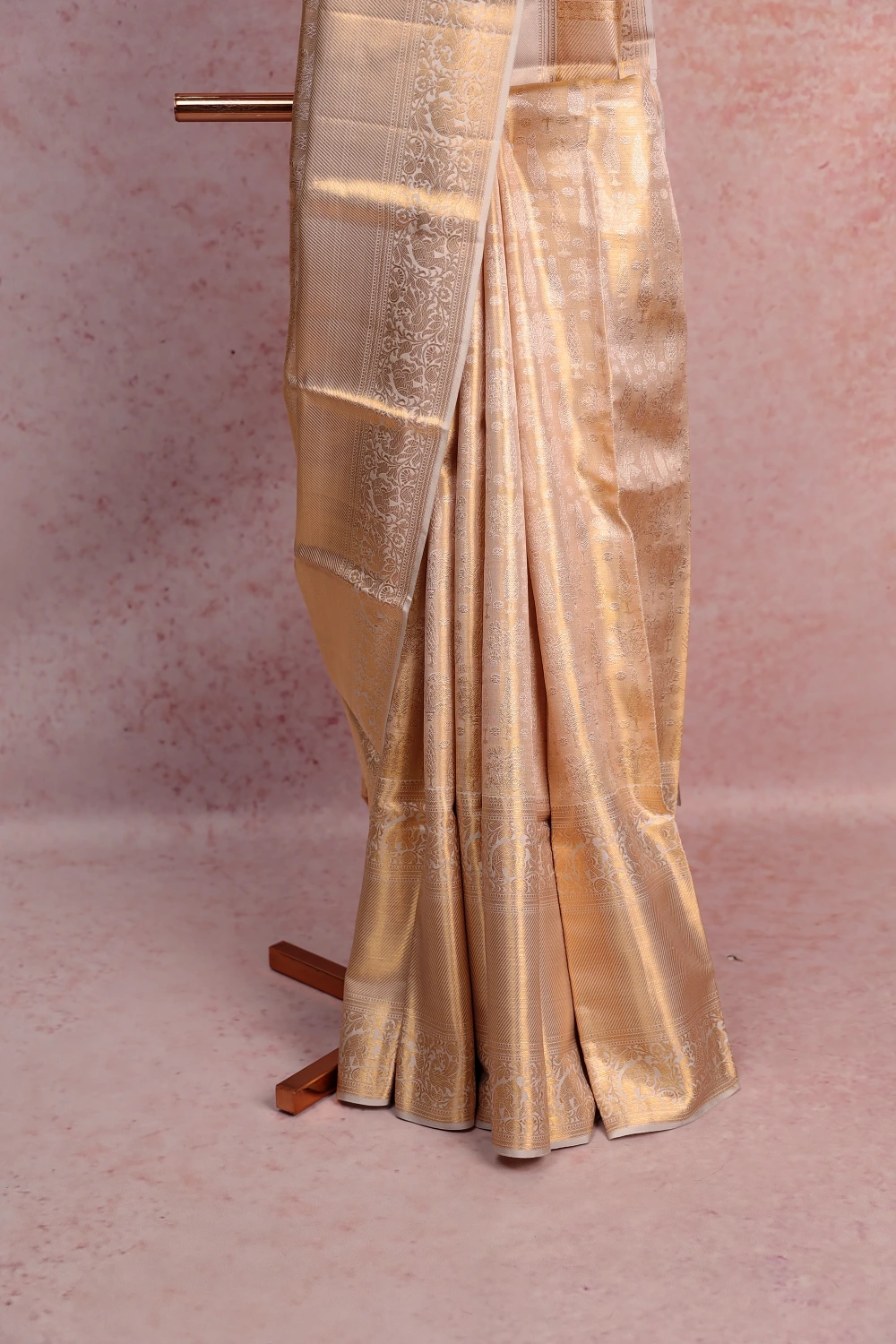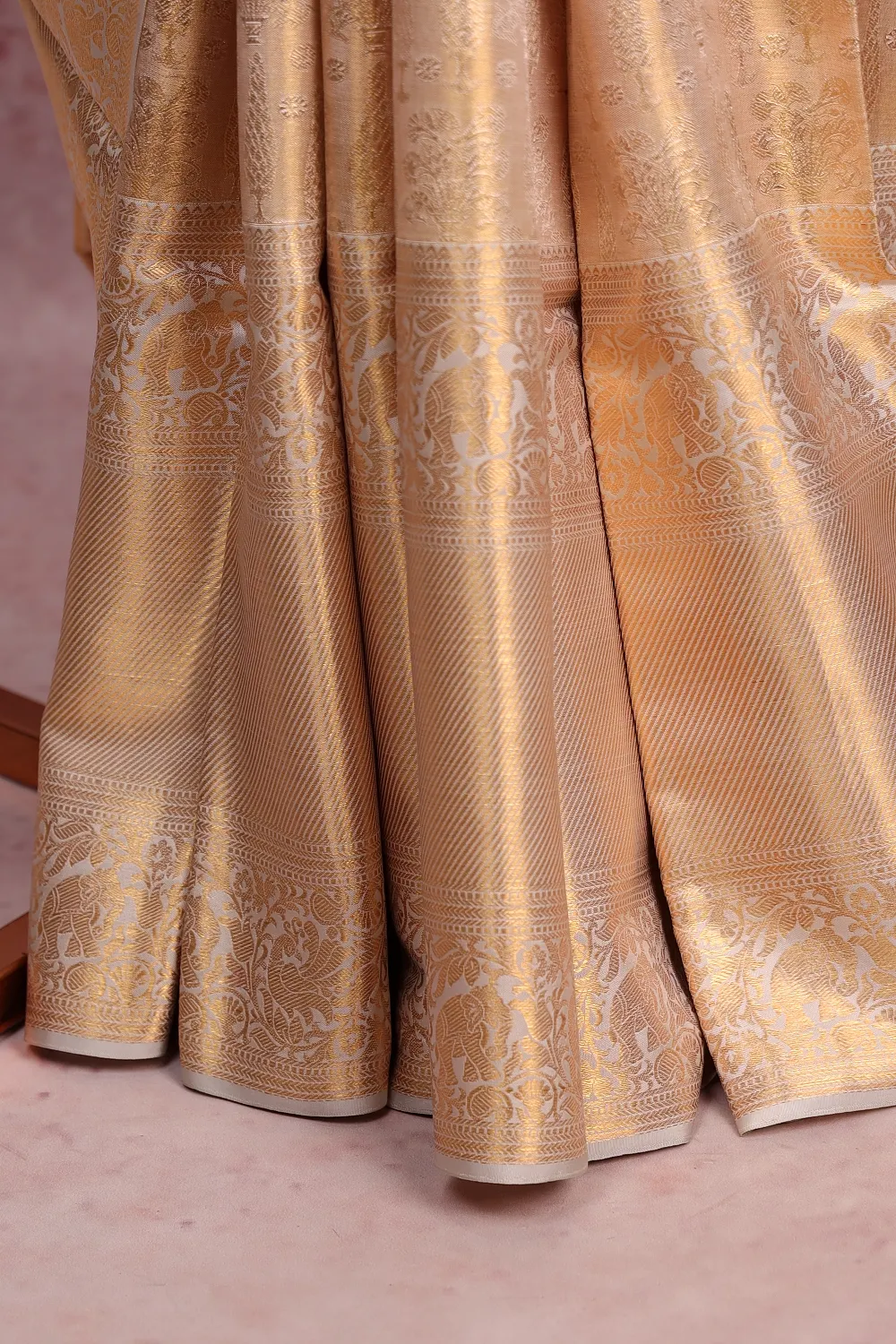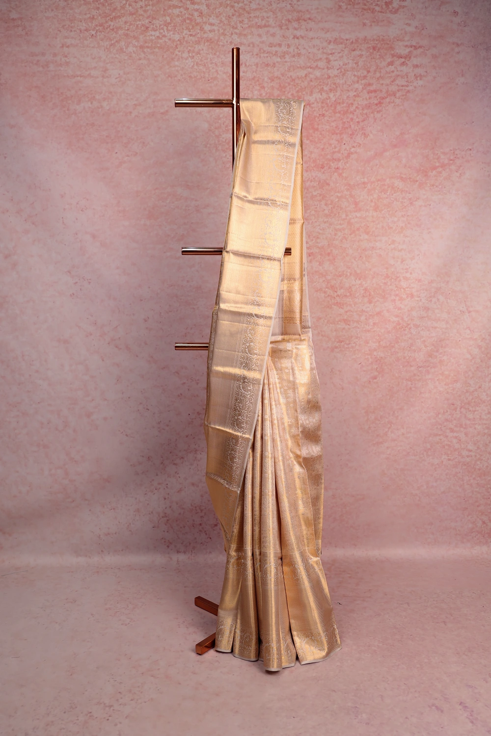 Gold Kancheepuram Silk Brocade Saree with Designer Border. Includes Unstitched Blouse