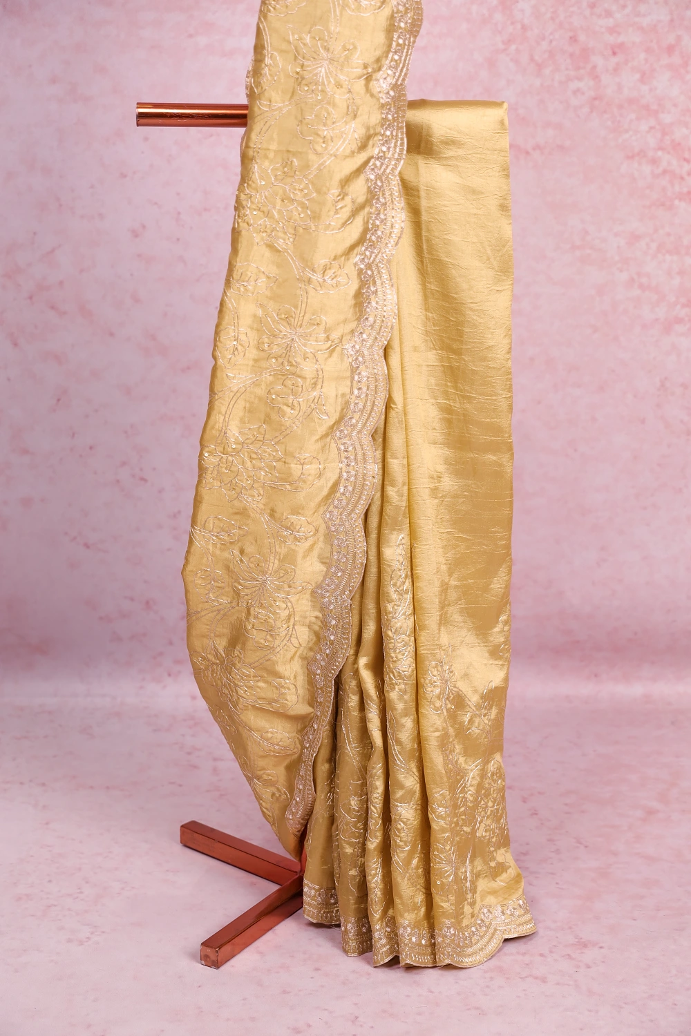 Gold Organza Plain Saree with Scallop Border. Includes Unstitched Blouse