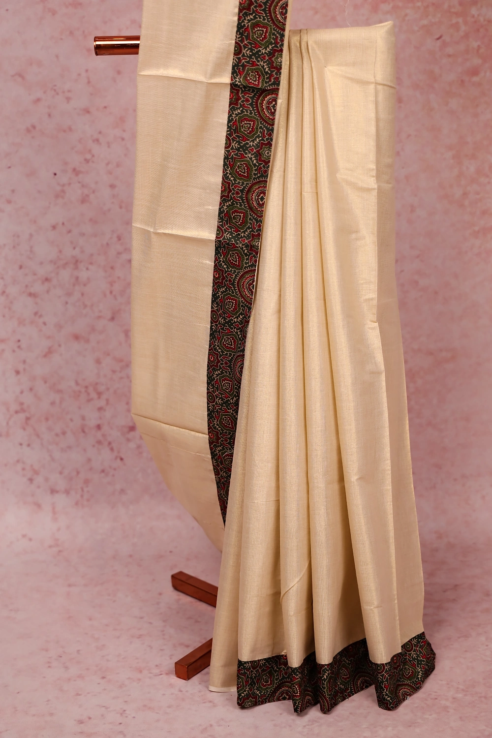 Gold Semi Tissue Kerala Plain Body Saree with Printed Border. Includes Unstitched Blouse.