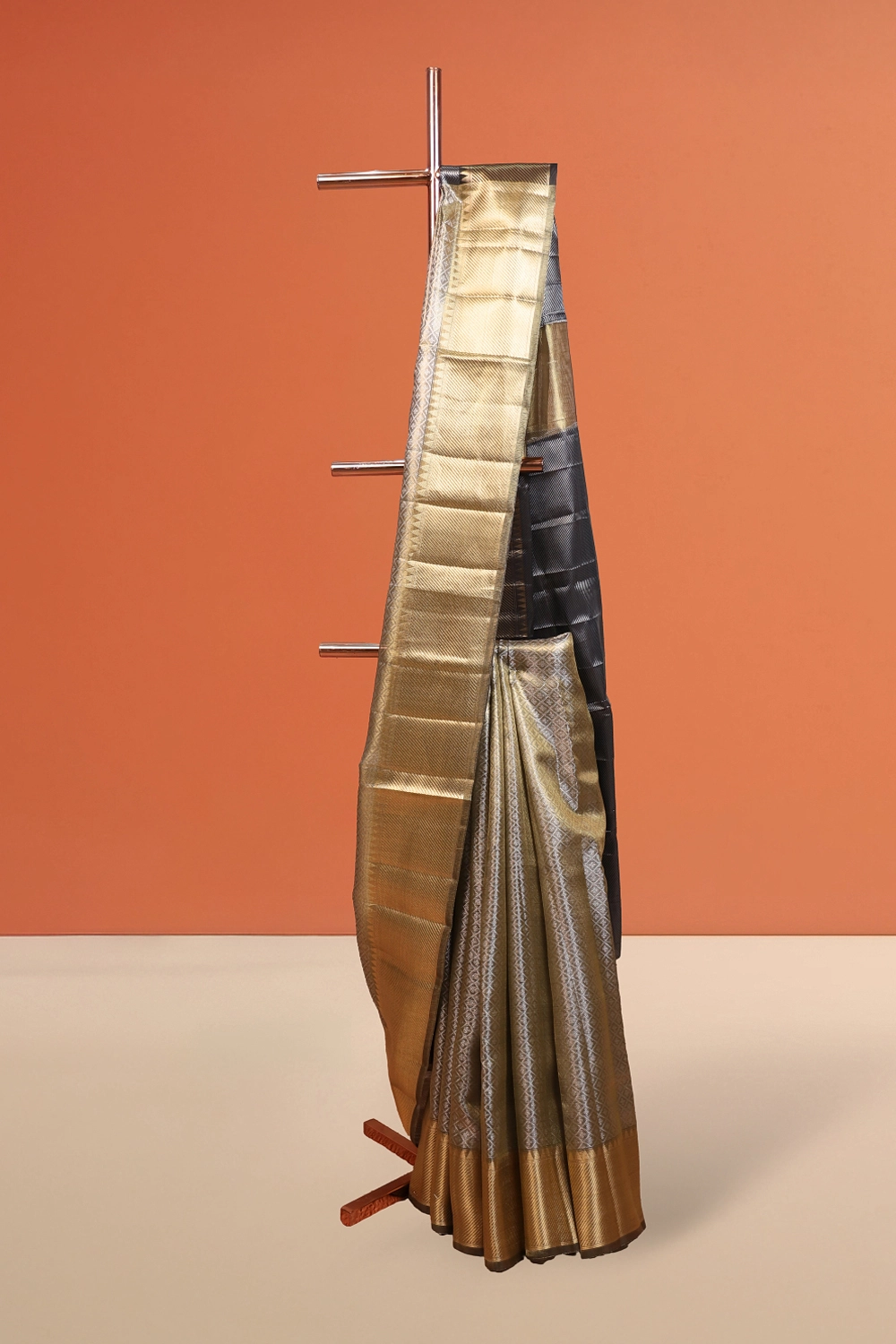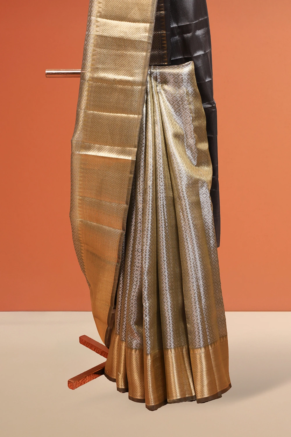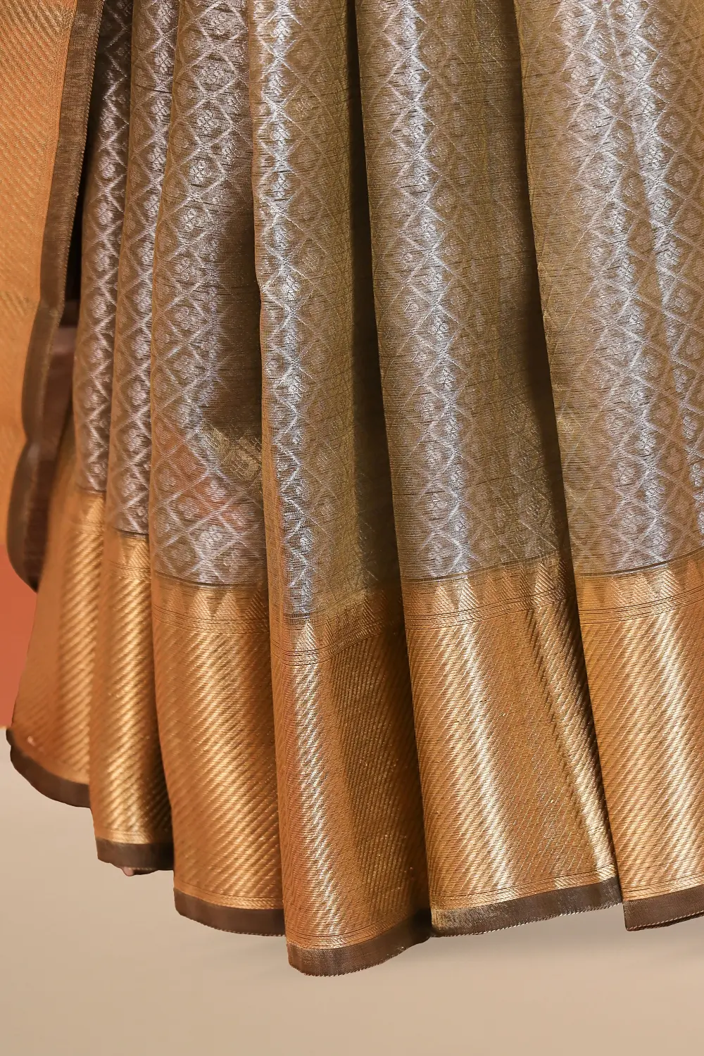 Gold Silver Semi Tissue Self Design Saree With Designer Border. Includes Unstitched Blouse