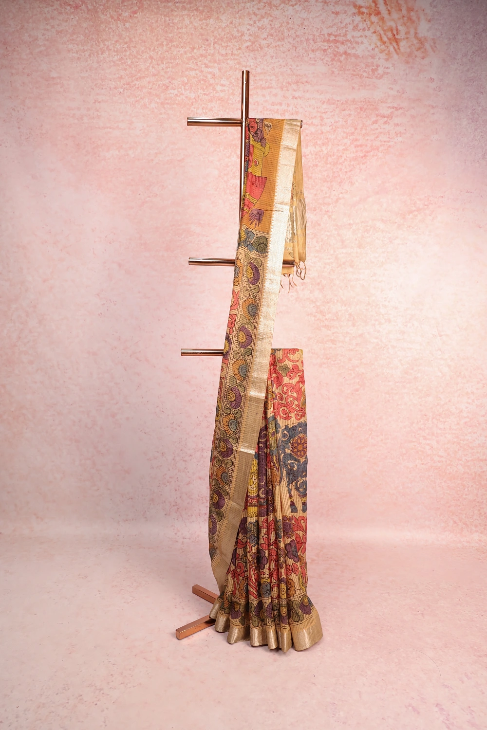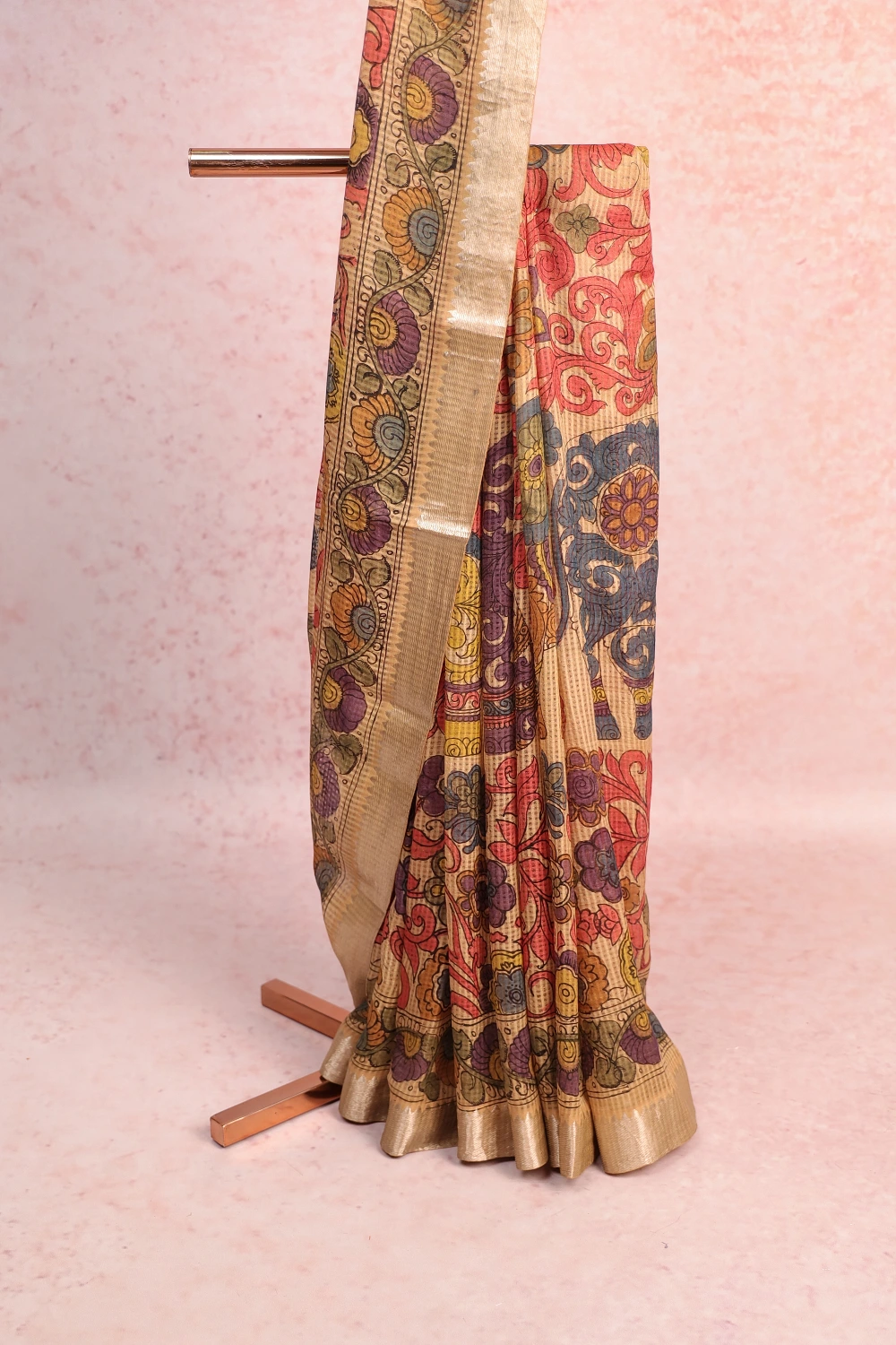 Gold Soft Cotton Kalamkari Printed Saree with Designer Border. Includes Unstitched Blouse