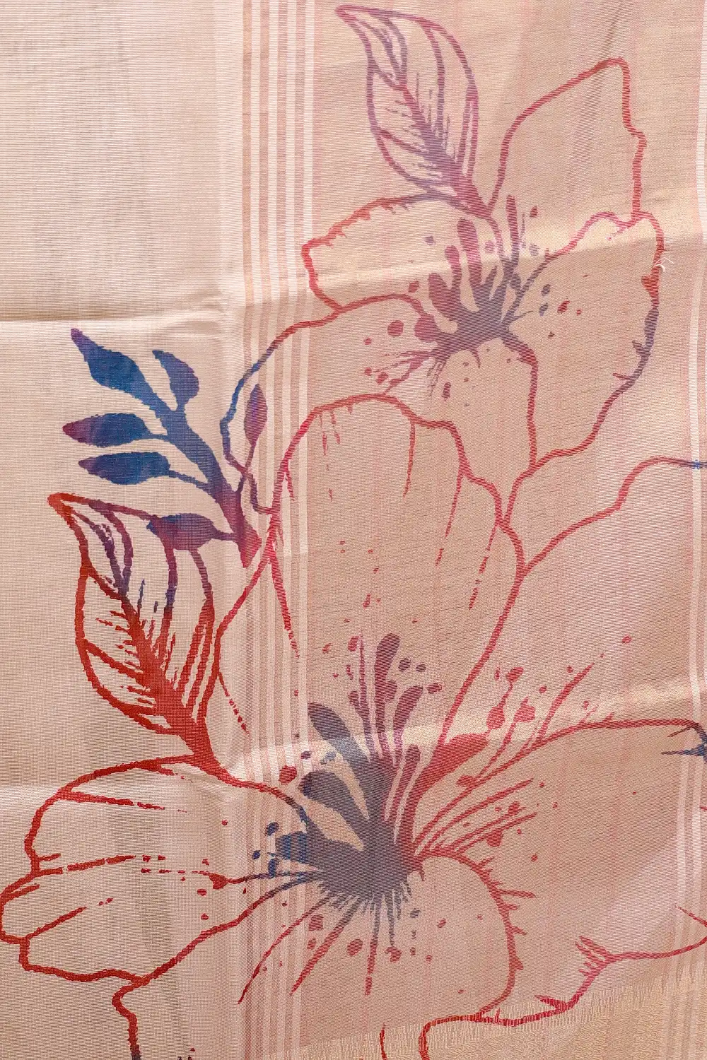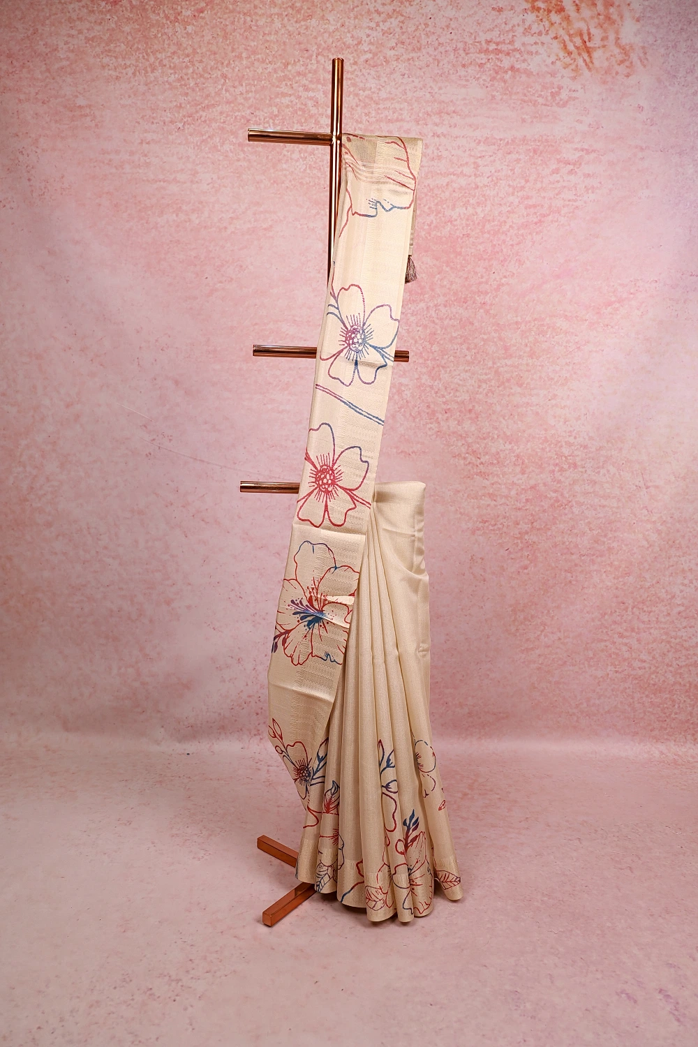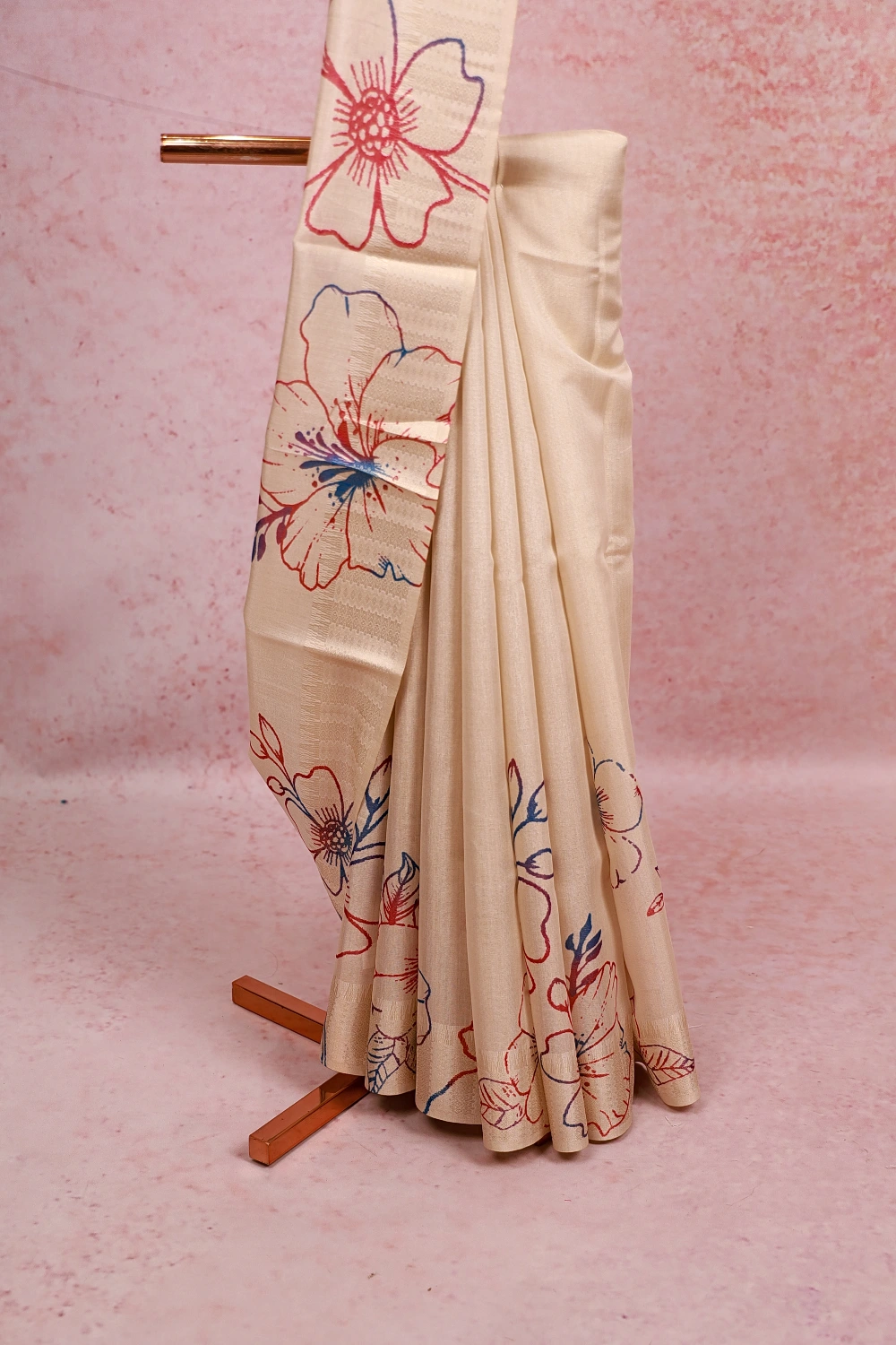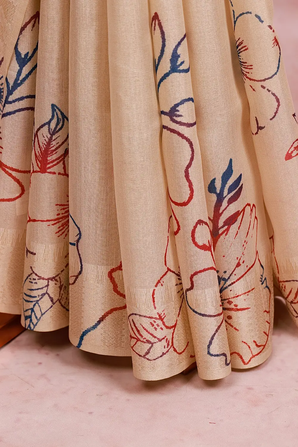 Gold Tissue Kerala Floral Print Saree with Zari Border. Includes Unstitched Blouse