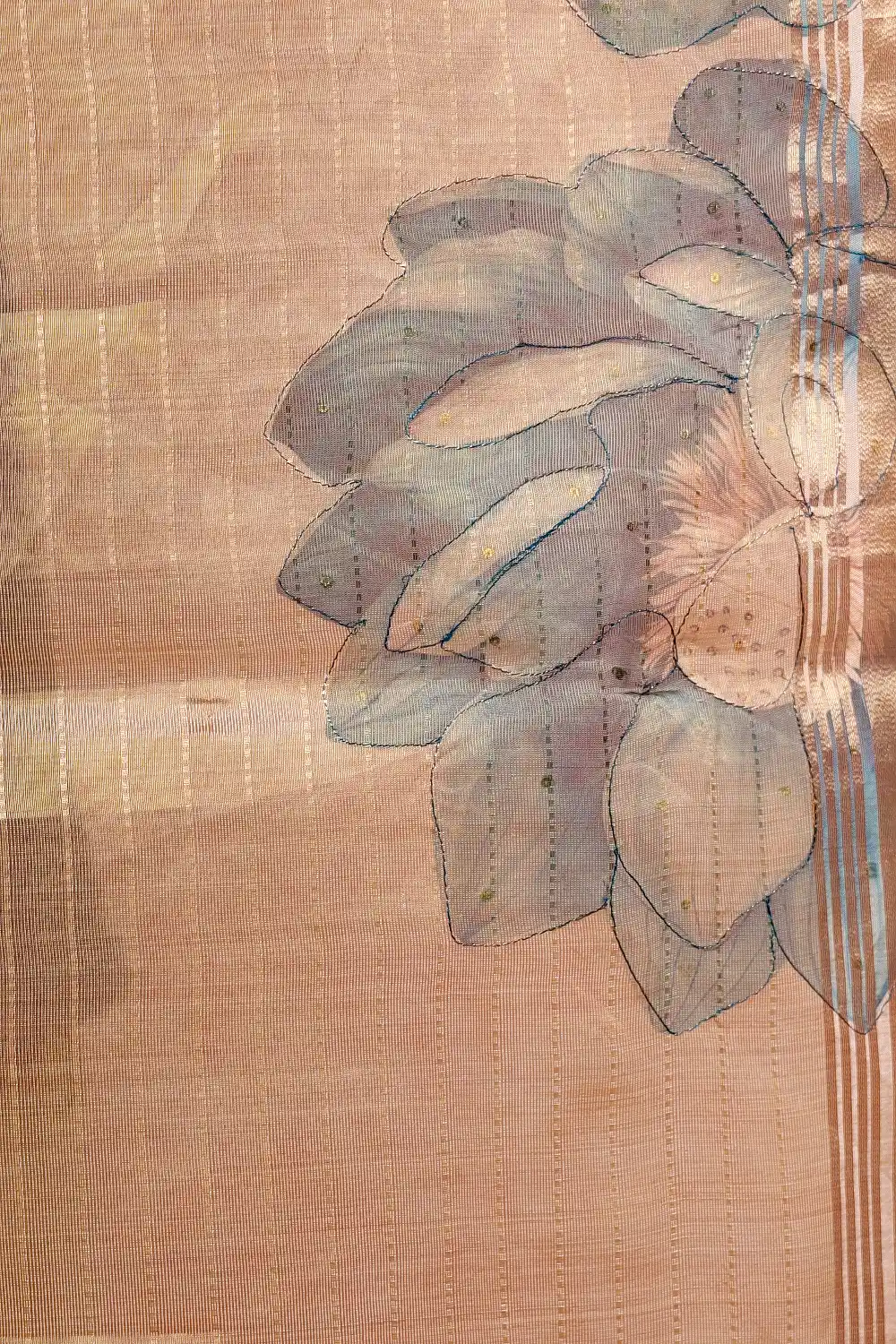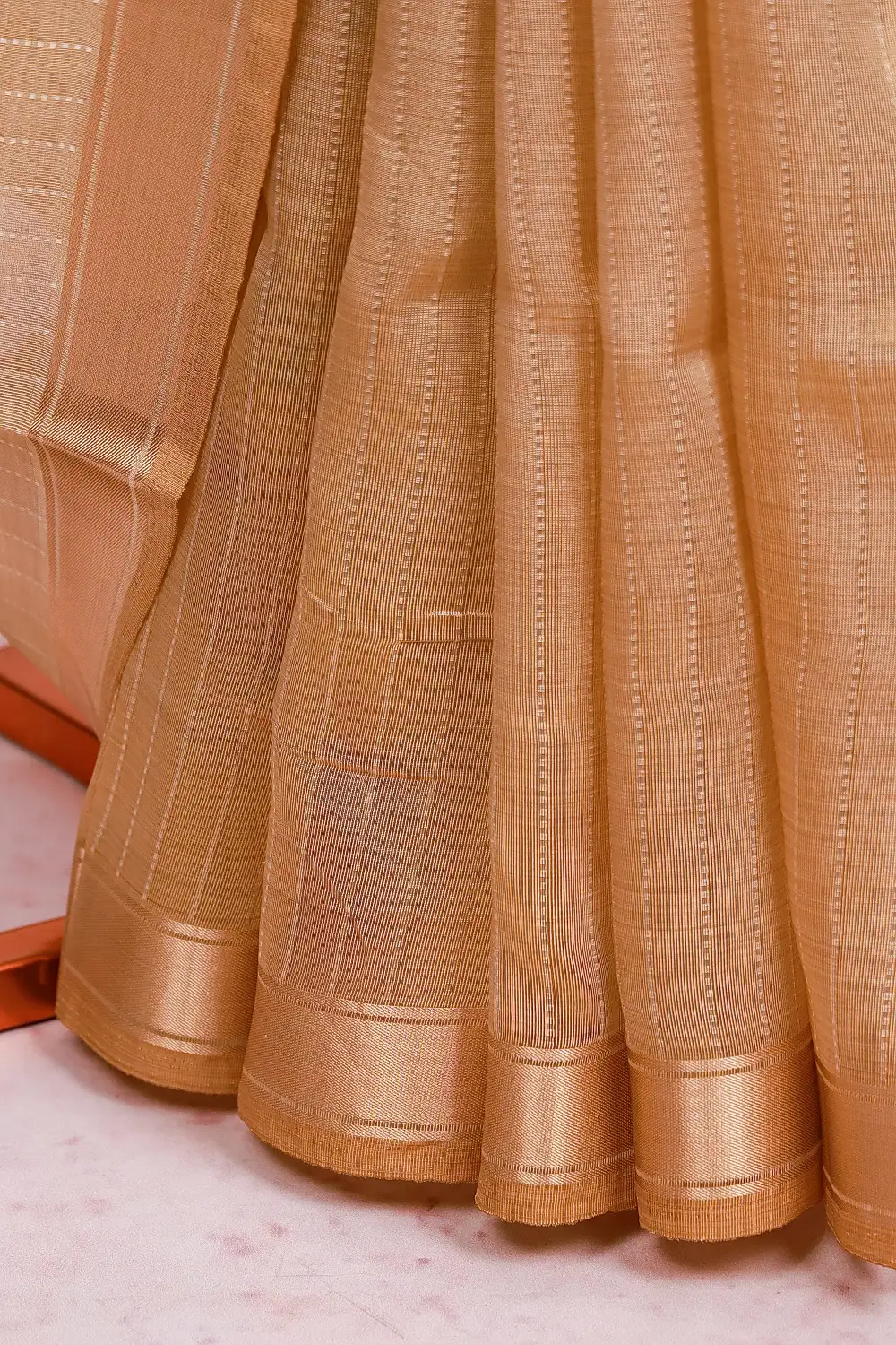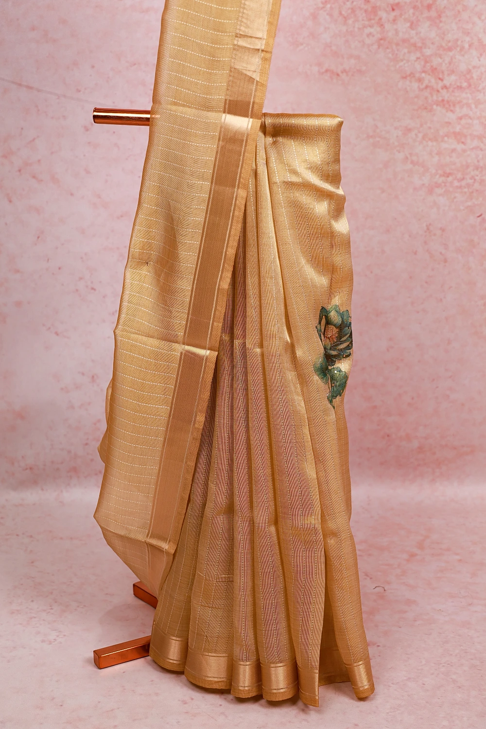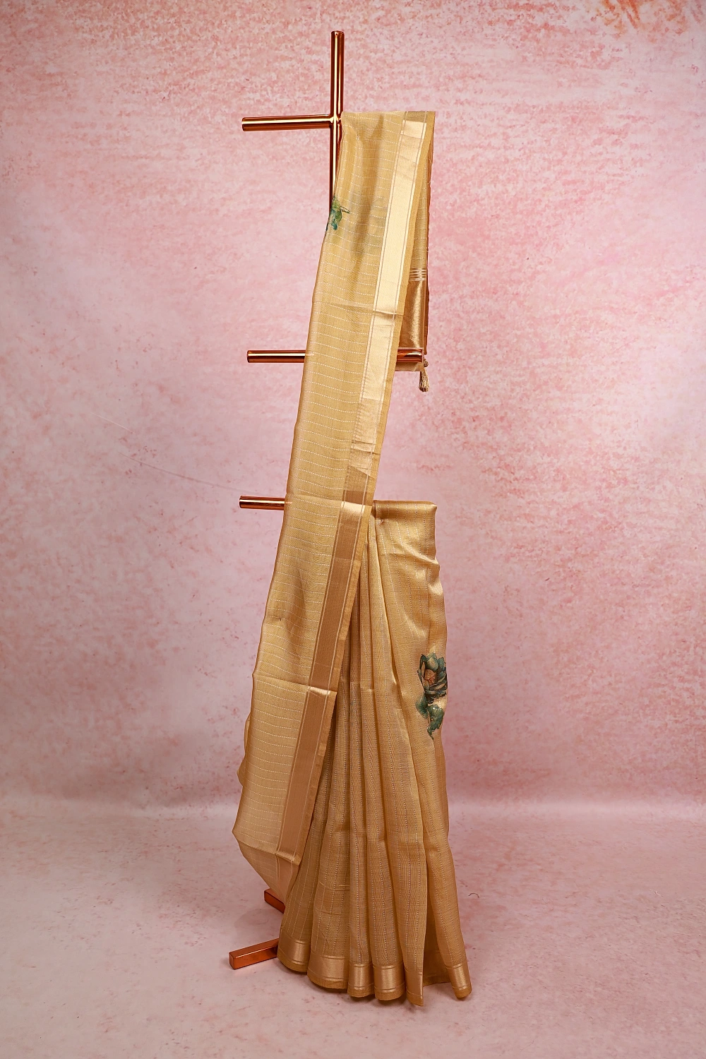Gold Tissue Kerala Lines With Floral Print Saree with Zari Border. Includes Unstitched Blouse